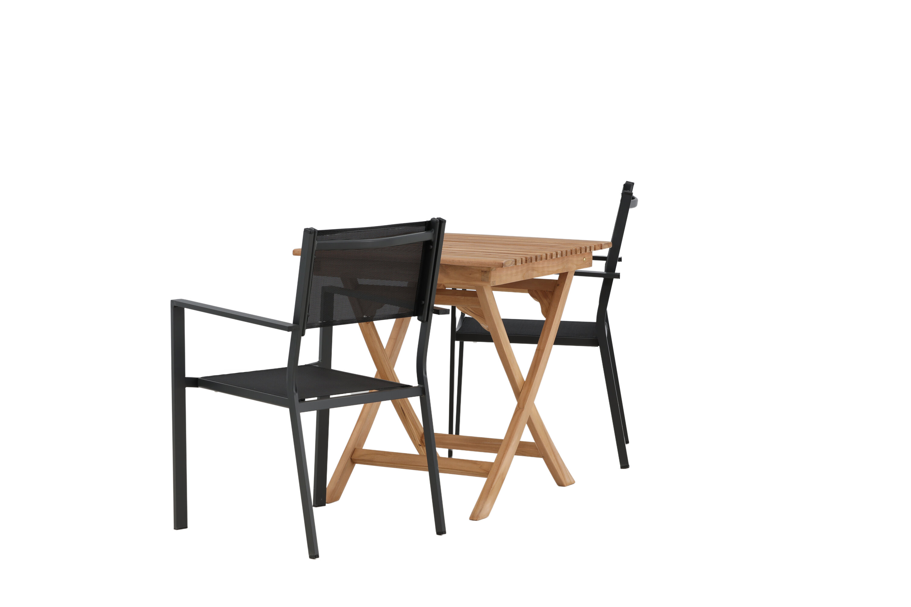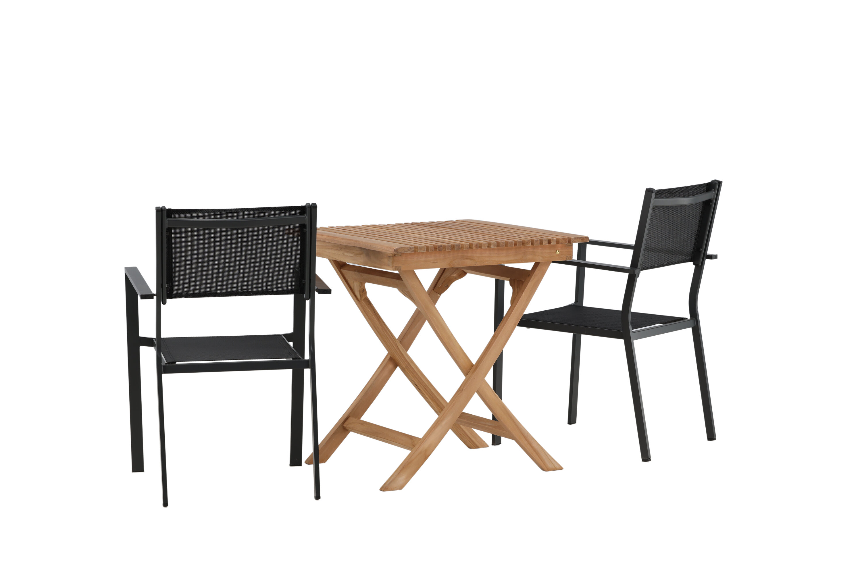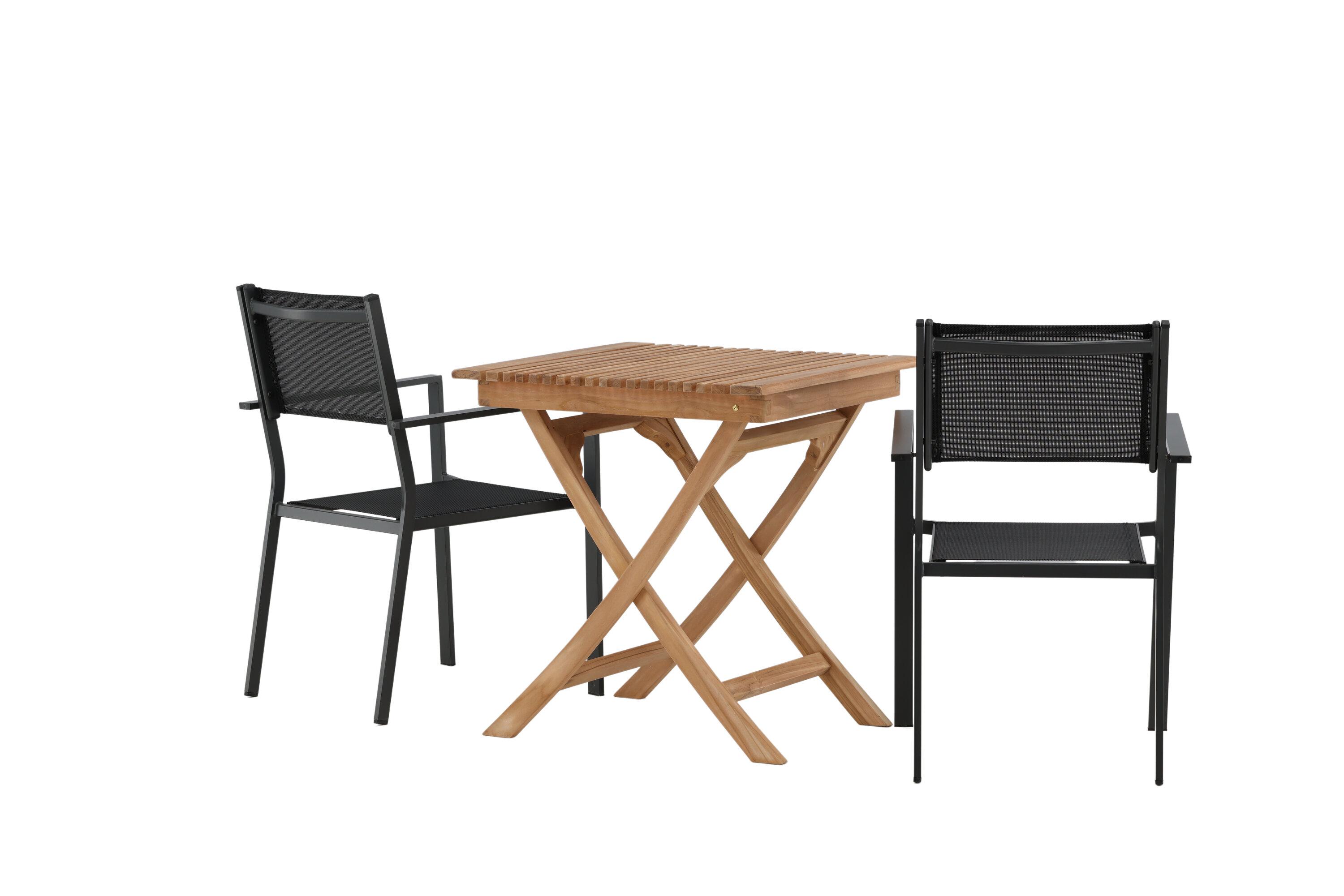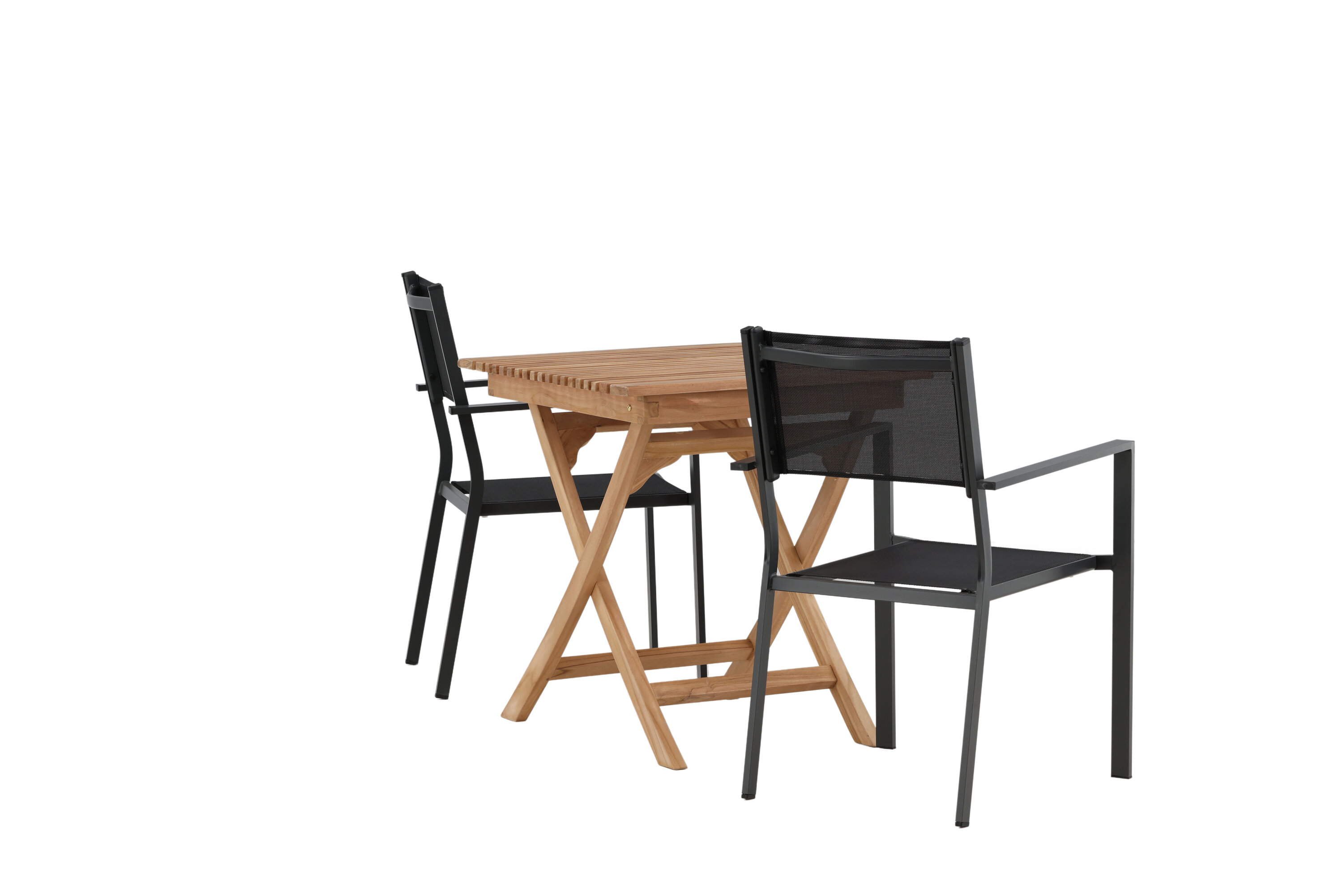 Stilvoll, smart und minimalistisch - ein Café, das den Sommer vergoldet! Esstisch Ghana hat ein hübsches Design in wunderschönem Teakholz und ist für praktische Aufbewahrung und Bewegung zusammenklappbar. Hier zusammen mit stapelbaren Stühlen aus der Copacabana-Serie in Black Textilene. Die Stühle haben gerade nordische Formen und einen weichen Komfort. Erstelle einen einladenden Ort auf deiner Terrasse!