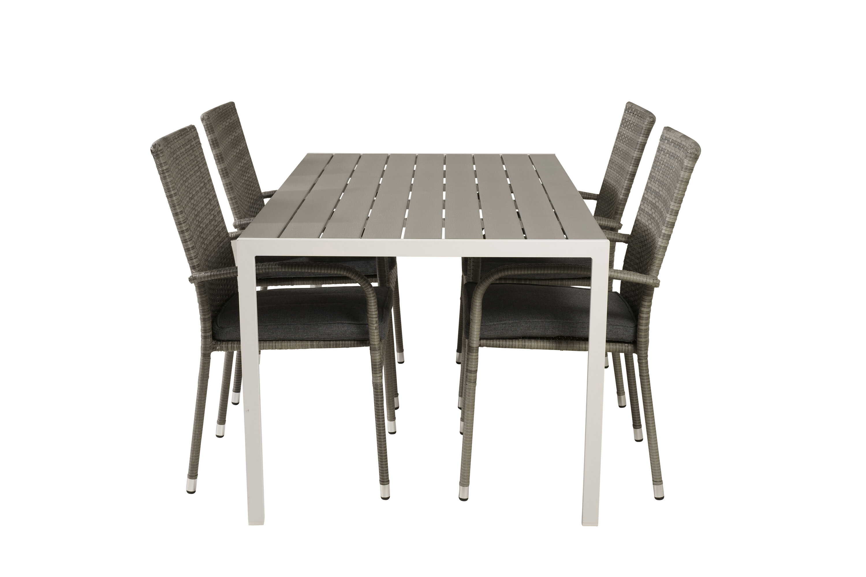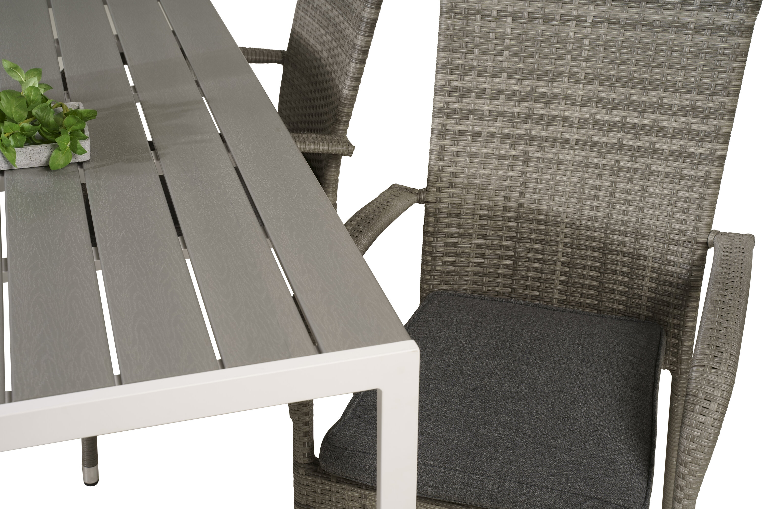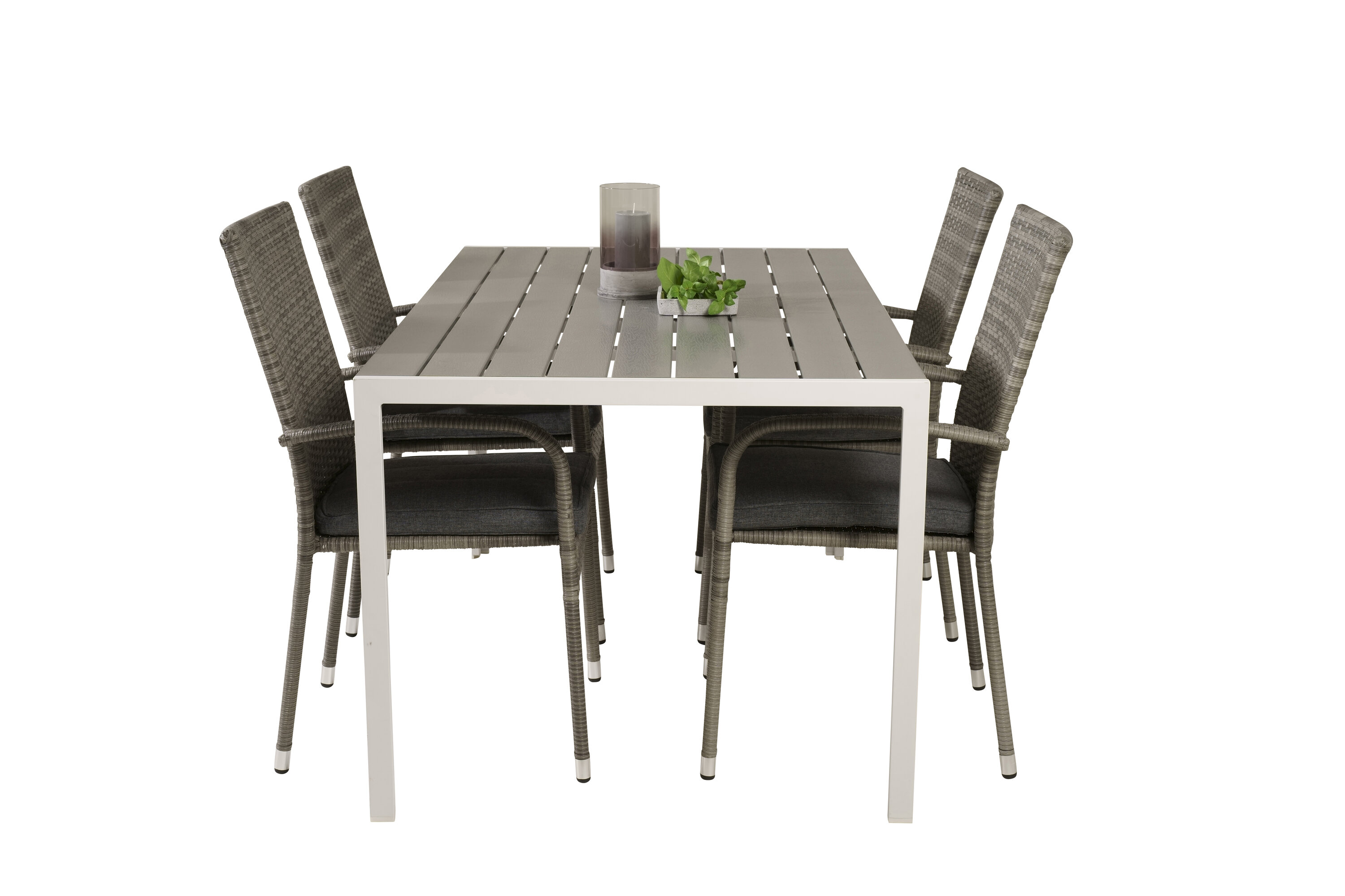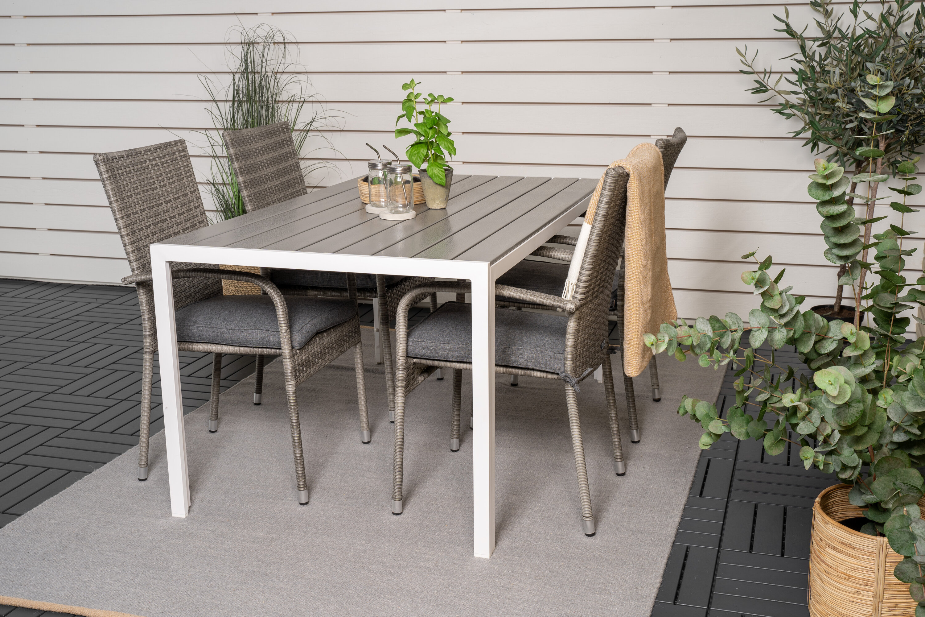 Esstisch Pause in schlankem Design, dazu Esszimmerstühle Anna - die perfekte Kombination für alle, die eine trendige Essensgruppe auf der Terrasse suchen. Der hohe Sitzkomfort der Stühle lädt zu langen und wunderbaren Momenten der Geselligkeit ein!