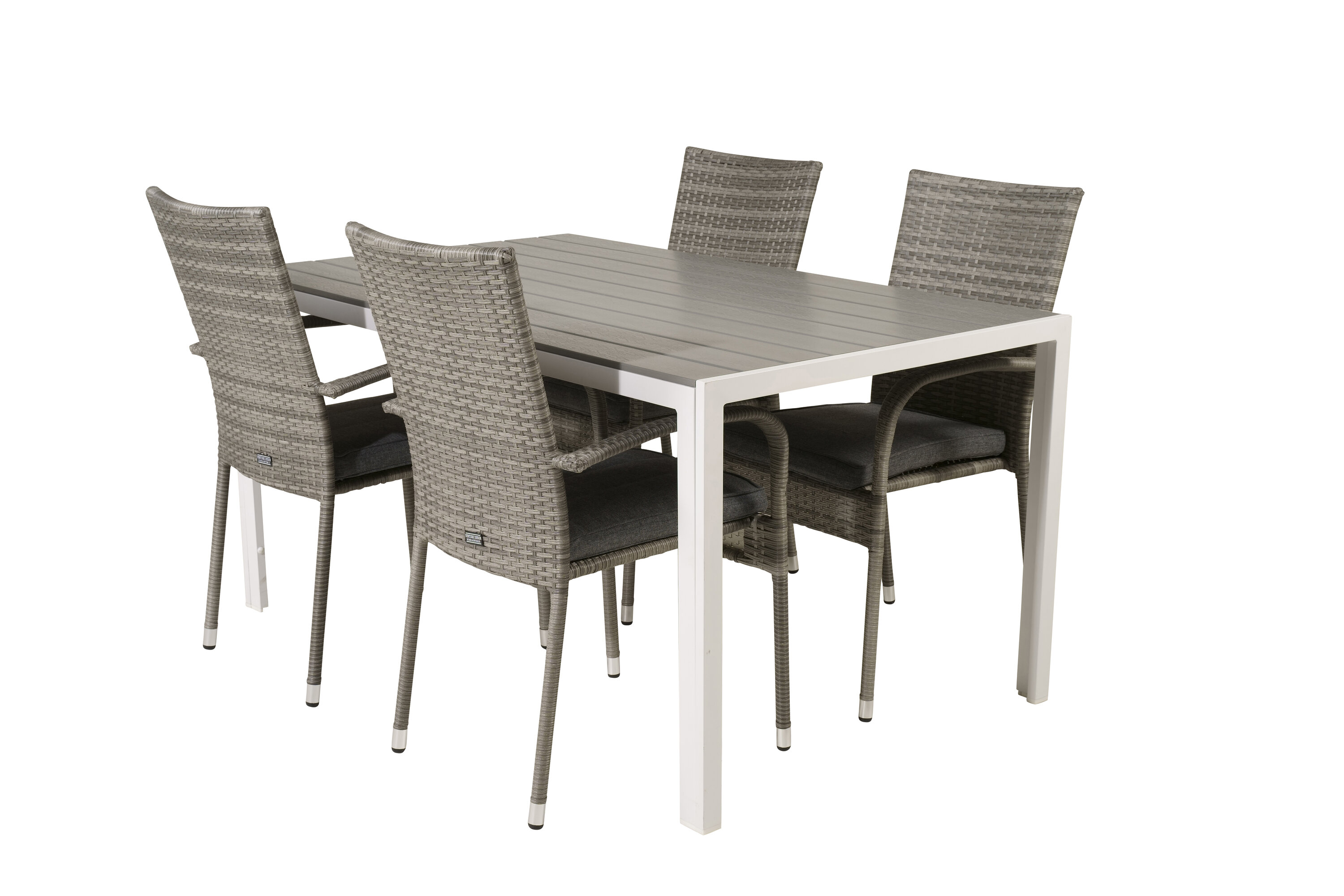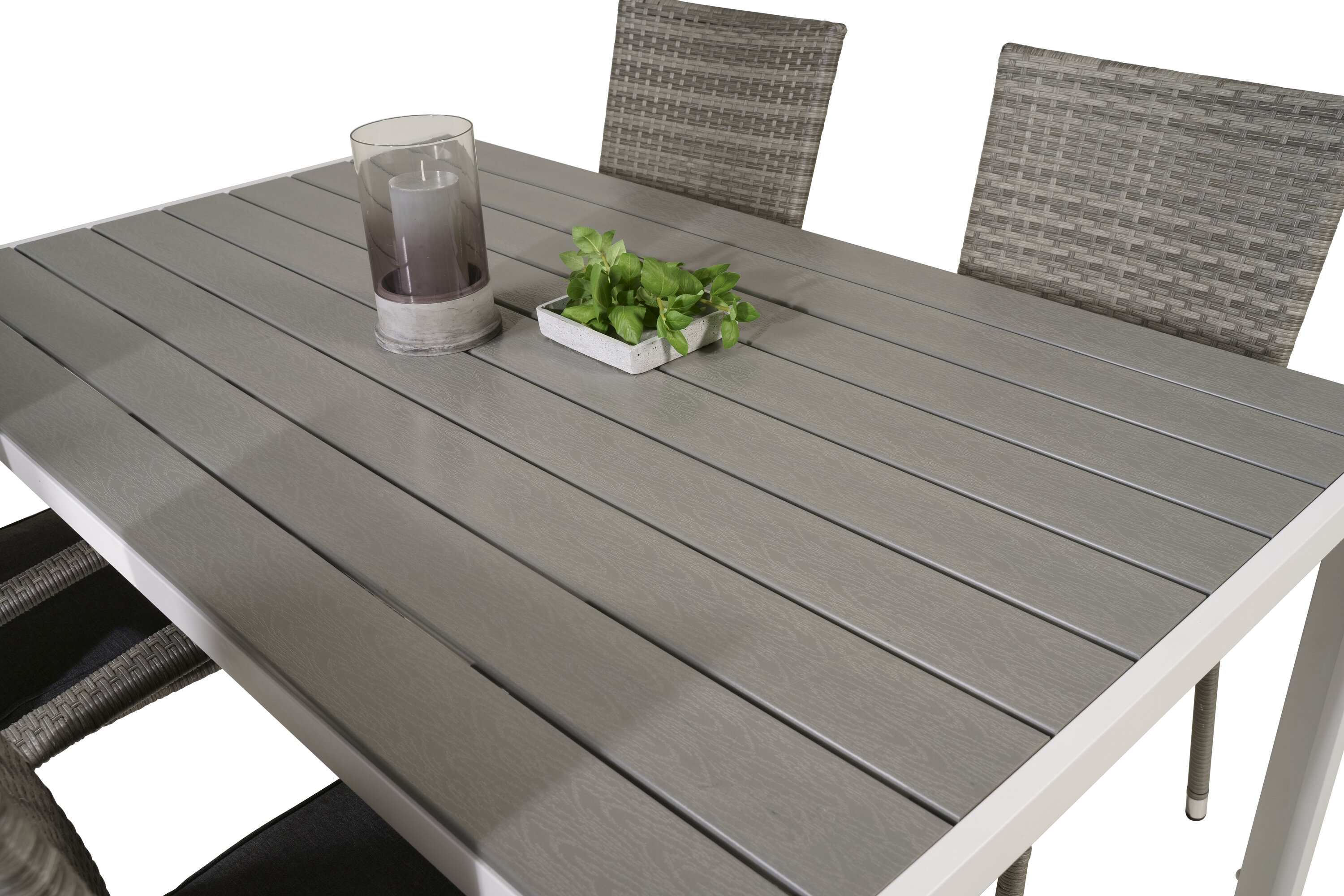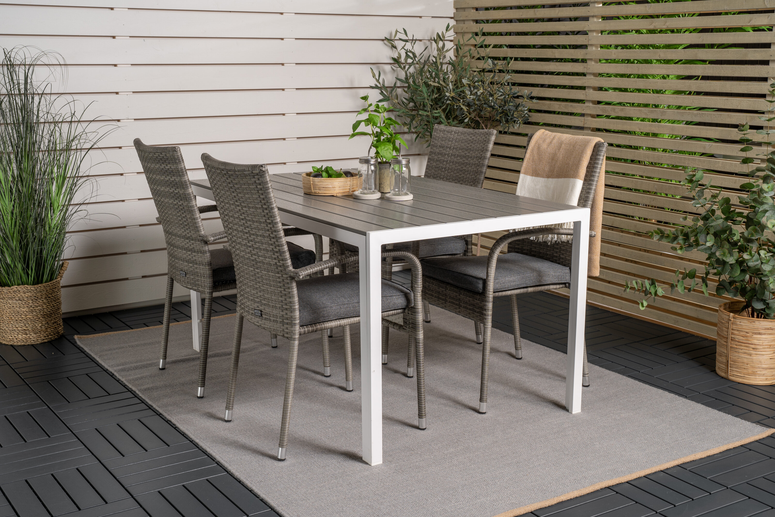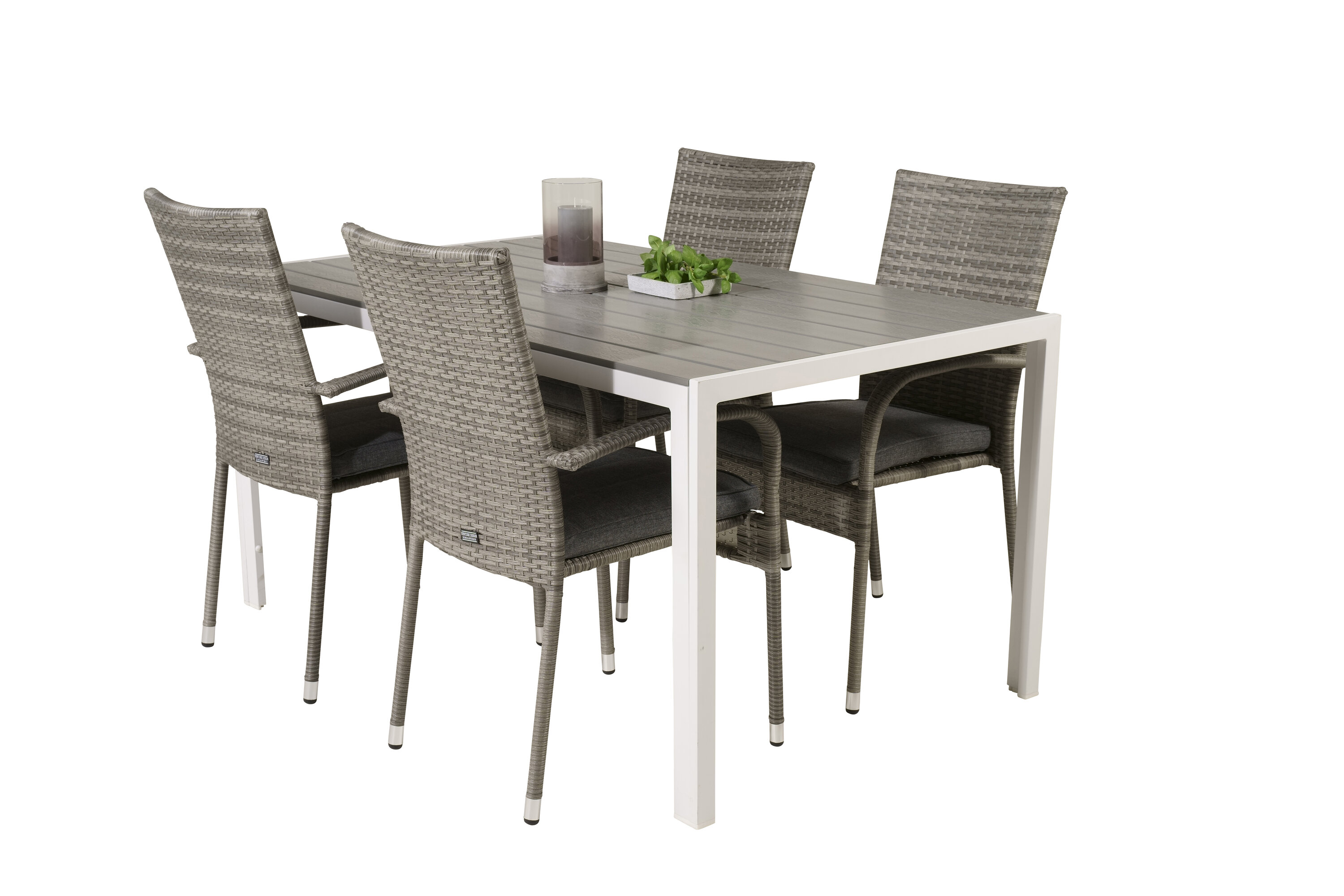 Esstisch Pause in schlankem Design, dazu Esszimmerstühle Anna - die perfekte Kombination für alle, die eine trendige Essensgruppe auf der Terrasse suchen. Der hohe Sitzkomfort der Stühle lädt zu langen und wunderbaren Momenten der Geselligkeit ein!