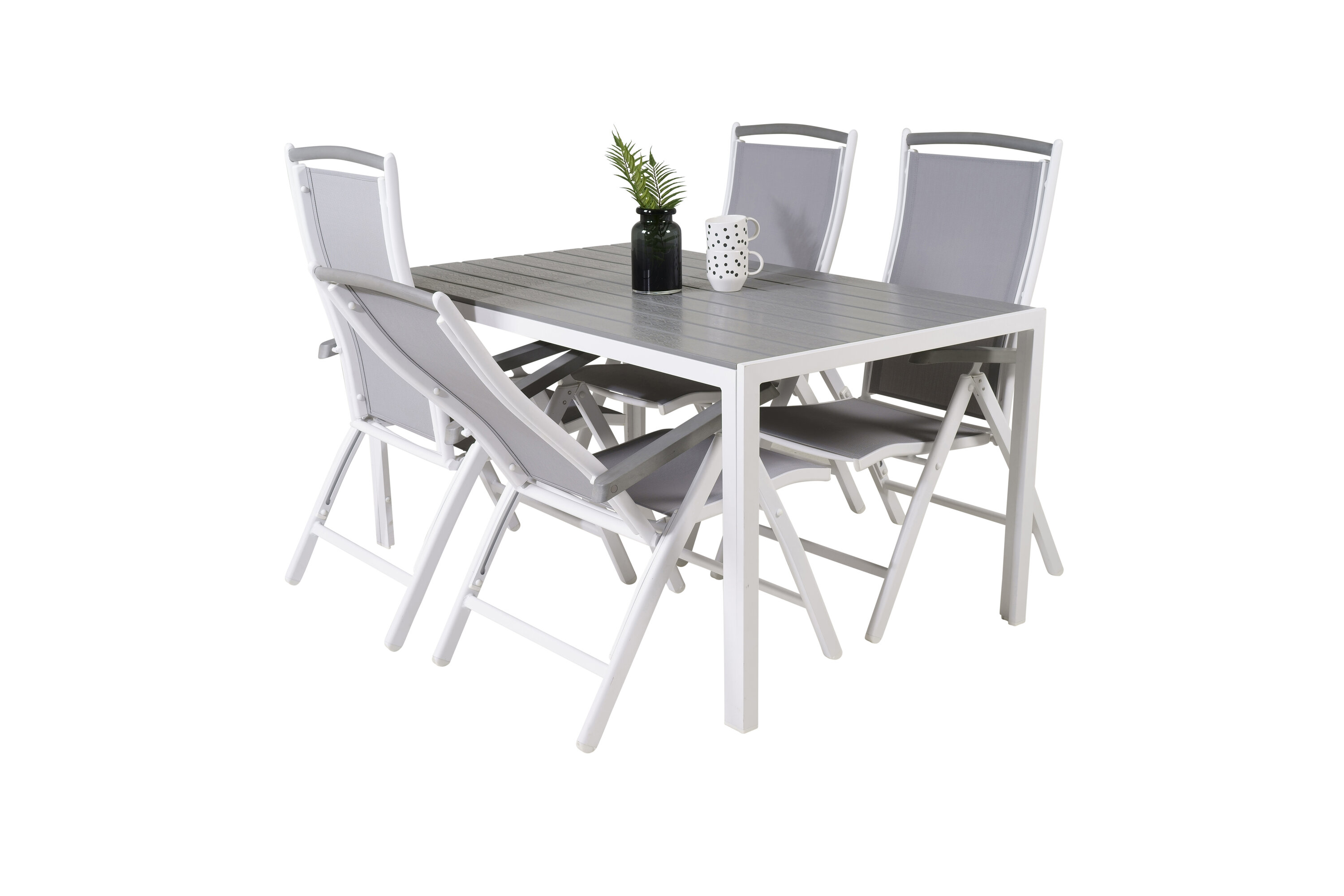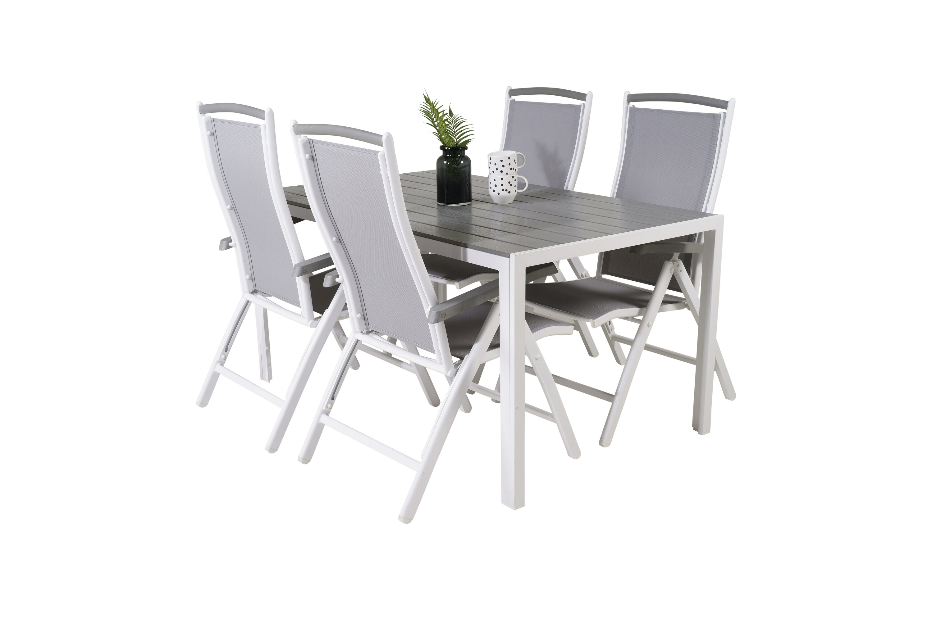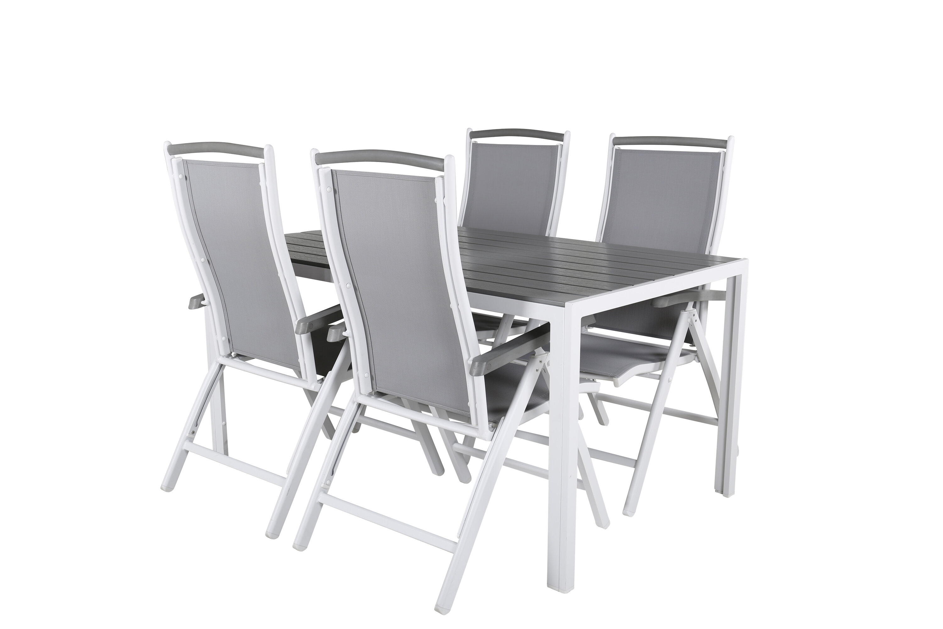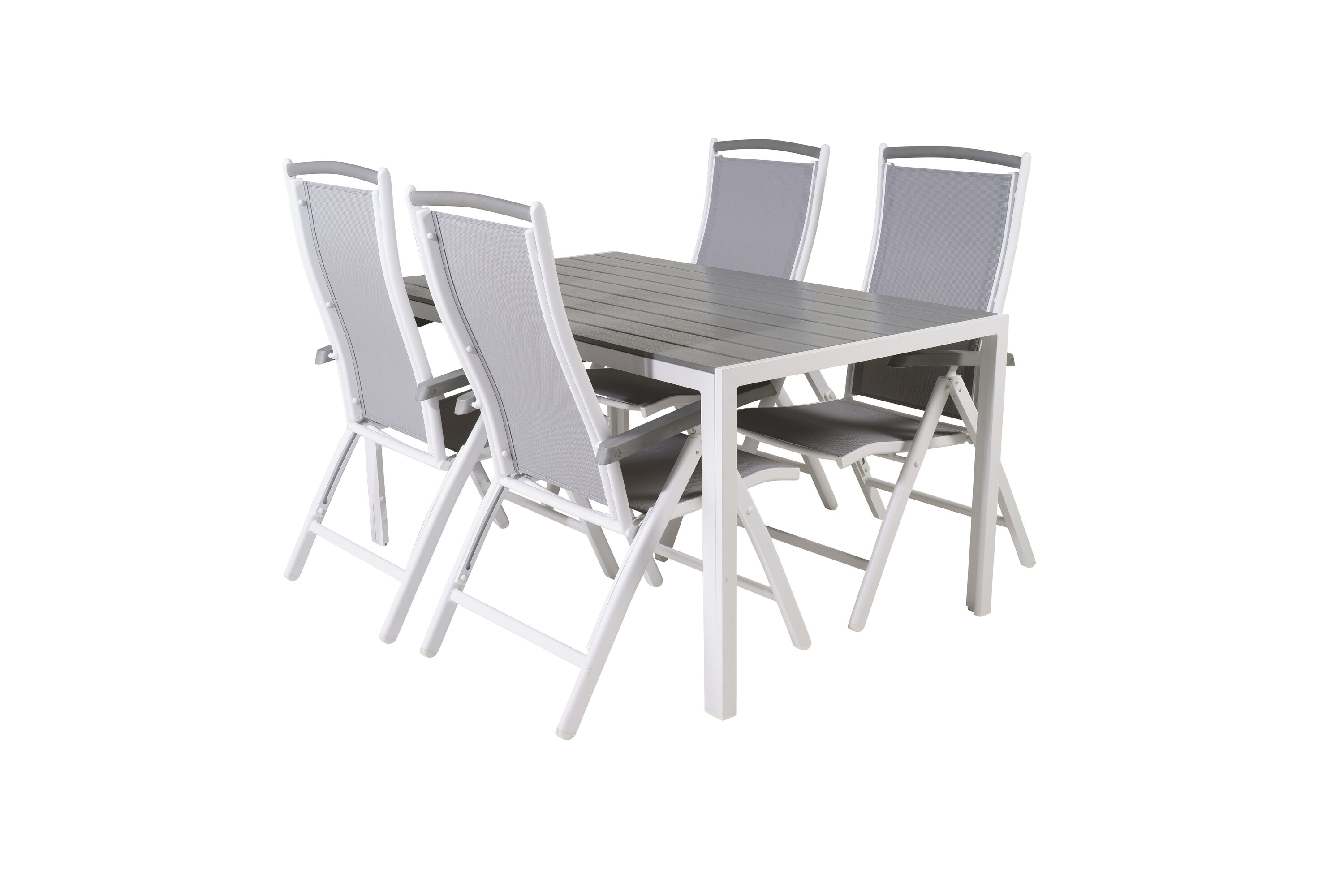 Eine moderne Lebensmittelgruppe in köstlichen Graustufen! Klassischer Esstisch ist sowohl trendfest als auch praktisch. Hier zusammen mit seinen freundlichen Esszimmerstühlen der Serie Albany mit klappbarer Rückenlehne. Versammeln Sie Familie und Freunde und genießen Sie warme Sommerabende auf der Terrasse!