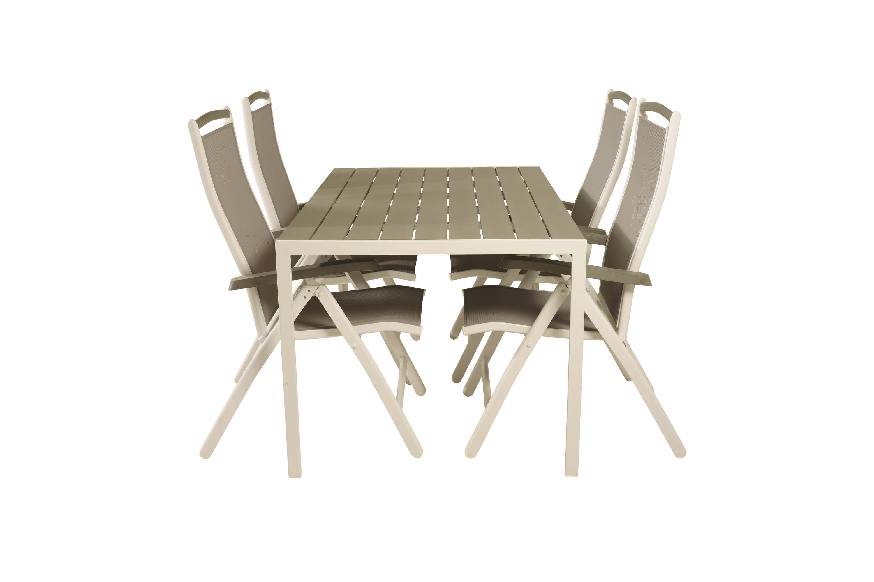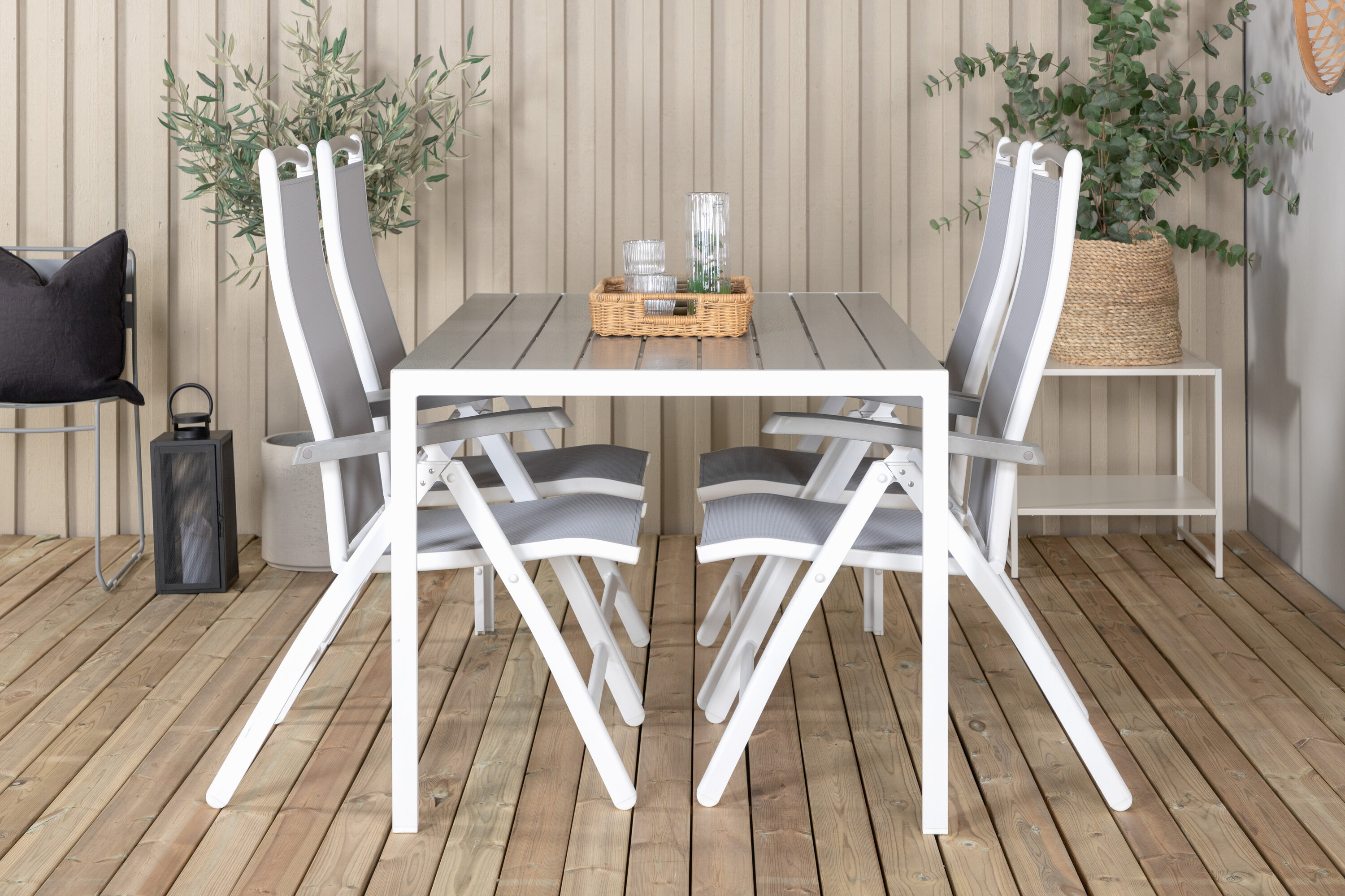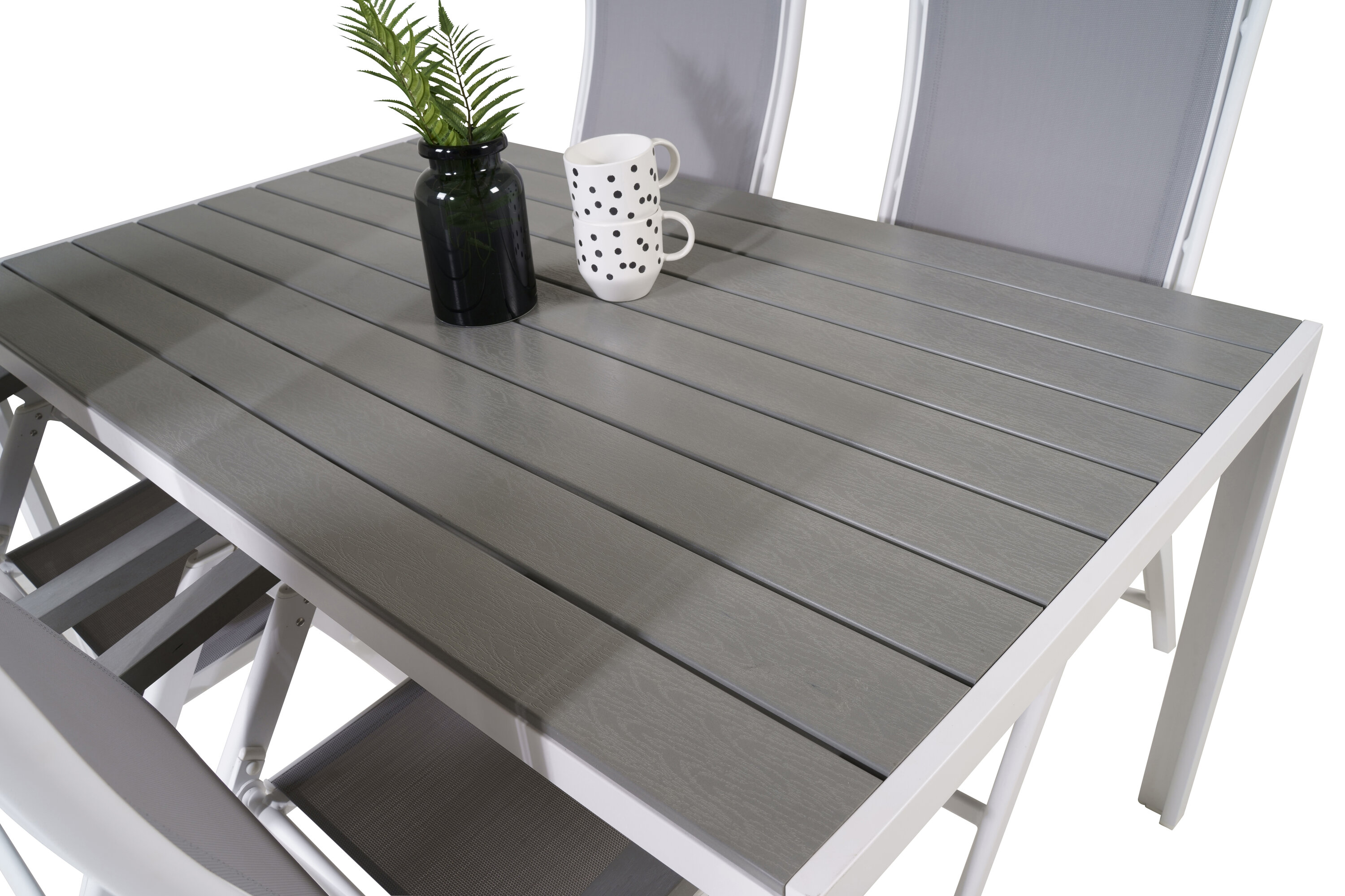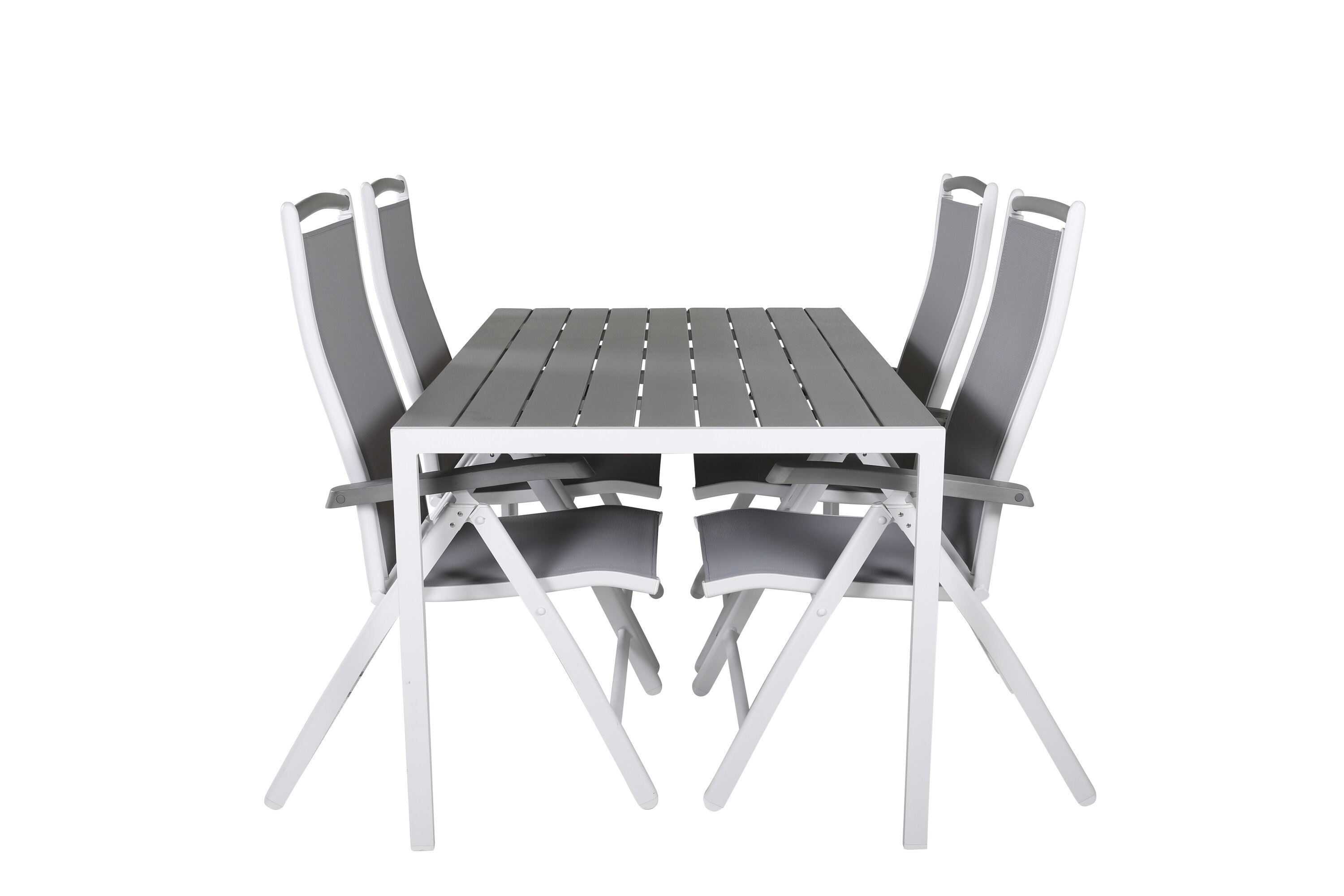 Eine moderne Lebensmittelgruppe in köstlichen Graustufen! Klassischer Esstisch ist sowohl trendfest als auch praktisch. Hier zusammen mit seinen freundlichen Esszimmerstühlen der Serie Albany mit klappbarer Rückenlehne. Versammeln Sie Familie und Freunde und genießen Sie warme Sommerabende auf der Terrasse!
