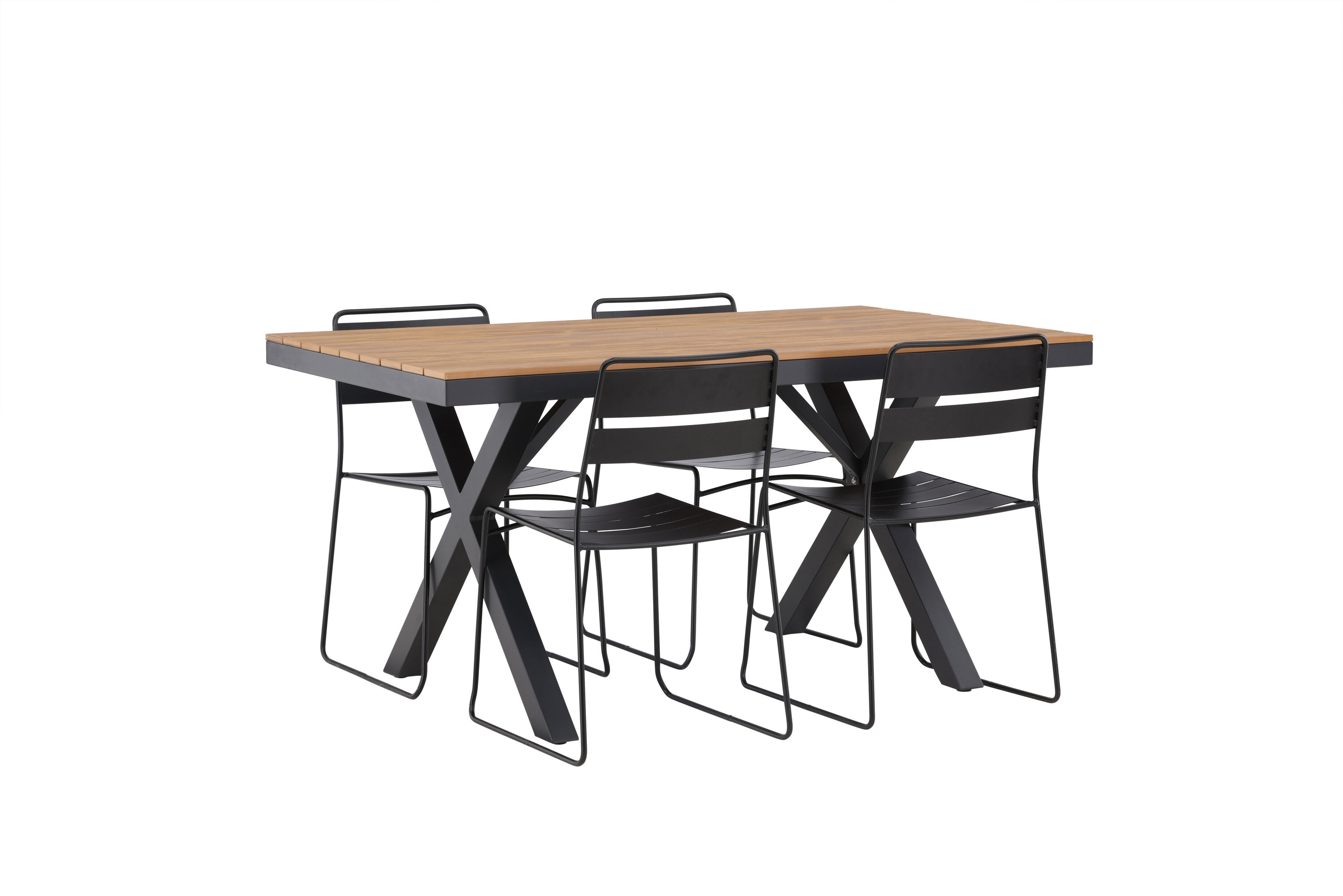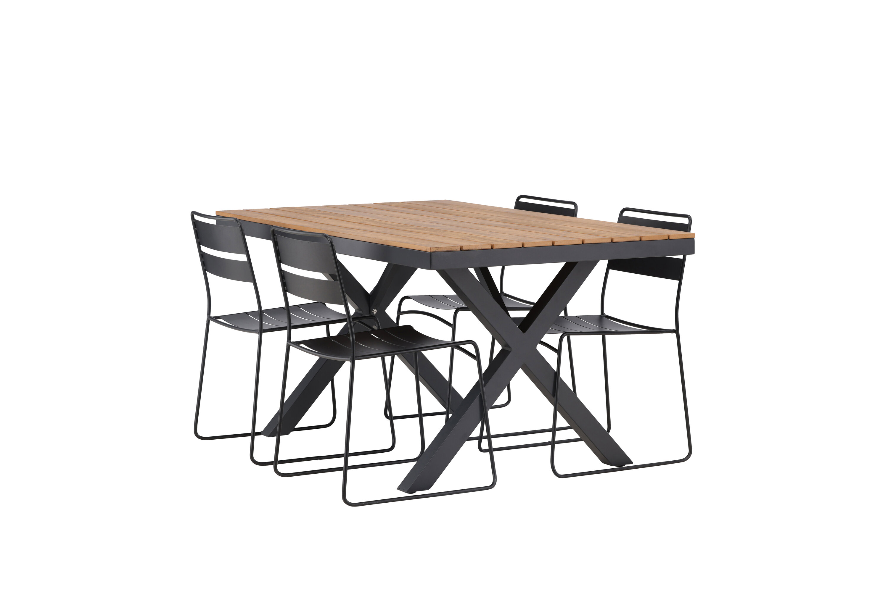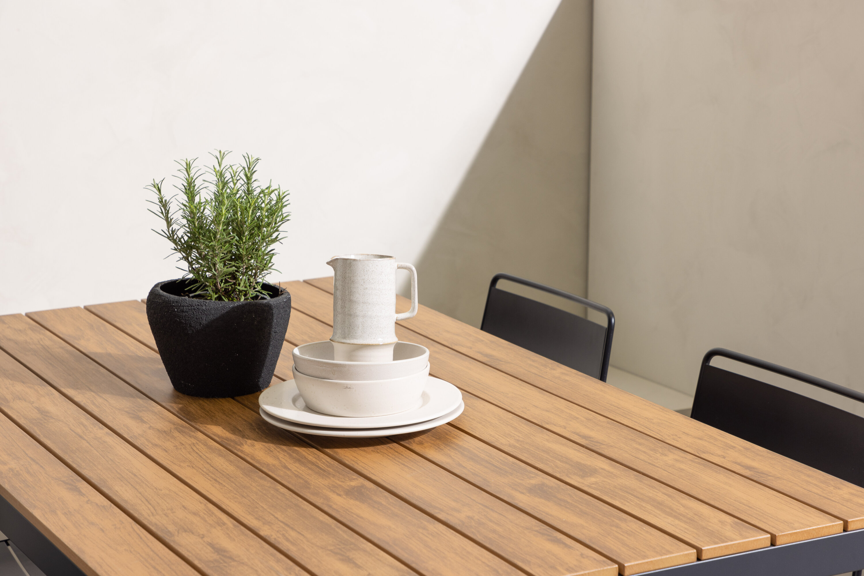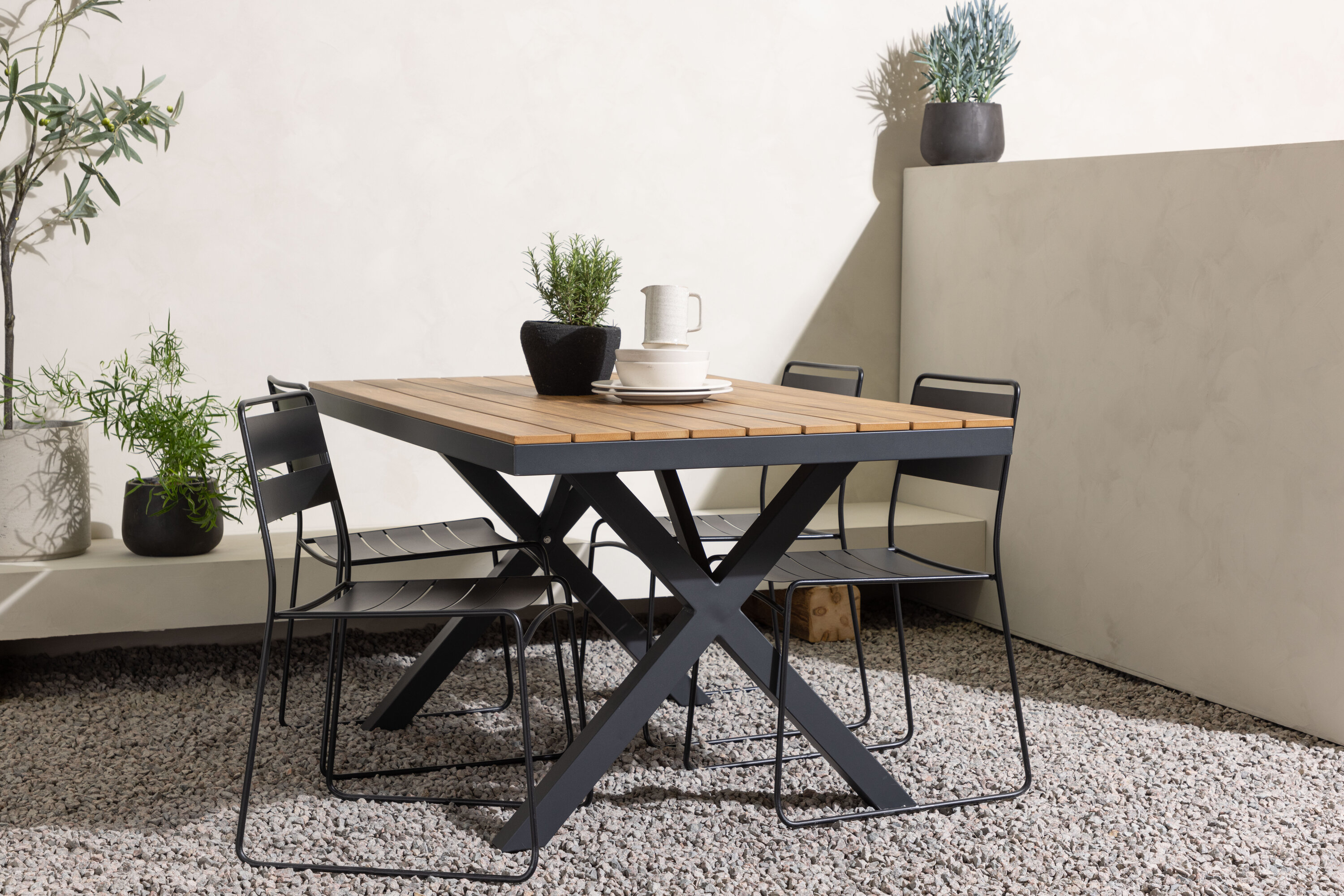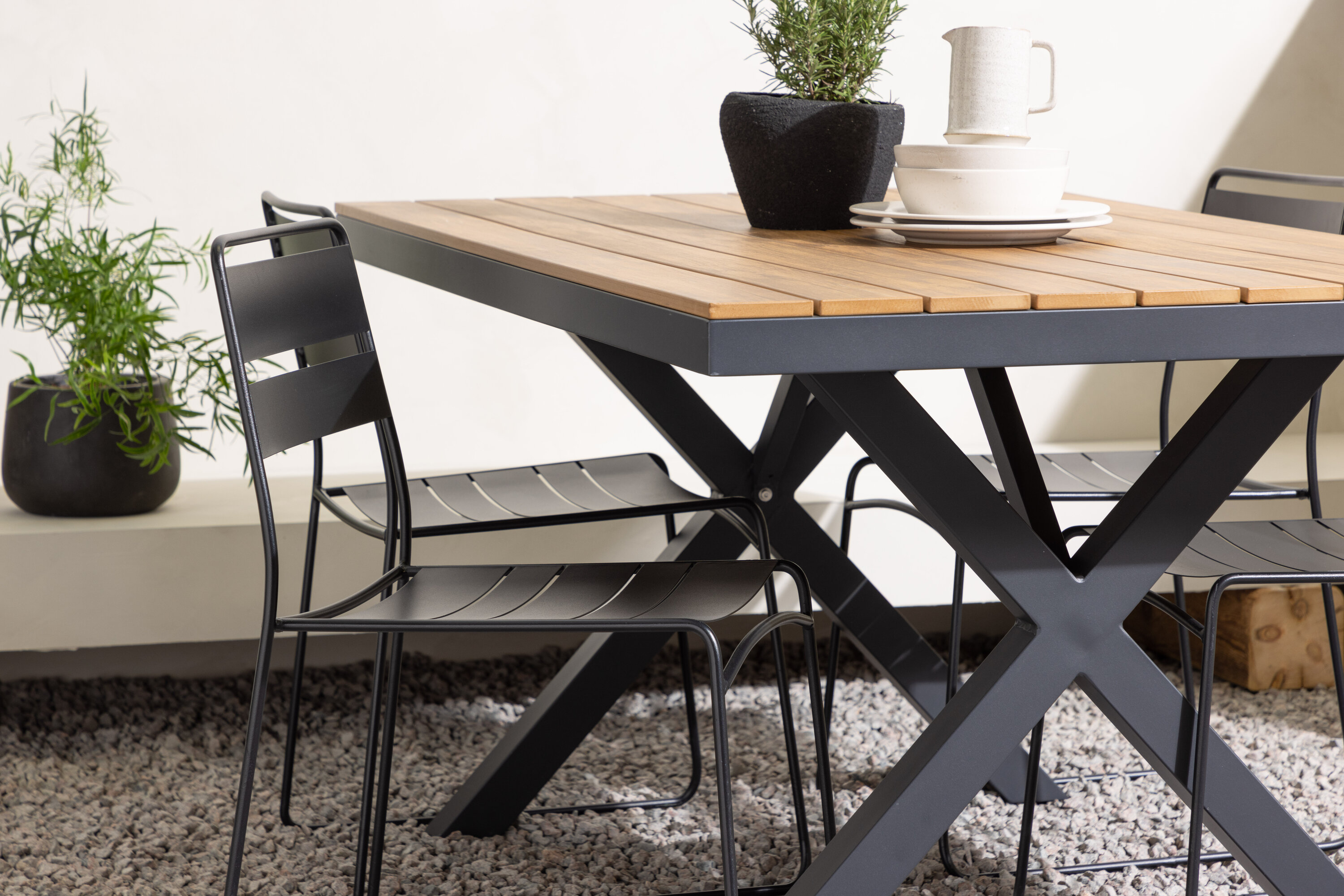 Eine stilvolle Kombination aus minimalistischem und robustem Design! Unser rechteckiger Garcia Esstisch hat ein klassisches Design mit einer Tischplatte aus schönem Holz und gekreuzten Tischbeinen aus schwarzem Aluminium. Hier in charmanter Kombination mit 4 schwarzen Esszimmerstühlen aus der Serie Lina. Die rußige, schwarze Farbe und das schmale Stahldesign des Stuhls vermitteln einen zeitlosen und luftigen Eindruck. Möblieren Sie auf der Terrasse oder im Wintergarten und laden Sie Ihre Freunde in Zukunft zu wunderbaren Mahlzeiten ein! Tischmaße: 150x90cm.
