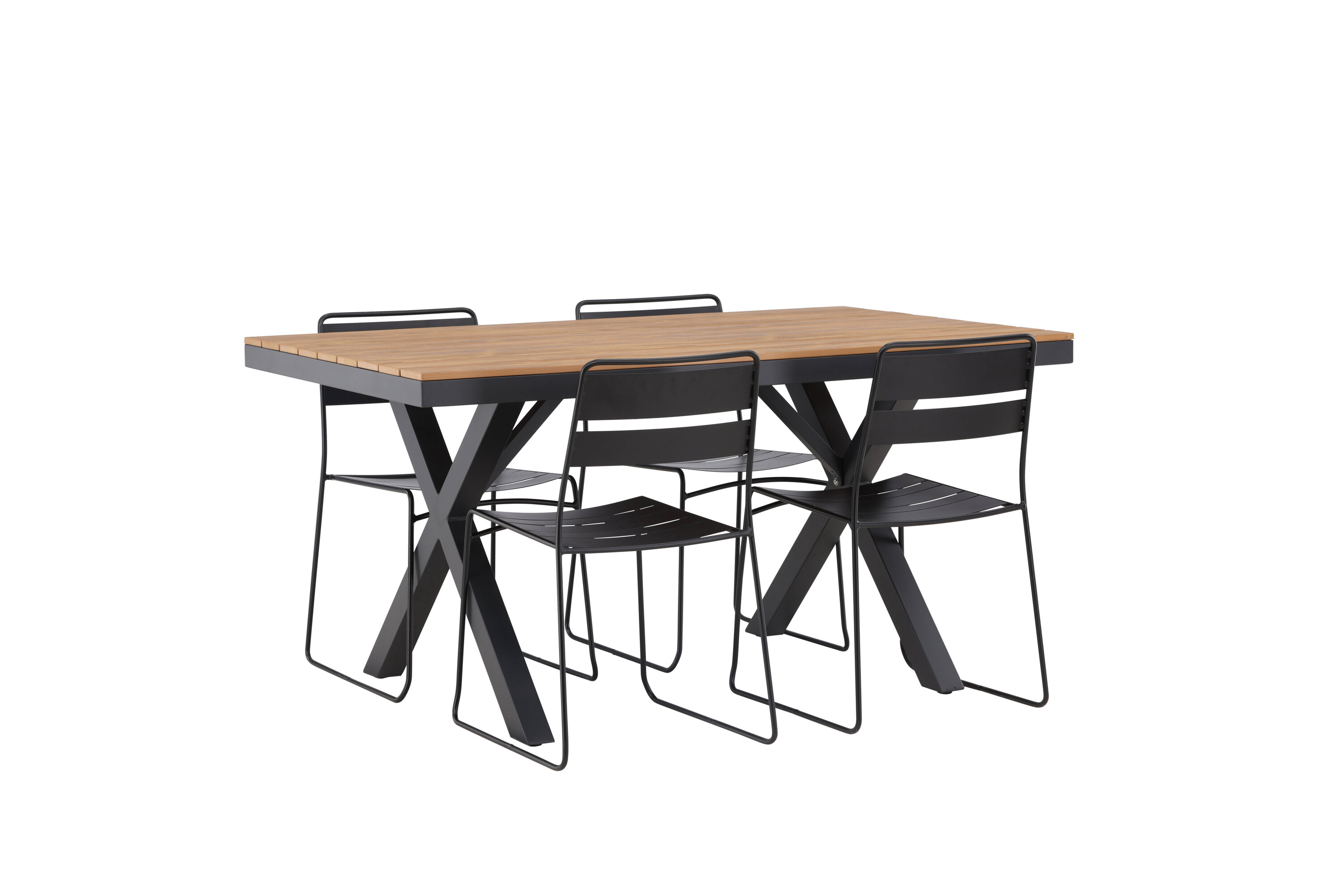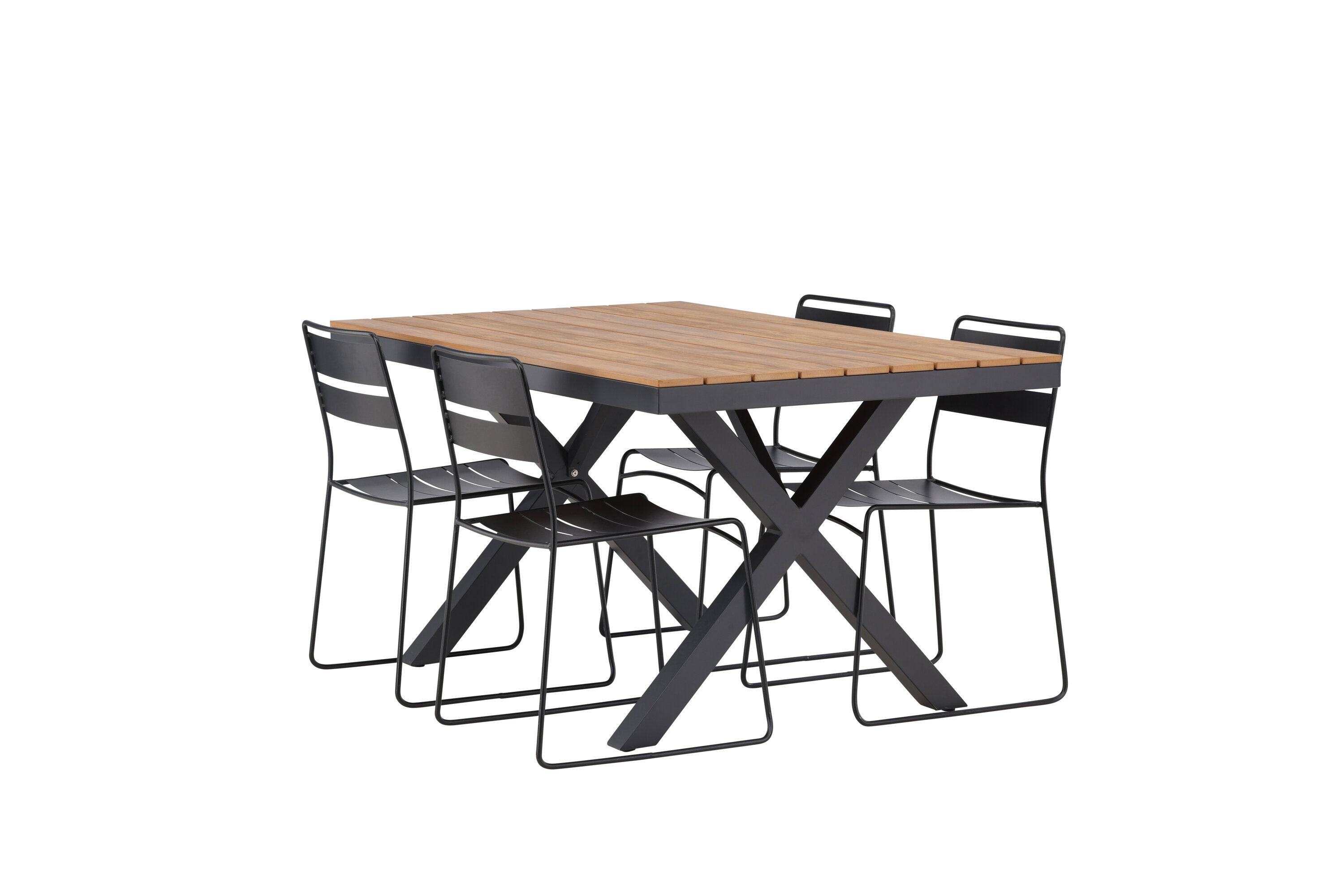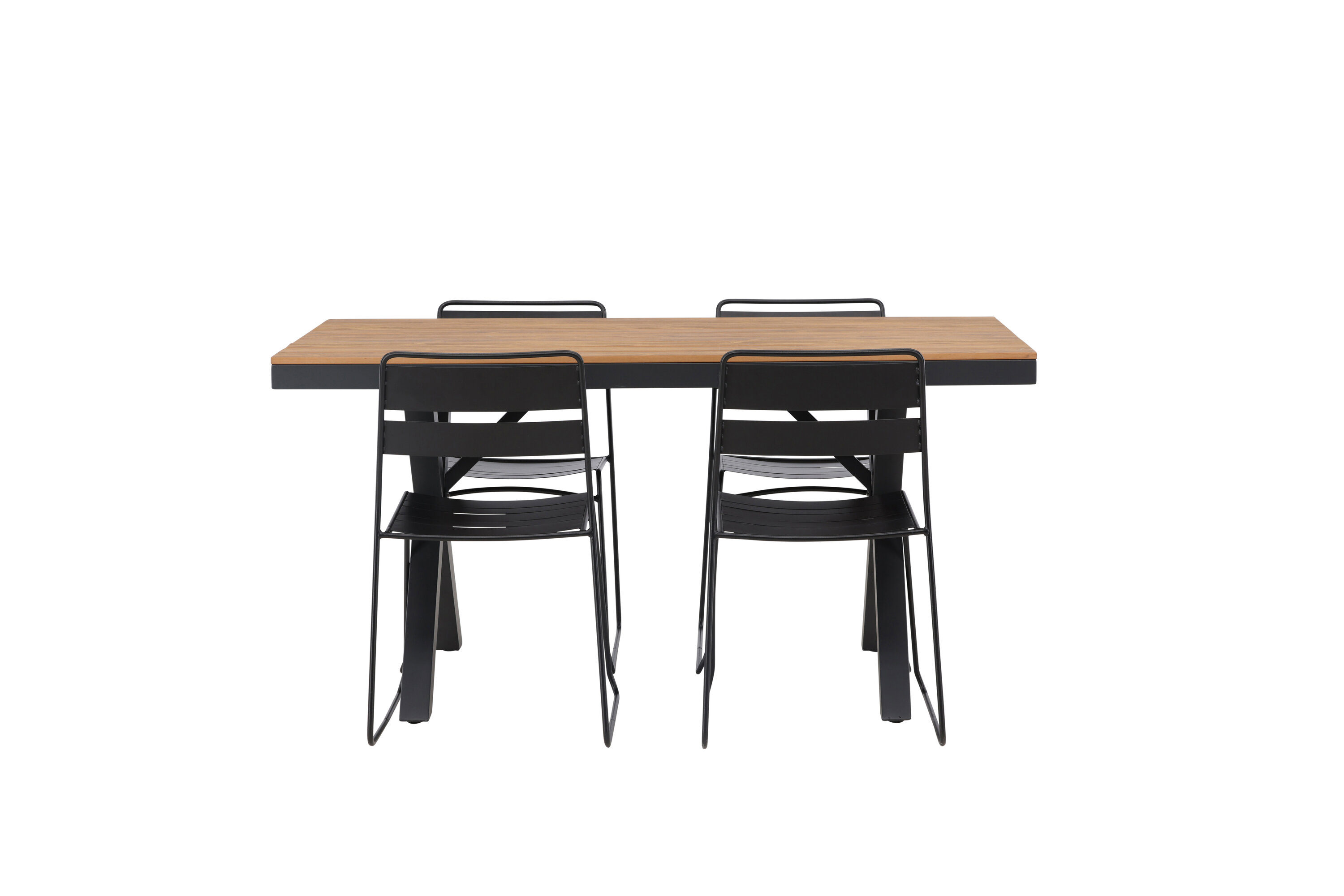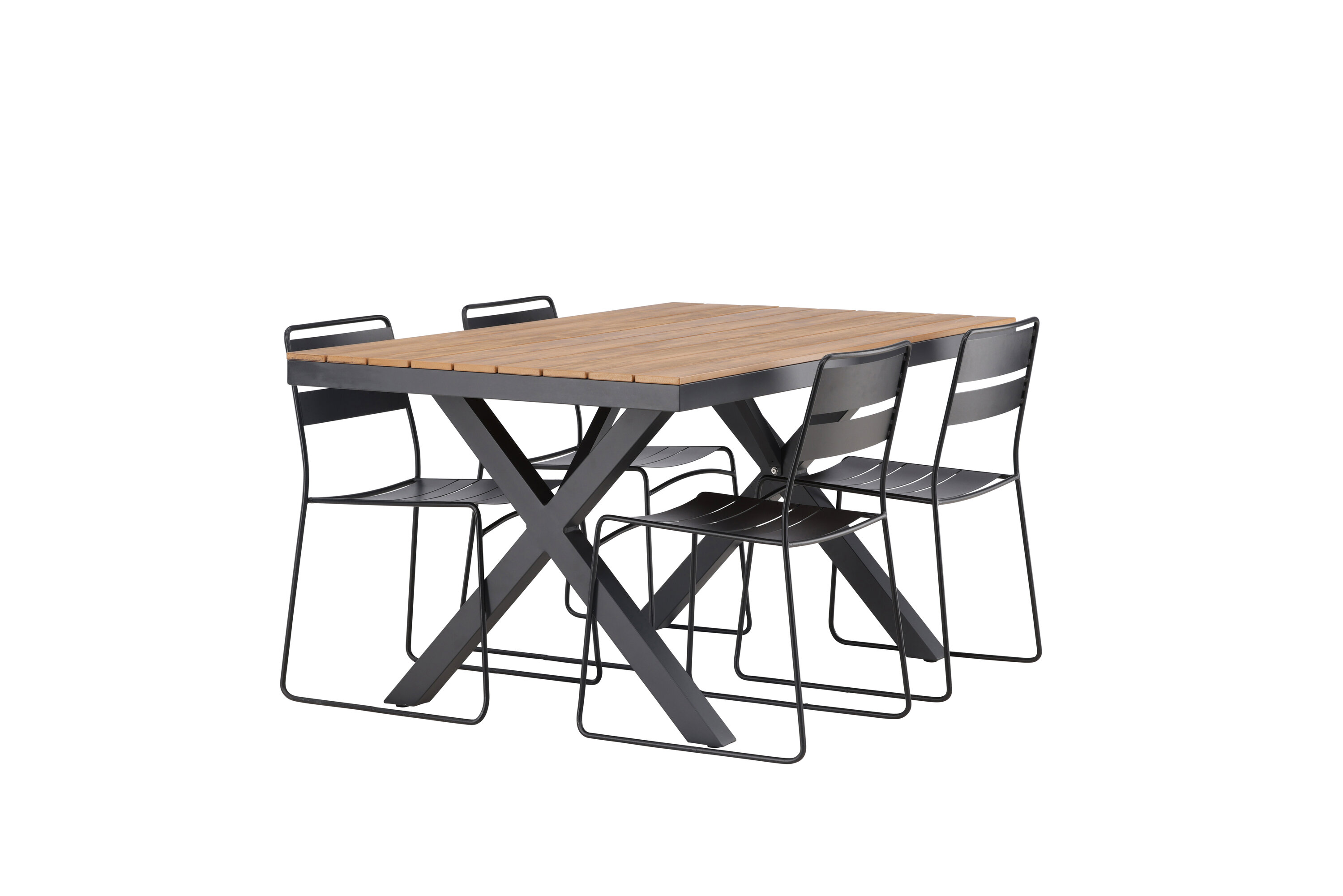 Eine stilvolle Kombination aus minimalistischem und robustem Design! Unser rechteckiger Garcia Esstisch hat ein klassisches Design mit einer Tischplatte aus schönem Holz und gekreuzten Tischbeinen aus schwarzem Aluminium. Hier in charmanter Kombination mit 4 schwarzen Esszimmerstühlen aus der Serie Lina. Die rußige, schwarze Farbe und das schmale Stahldesign des Stuhls vermitteln einen zeitlosen und luftigen Eindruck. Möblieren Sie auf der Terrasse oder im Wintergarten und laden Sie Ihre Freunde in Zukunft zu wunderbaren Mahlzeiten ein! Tischmaße: 150x90cm.