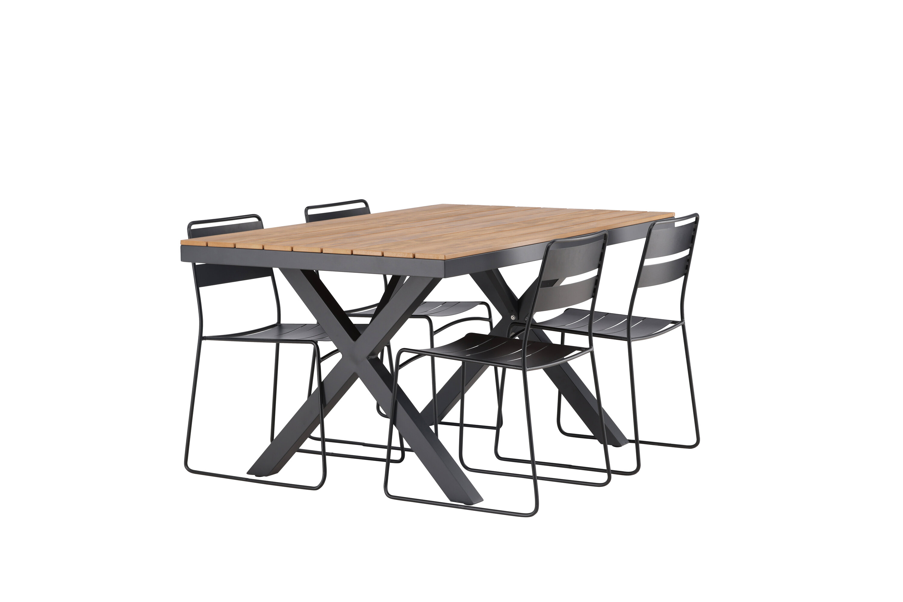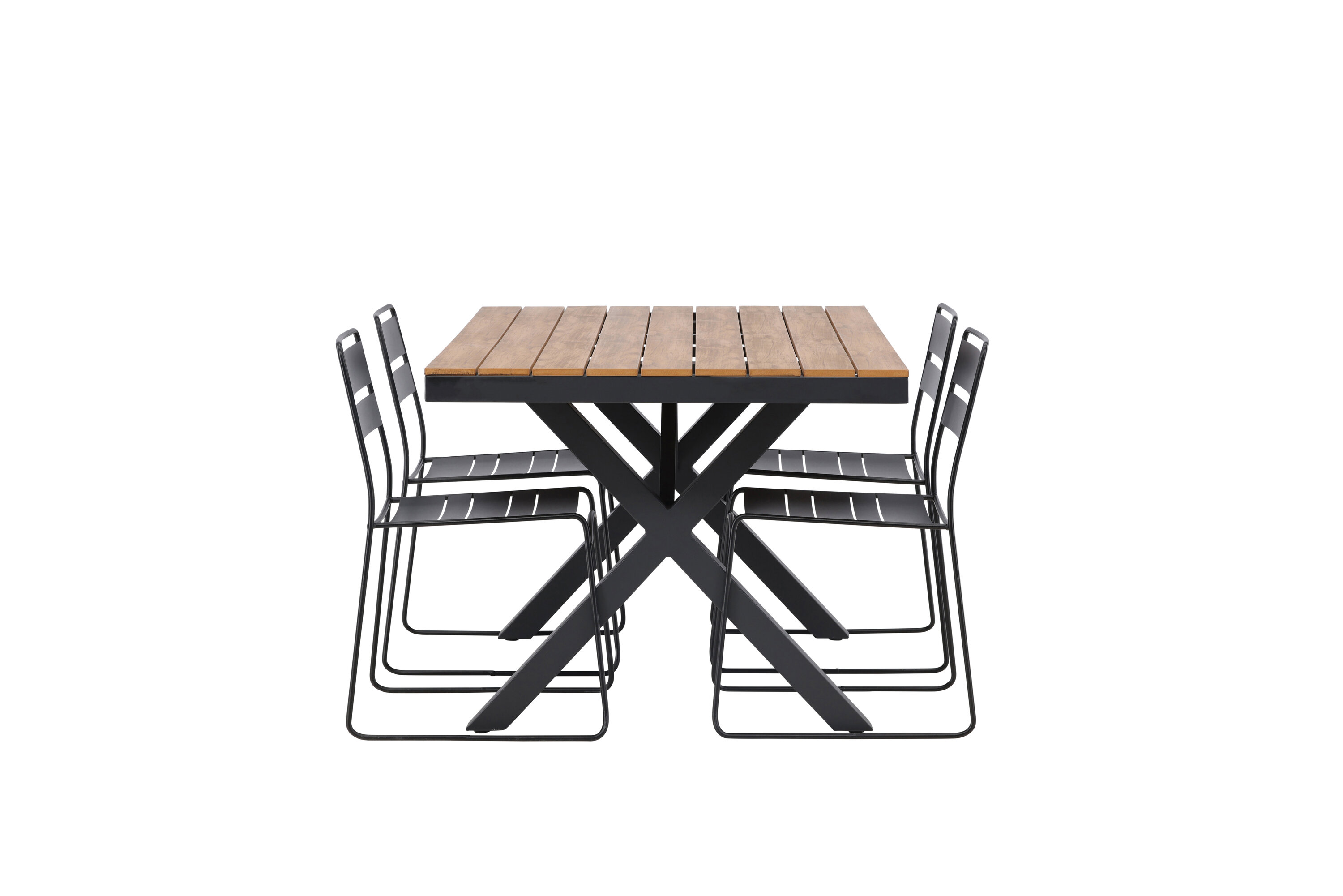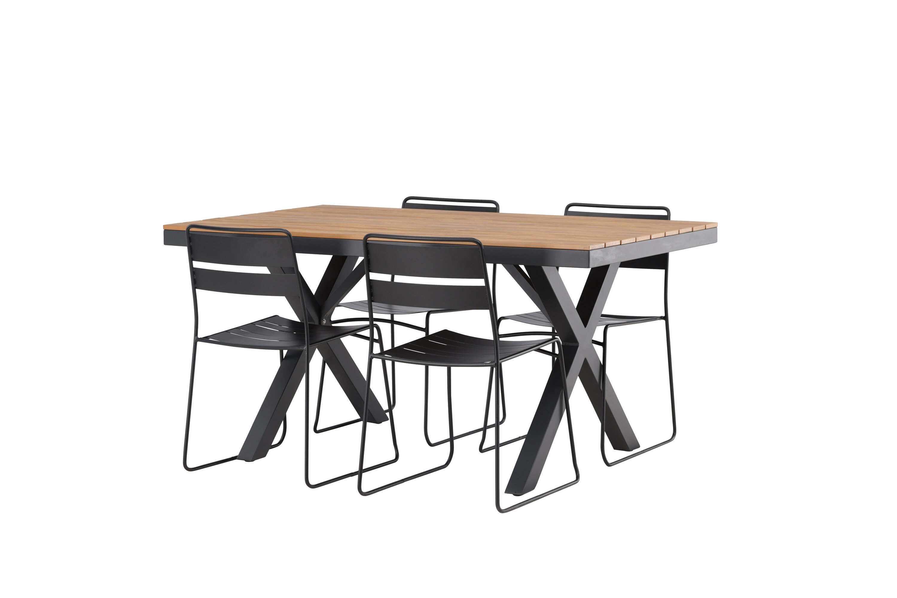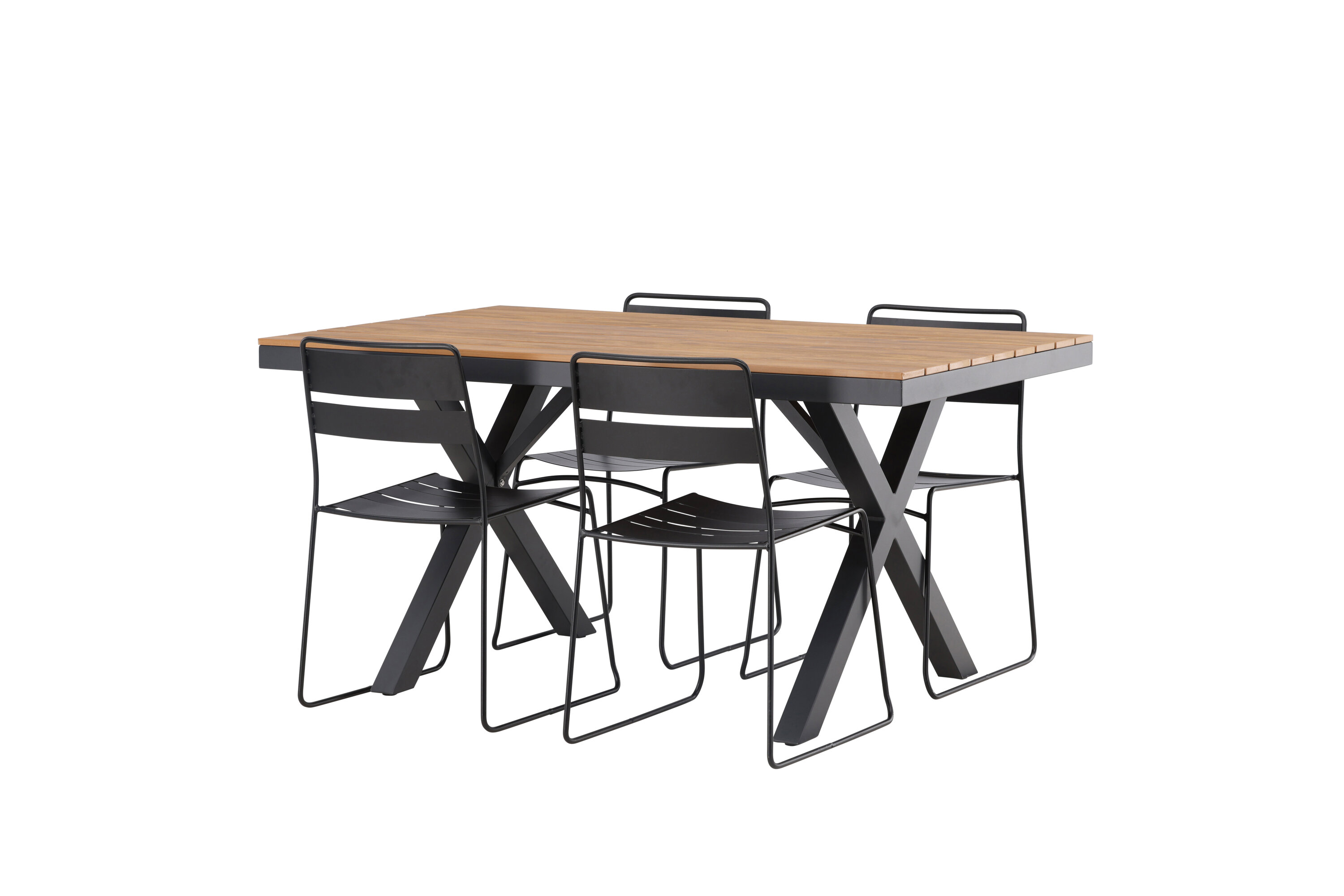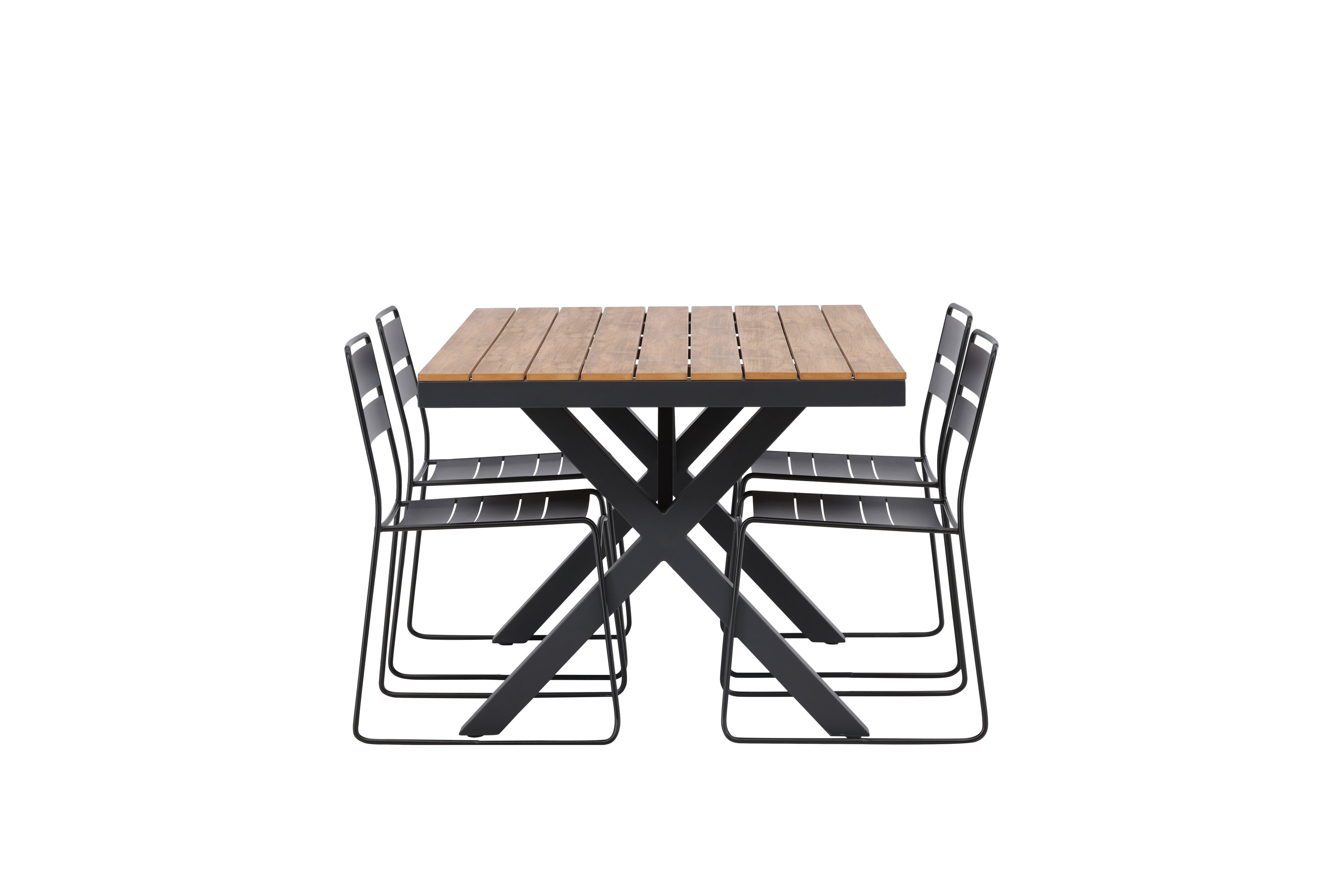 Eine stilvolle Kombination aus minimalistischem und robustem Design! Unser rechteckiger Garcia Esstisch hat ein klassisches Design mit einer Tischplatte aus schönem Holz und gekreuzten Tischbeinen aus schwarzem Aluminium. Hier in charmanter Kombination mit 4 schwarzen Esszimmerstühlen aus der Serie Lina. Die rußige, schwarze Farbe und das schmale Stahldesign des Stuhls vermitteln einen zeitlosen und luftigen Eindruck. Möblieren Sie auf der Terrasse oder im Wintergarten und laden Sie Ihre Freunde in Zukunft zu wunderbaren Mahlzeiten ein! Tischmaße: 150x90cm.