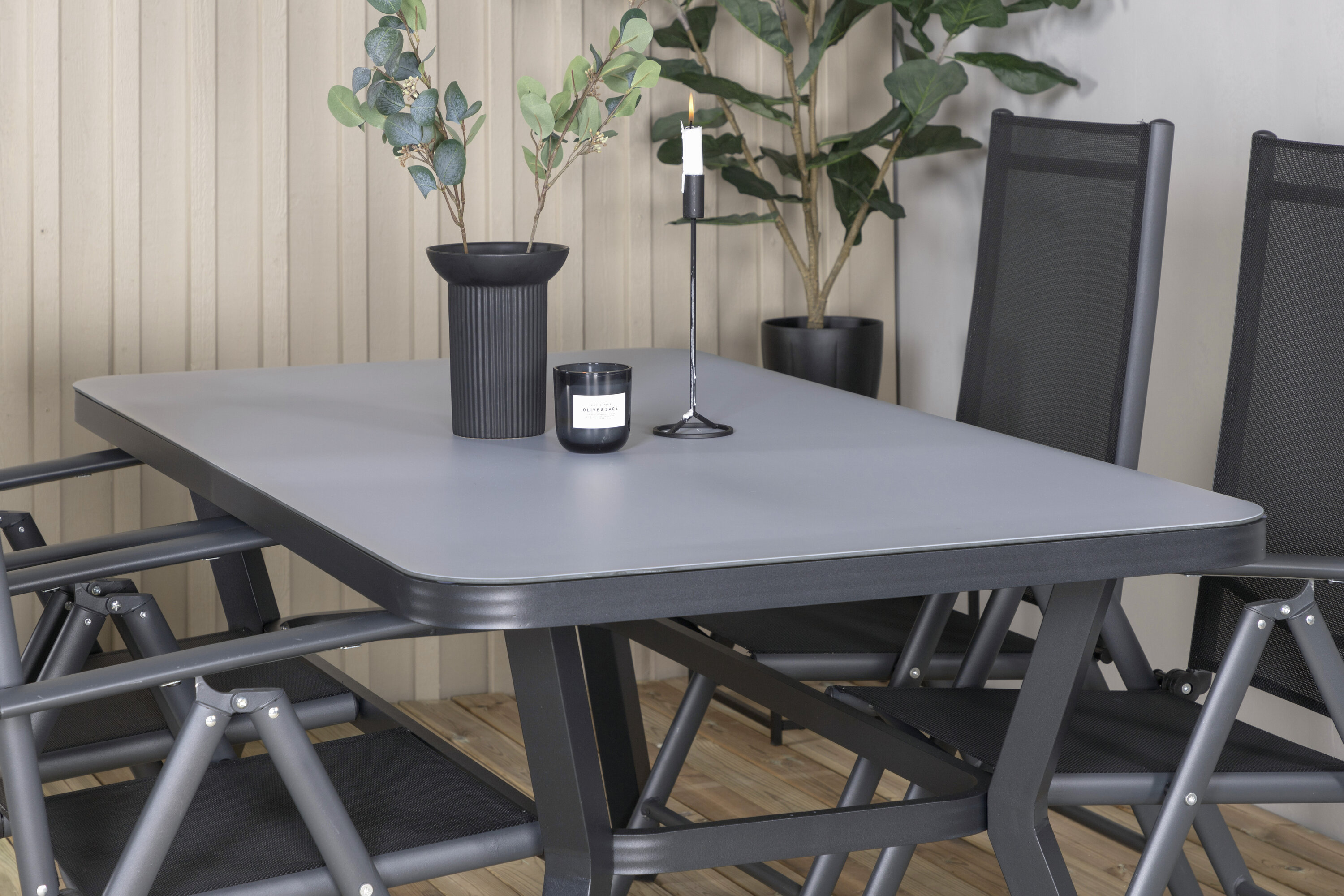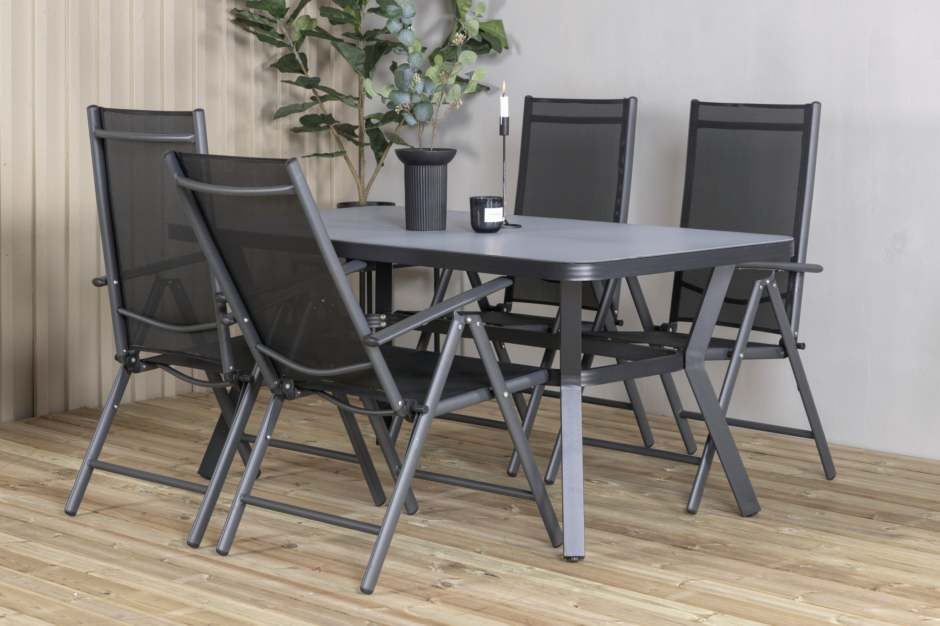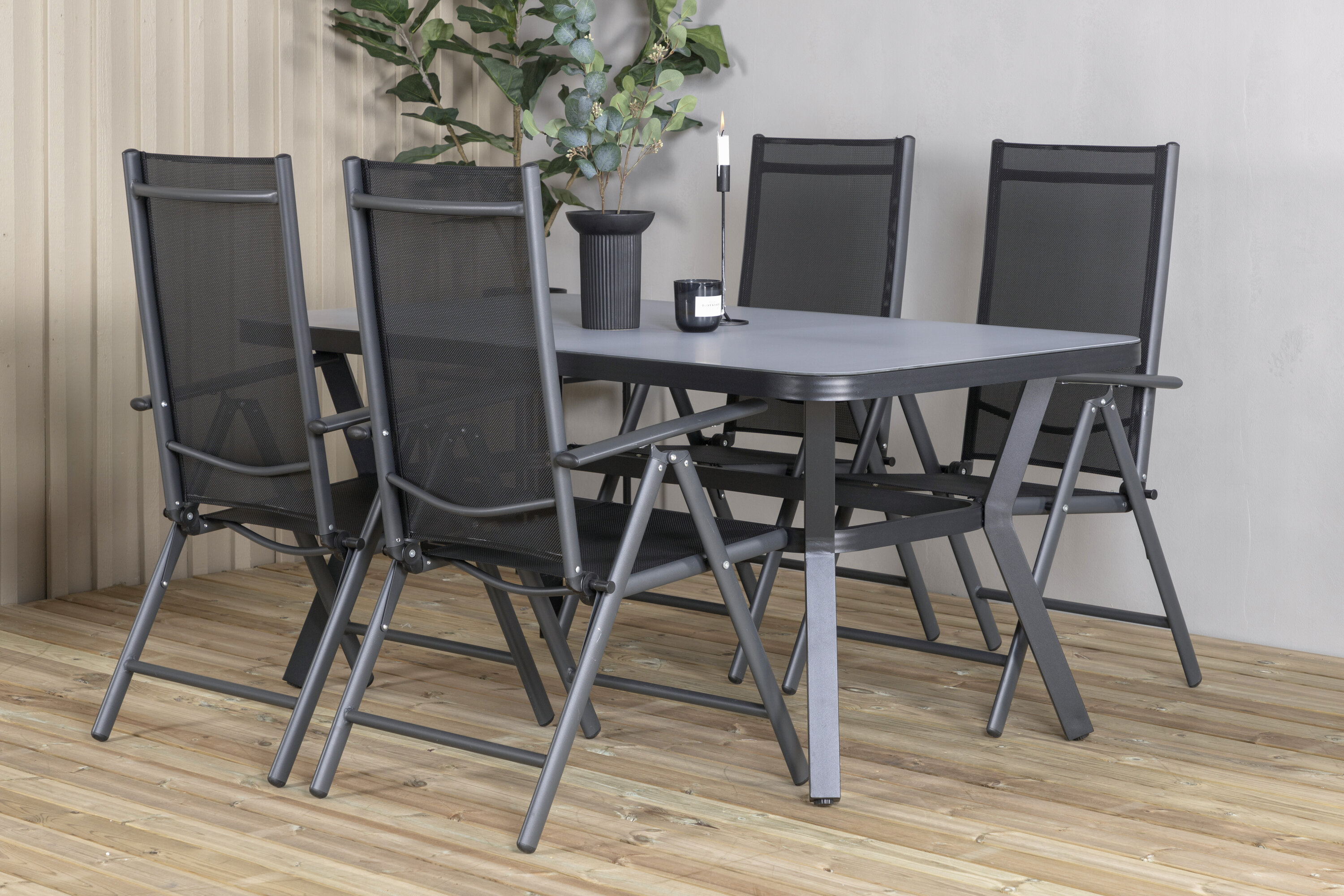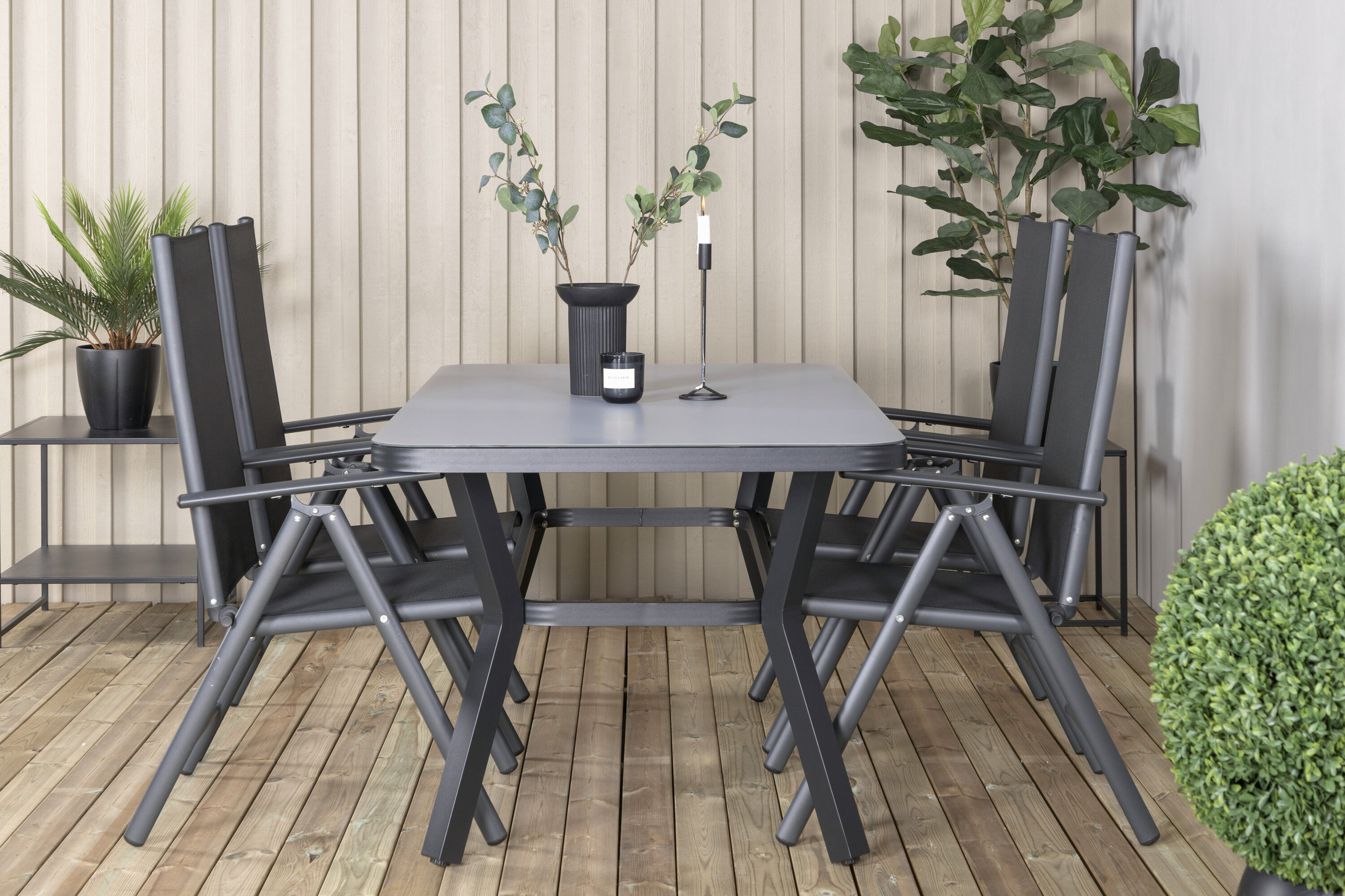 Eine Lebensmittelgruppe in modernem und stilvollem Design. Esstisch Virya und Esszimmerstühle Break sind die perfekte Kombination für das Gartenherz!