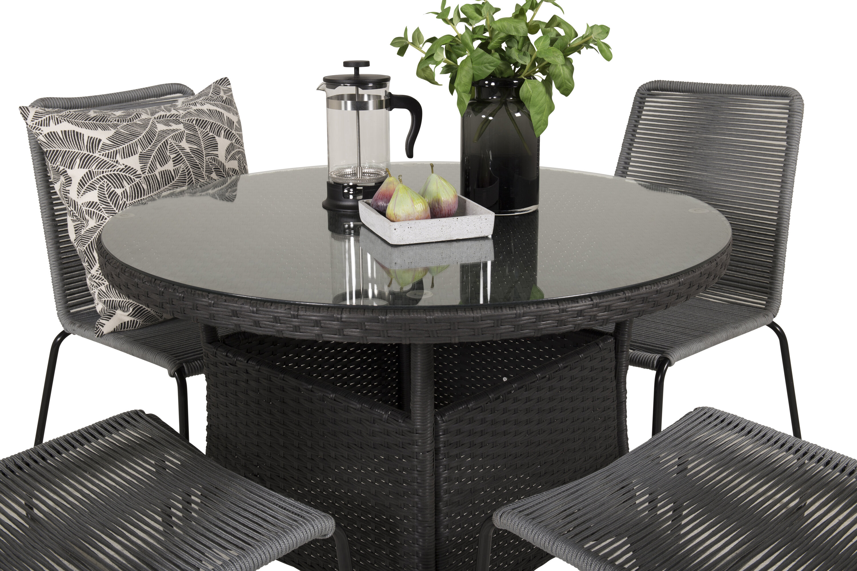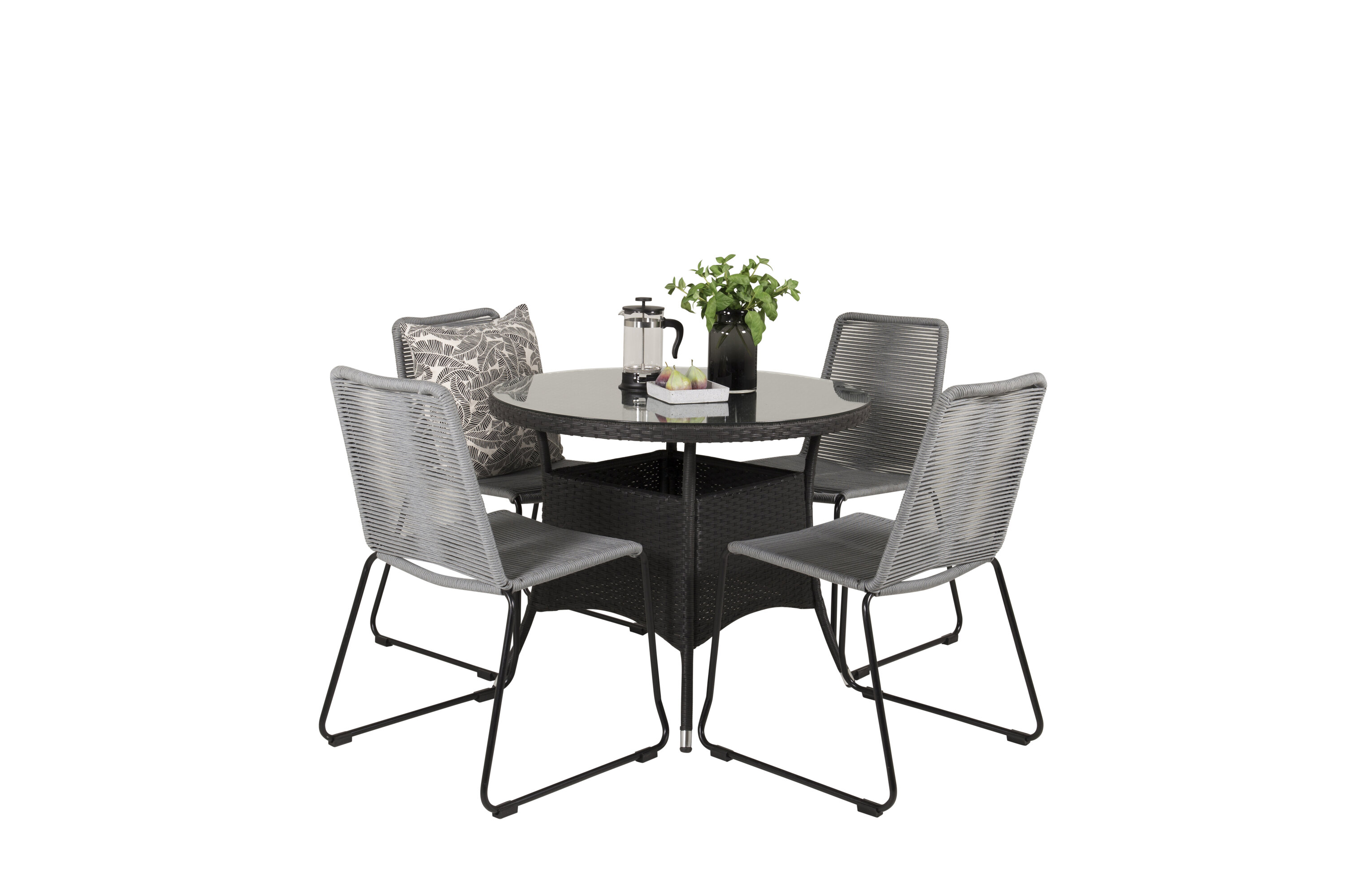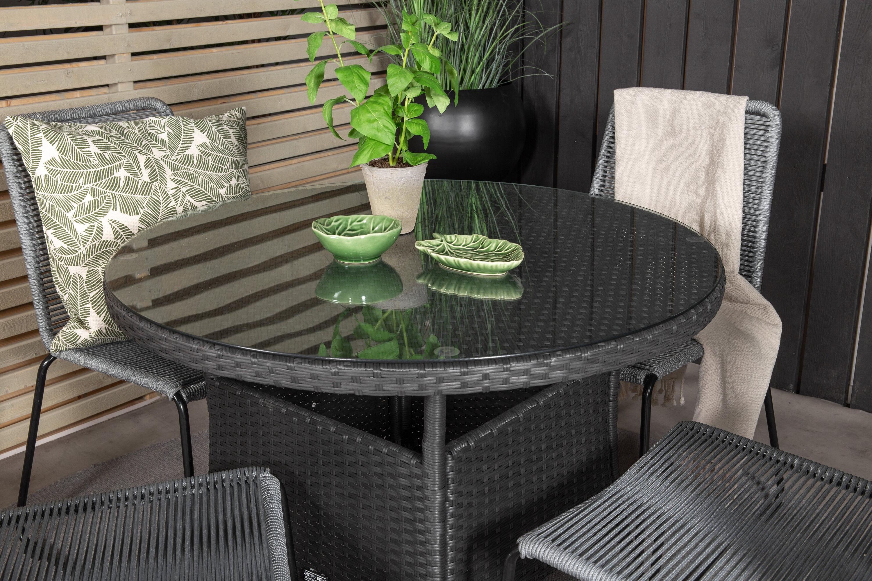 Kleine und hübsche Lebensmittelgruppe, die perfekt ins Balcogen passt. Esstisch Volta zusammen mit Esstischen Lindos. Die Stühle sind aus Seilen gefertigt, was Ihnen langlebige und sitzende Stühle bietet. Hier bleibst du gerne lange!