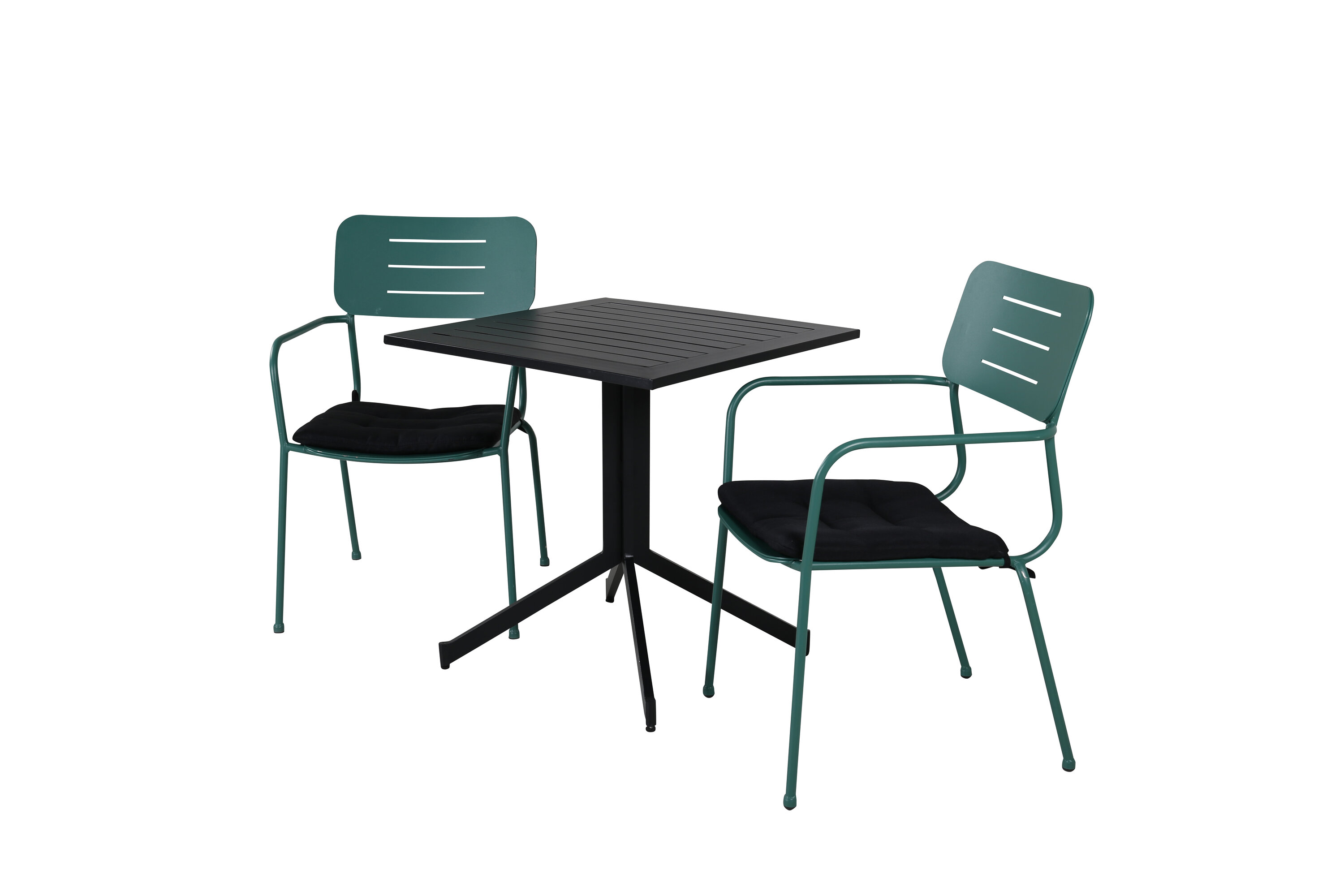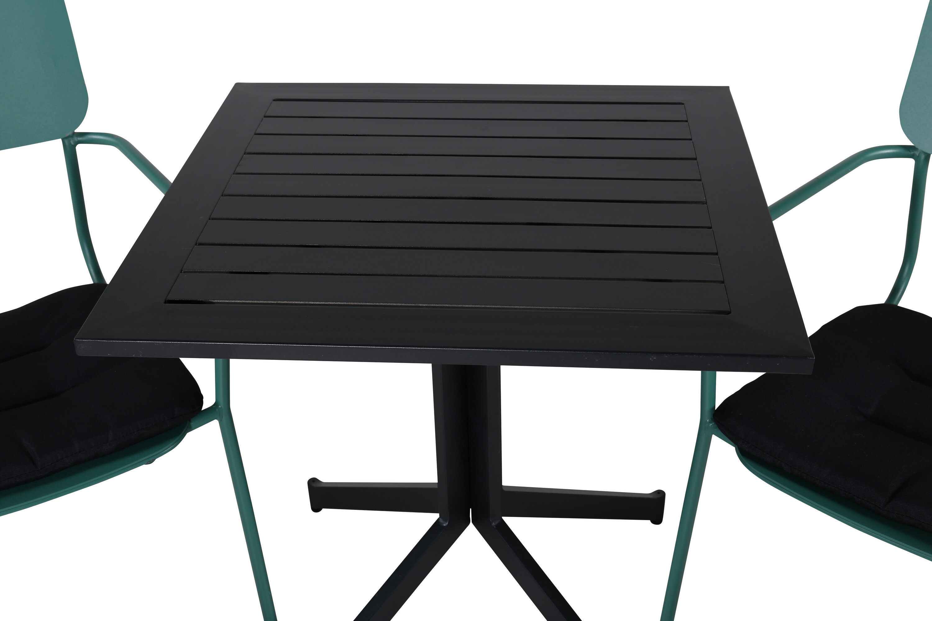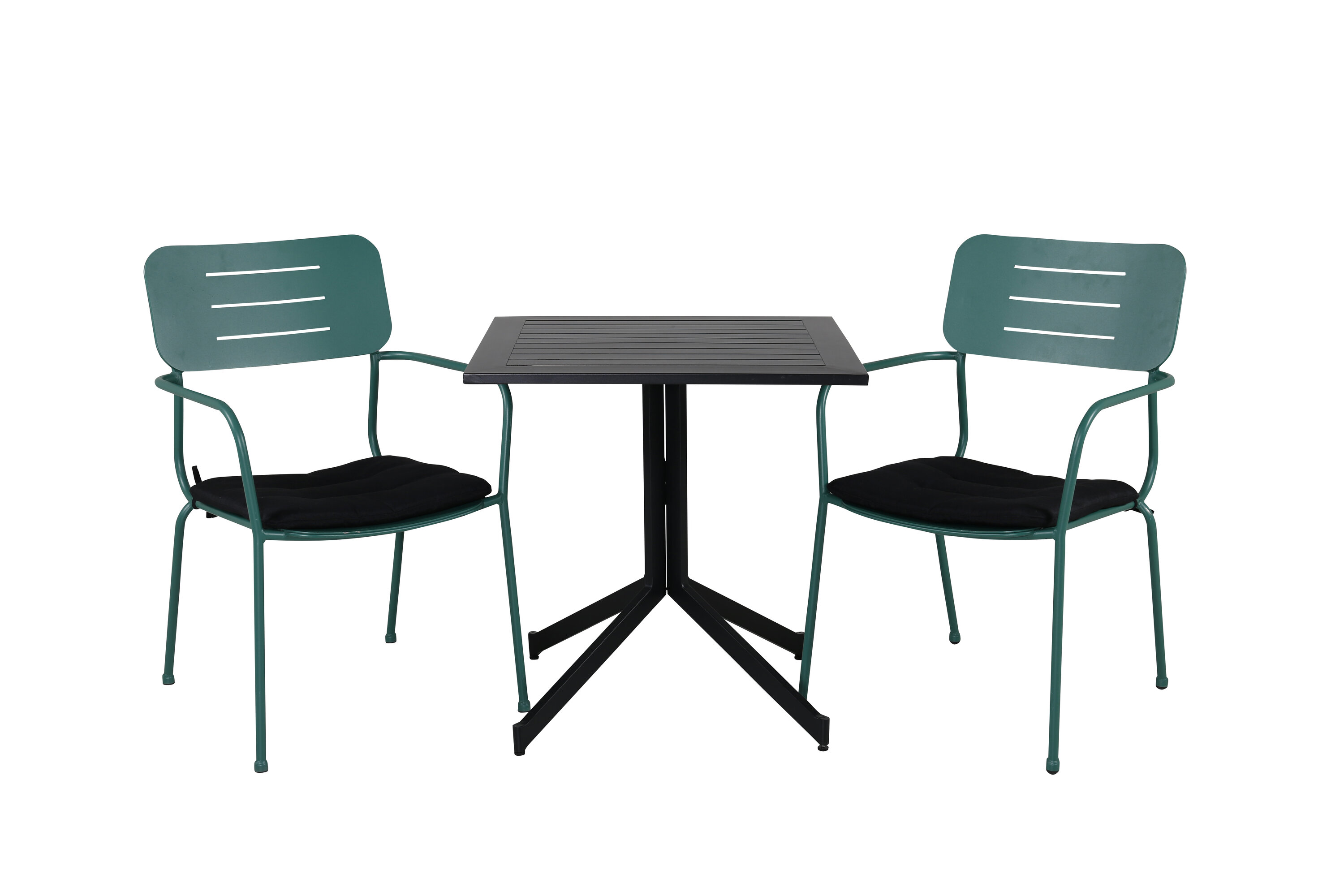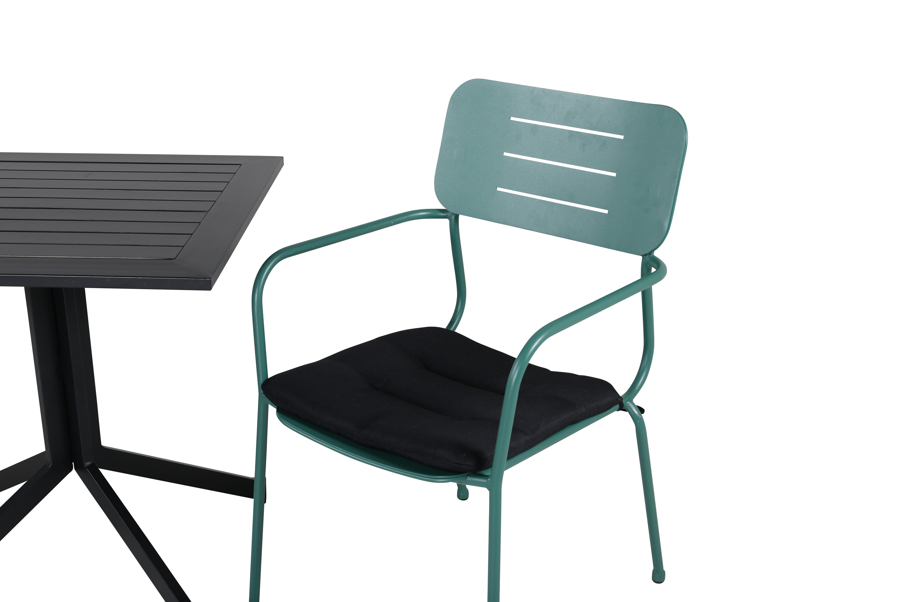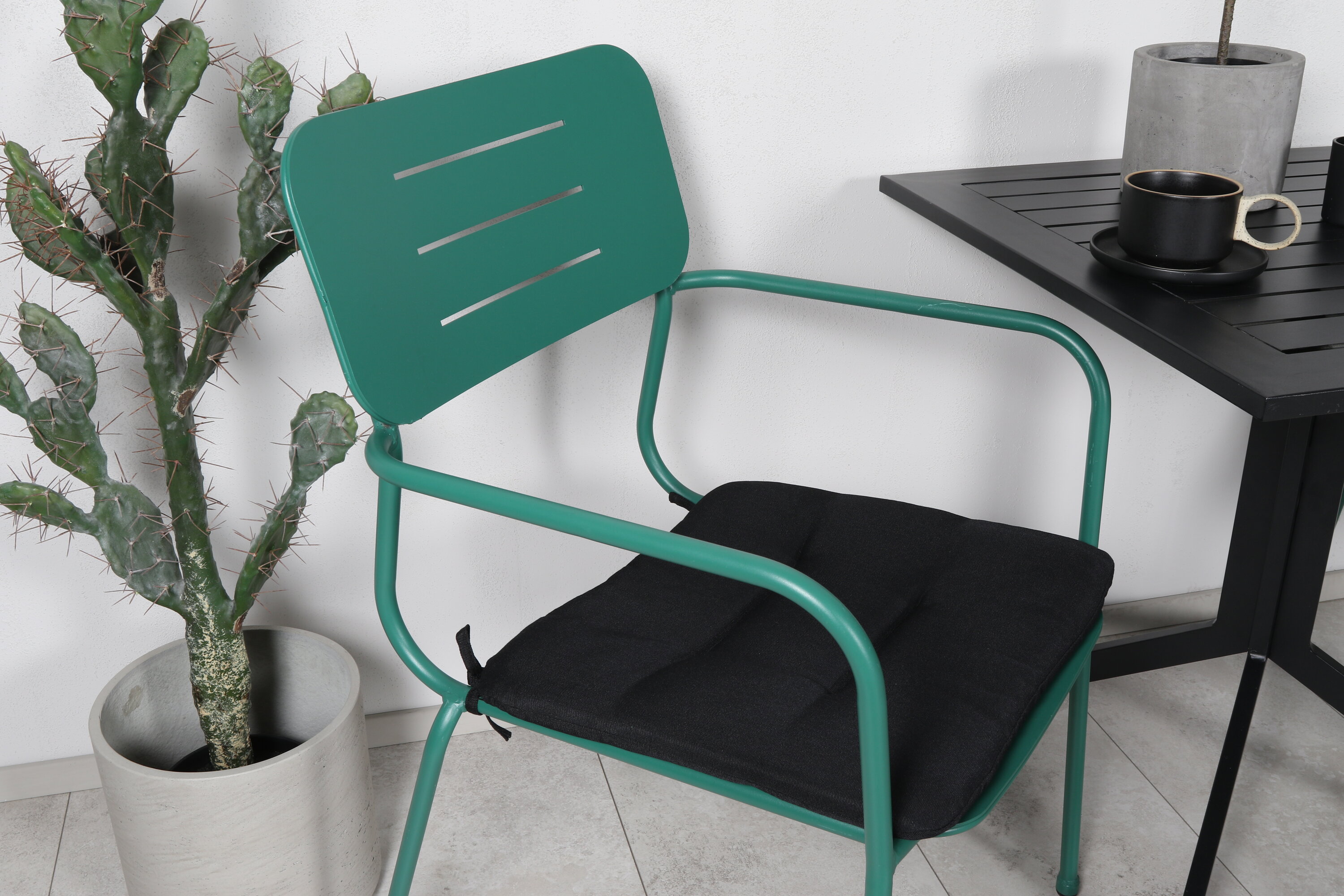 Eine kleine, hübsche und moderne Lebensmittelgruppe in köstlicher Farbkombination, die perfekt auf den Balkon oder Balkon passt! Dining Table Way hat einen klassischen Look und wird hier mit grünen Esszimmerstühlen aus der Nicke-Serie im Smack-Design kombiniert.