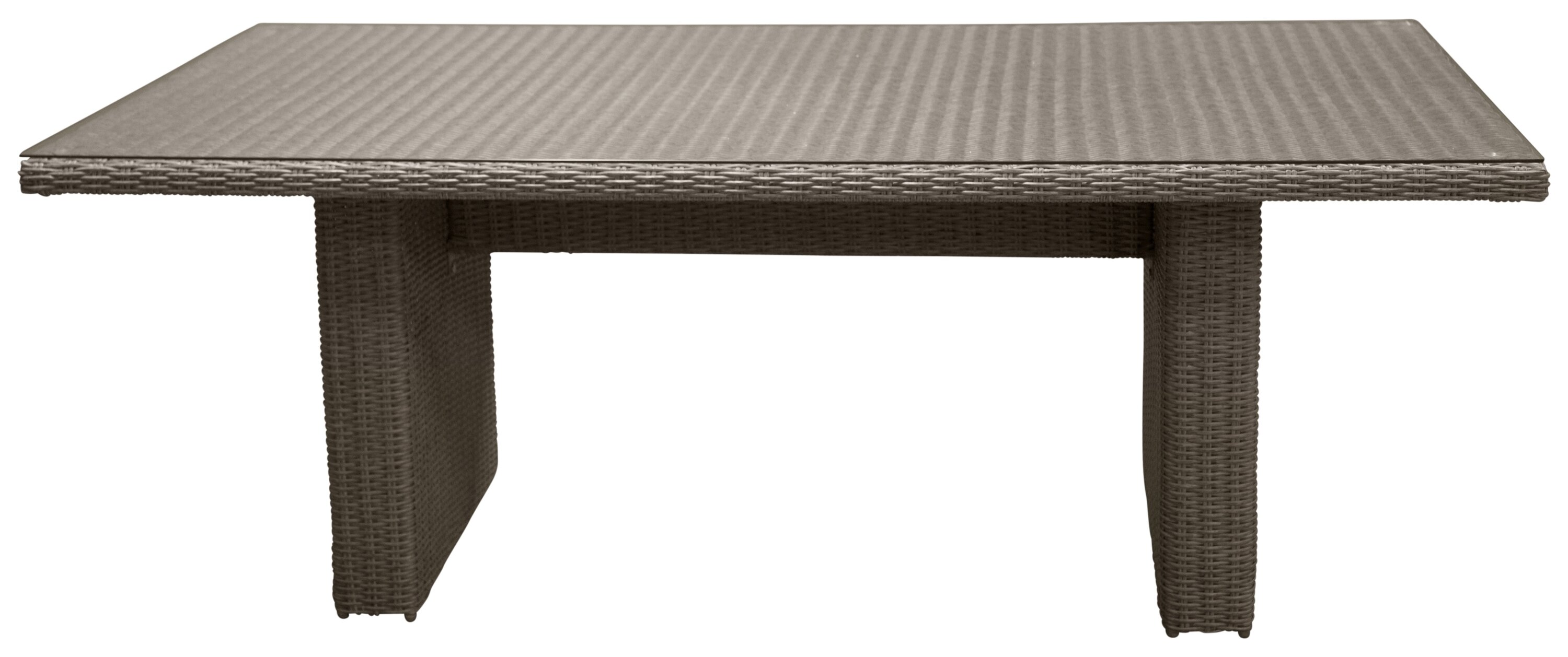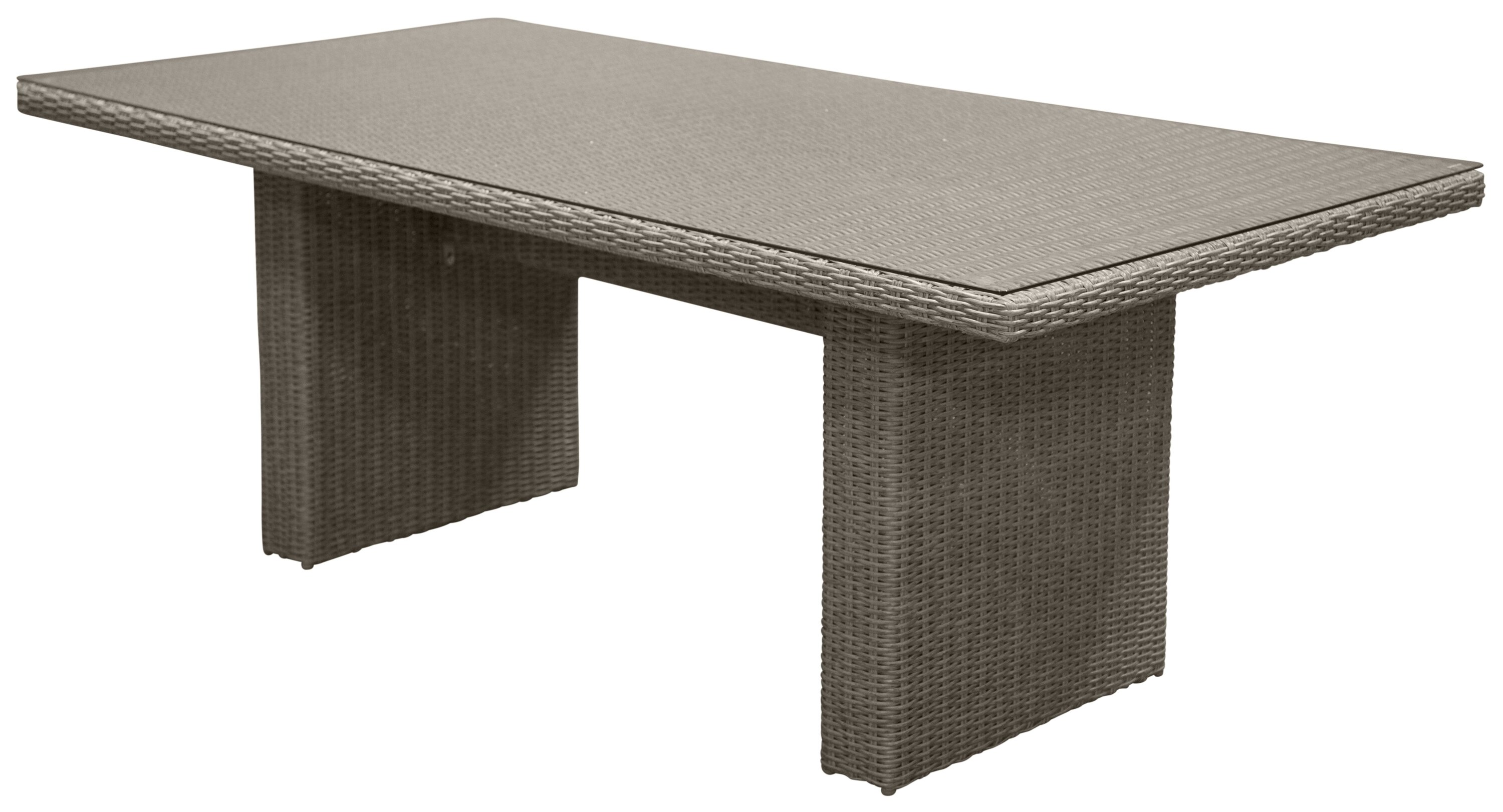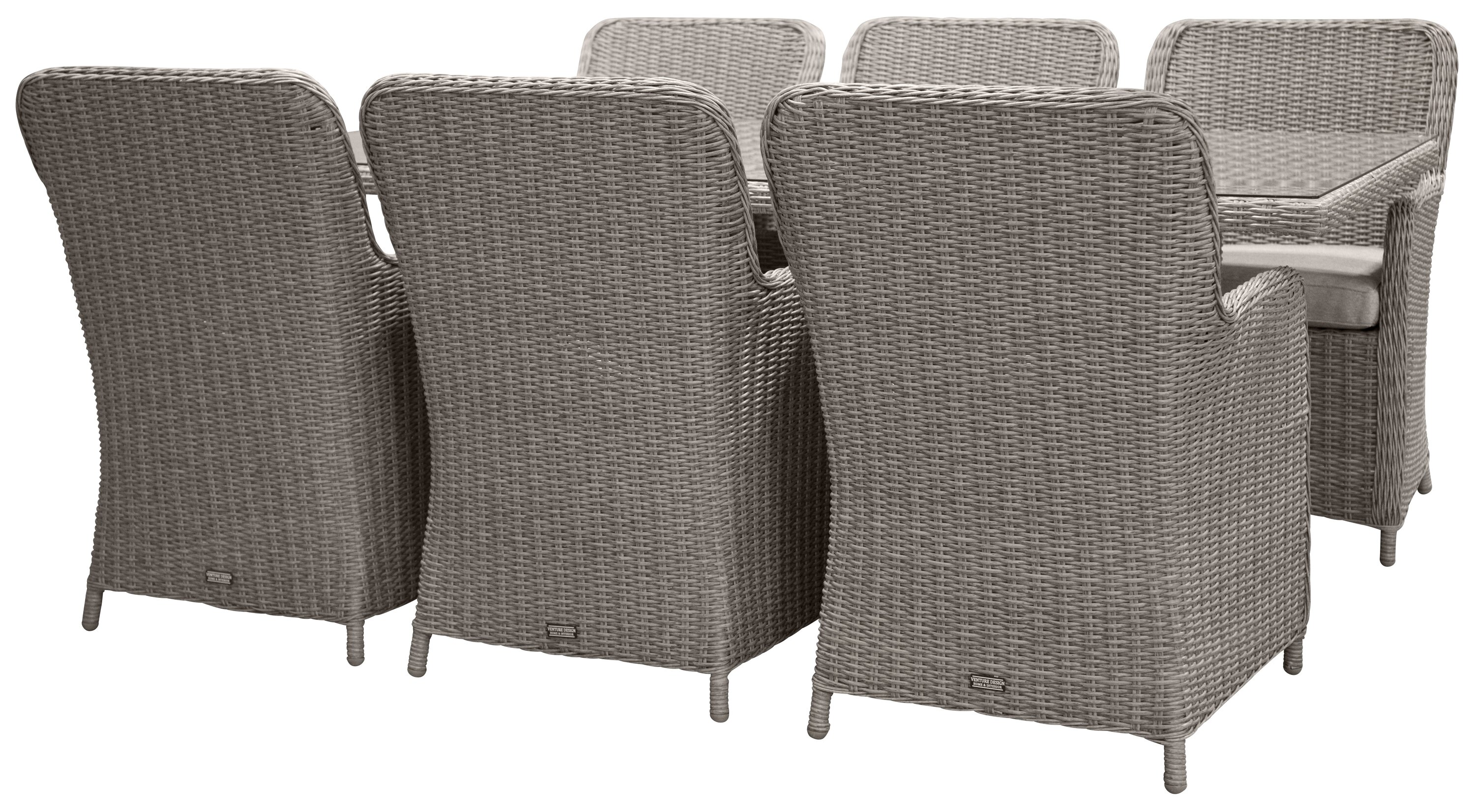 Eine Lebensmittelgruppe mit einem rechteckigen Esstisch aus künstlichem Rattan und einer Tischplatte aus Glas. Zur Lebensmittelgruppe gehören sechs bequeme Sessel.