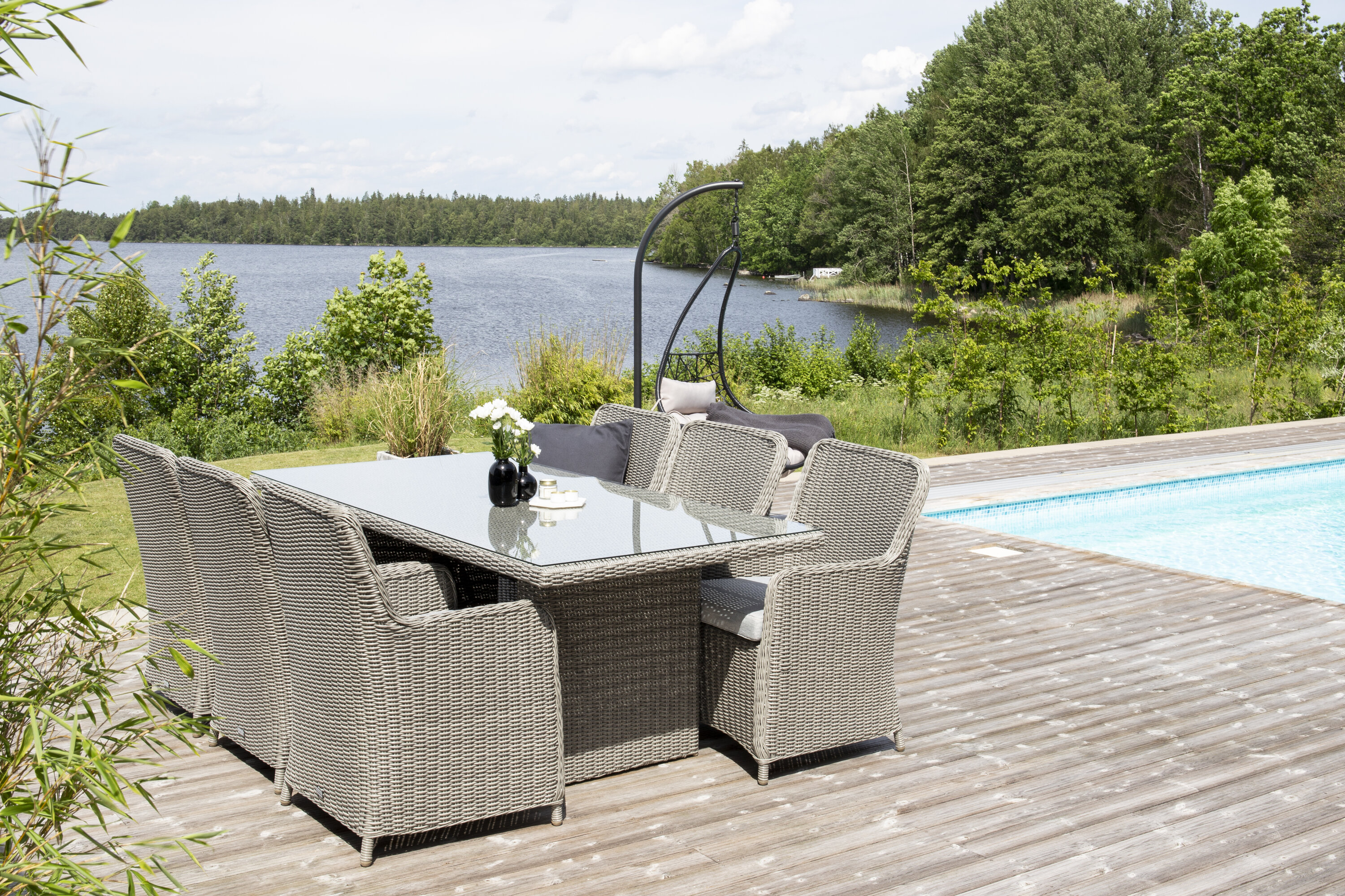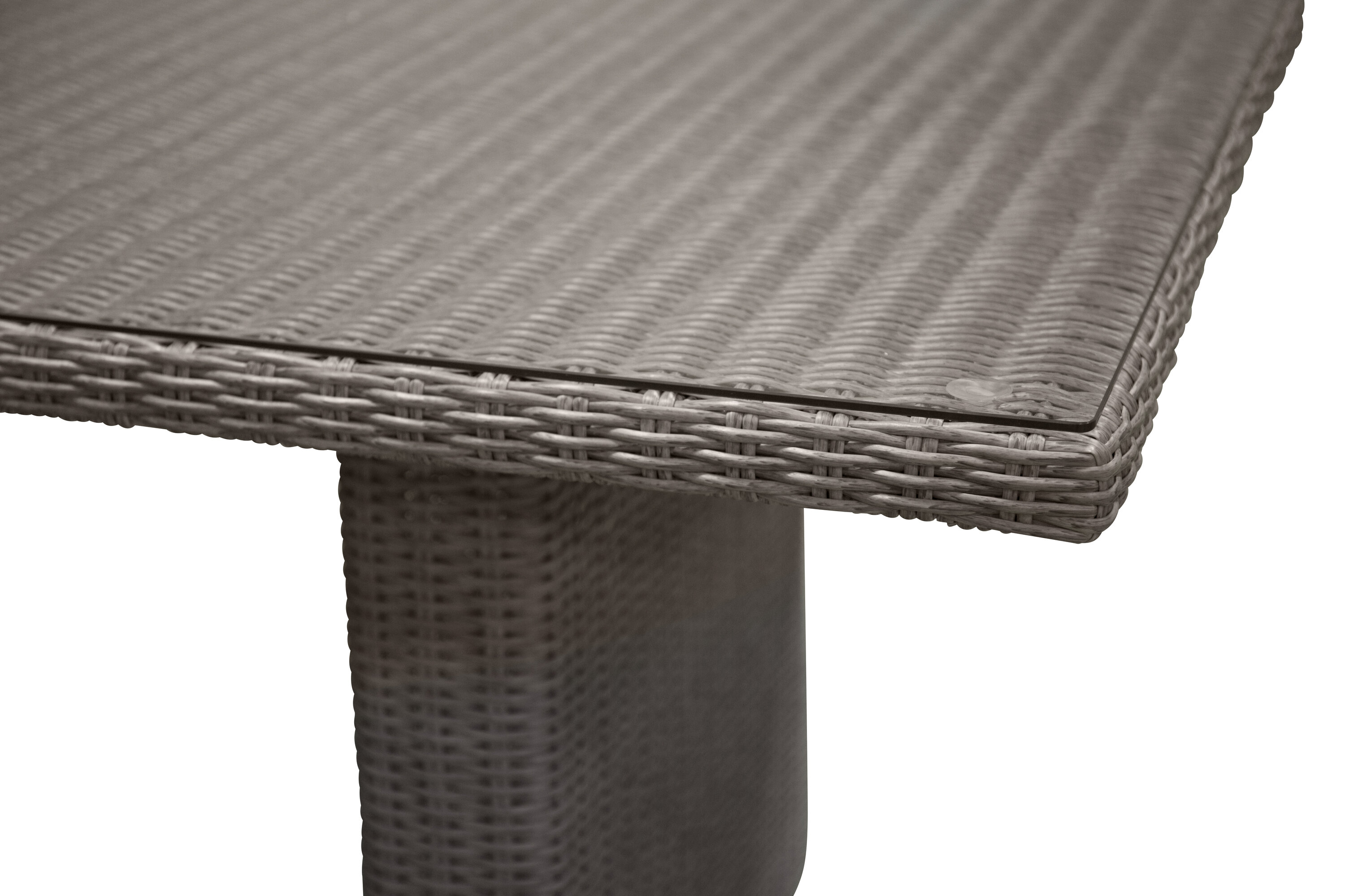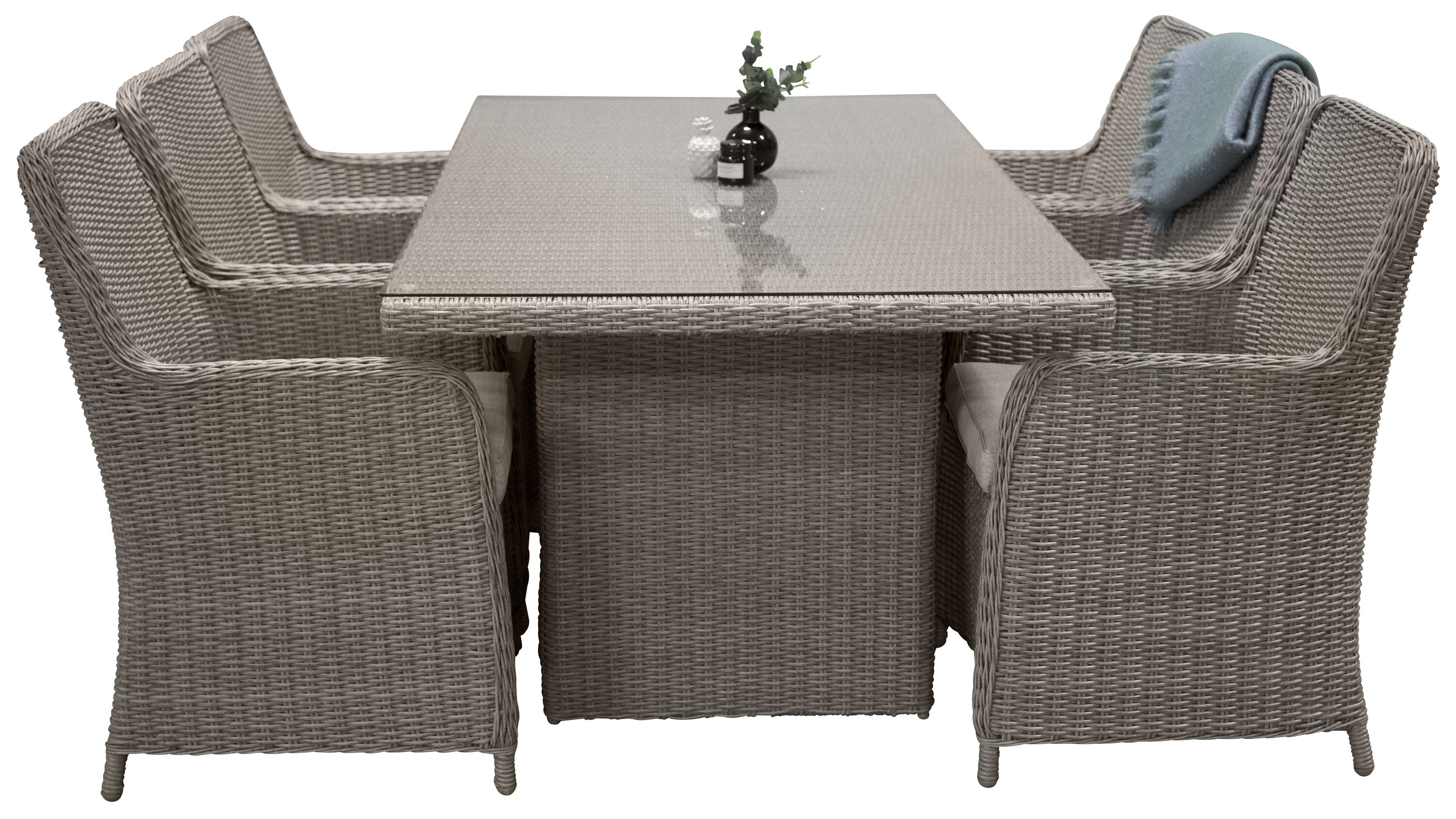 Eine Lebensmittelgruppe mit einem rechteckigen Esstisch aus künstlichem Rattan und einer Tischplatte aus Glas. Zur Lebensmittelgruppe gehören sechs bequeme Sessel.