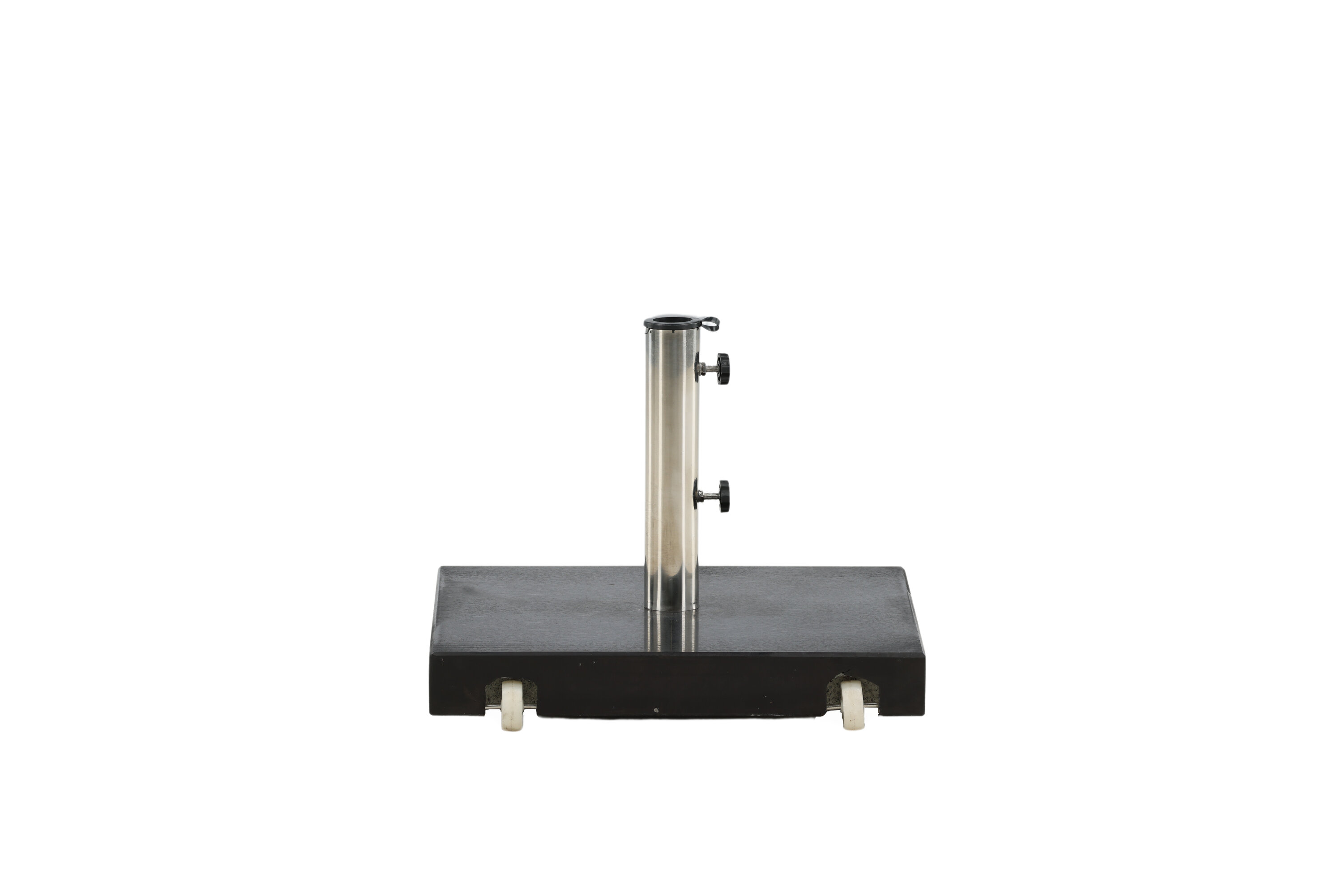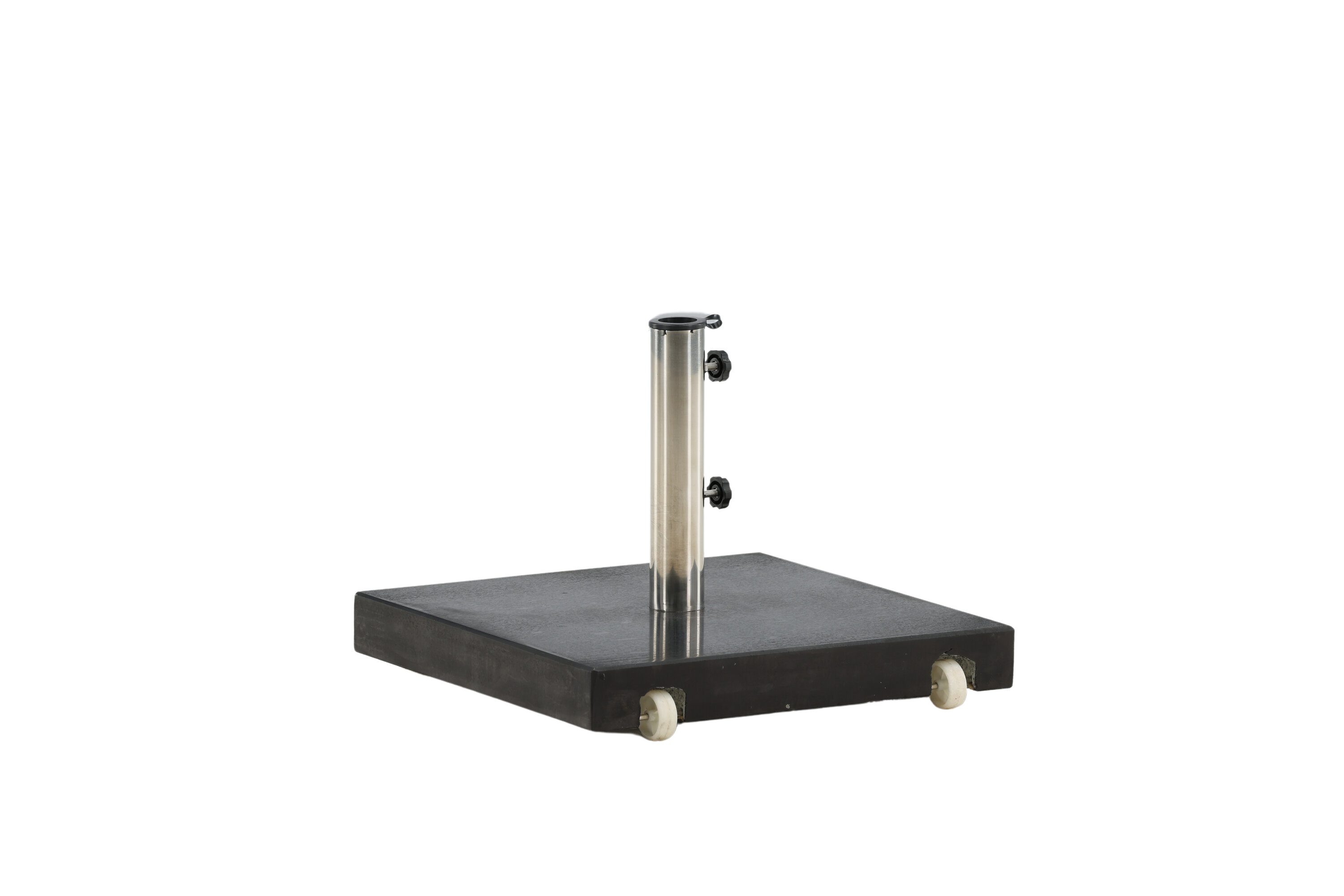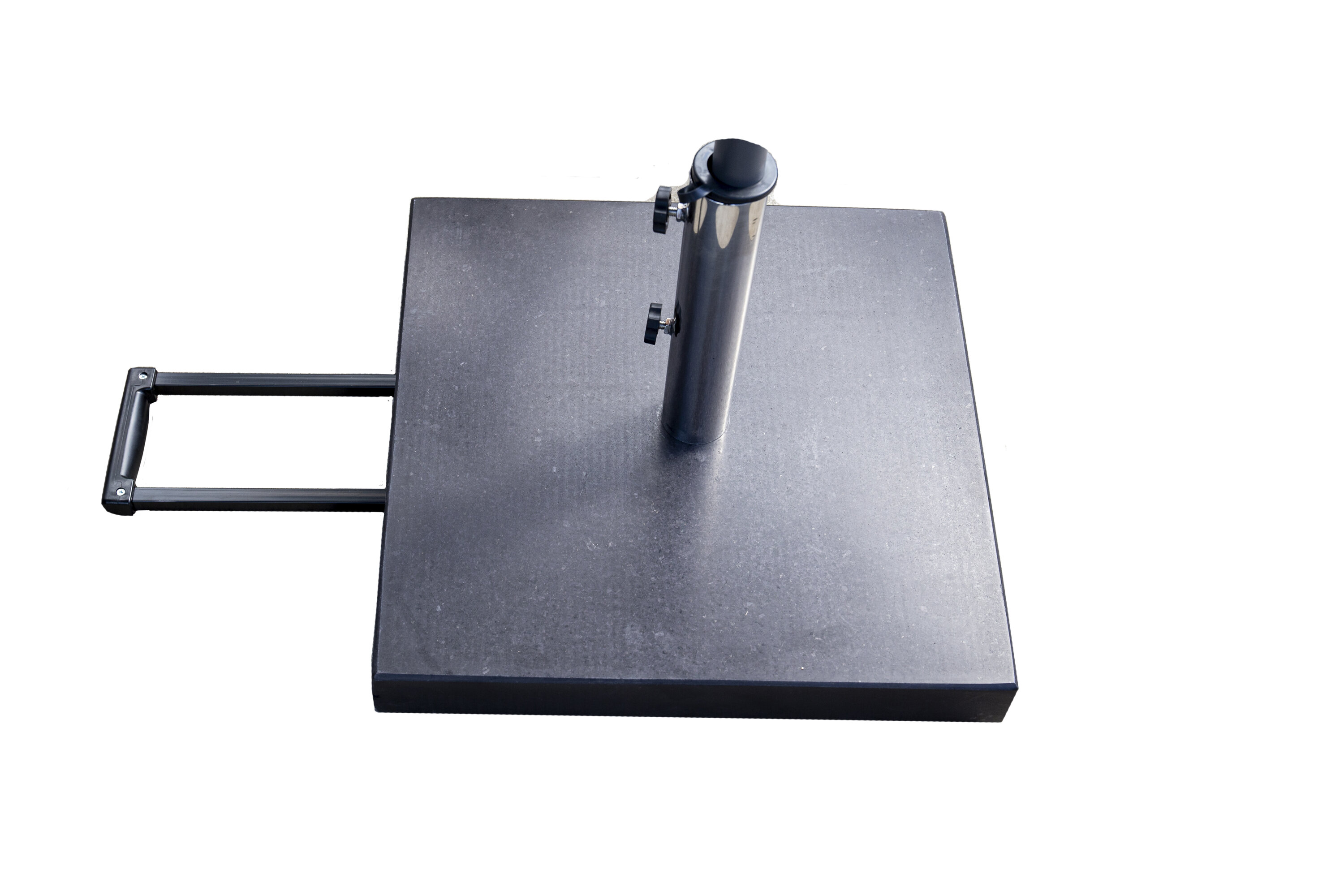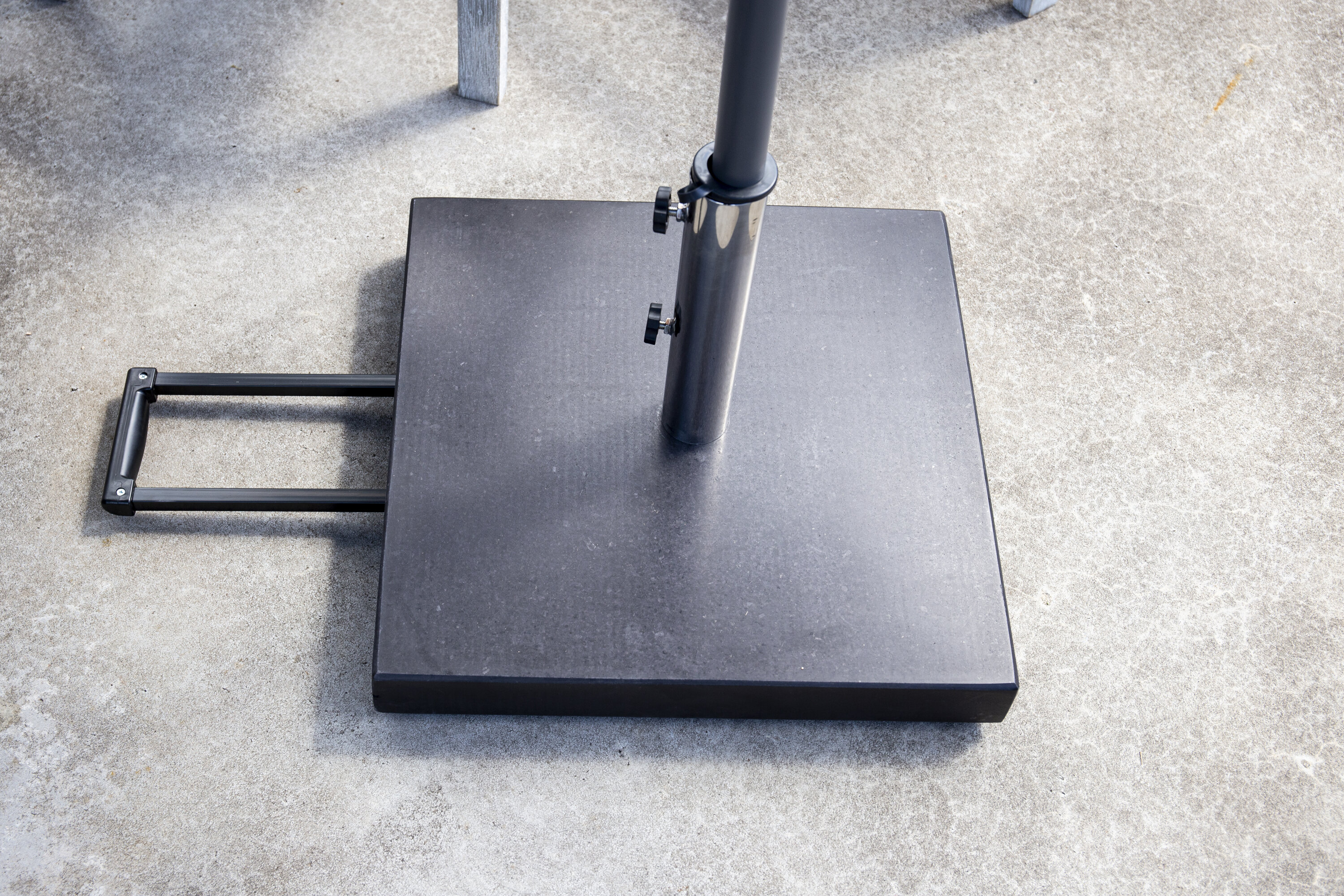 Schlichter und stilvoller Sonnenschirmstein in Schwarz. Robuste Konstruktion mit zwei Rädern und Griffen. Gewicht 40kg.
