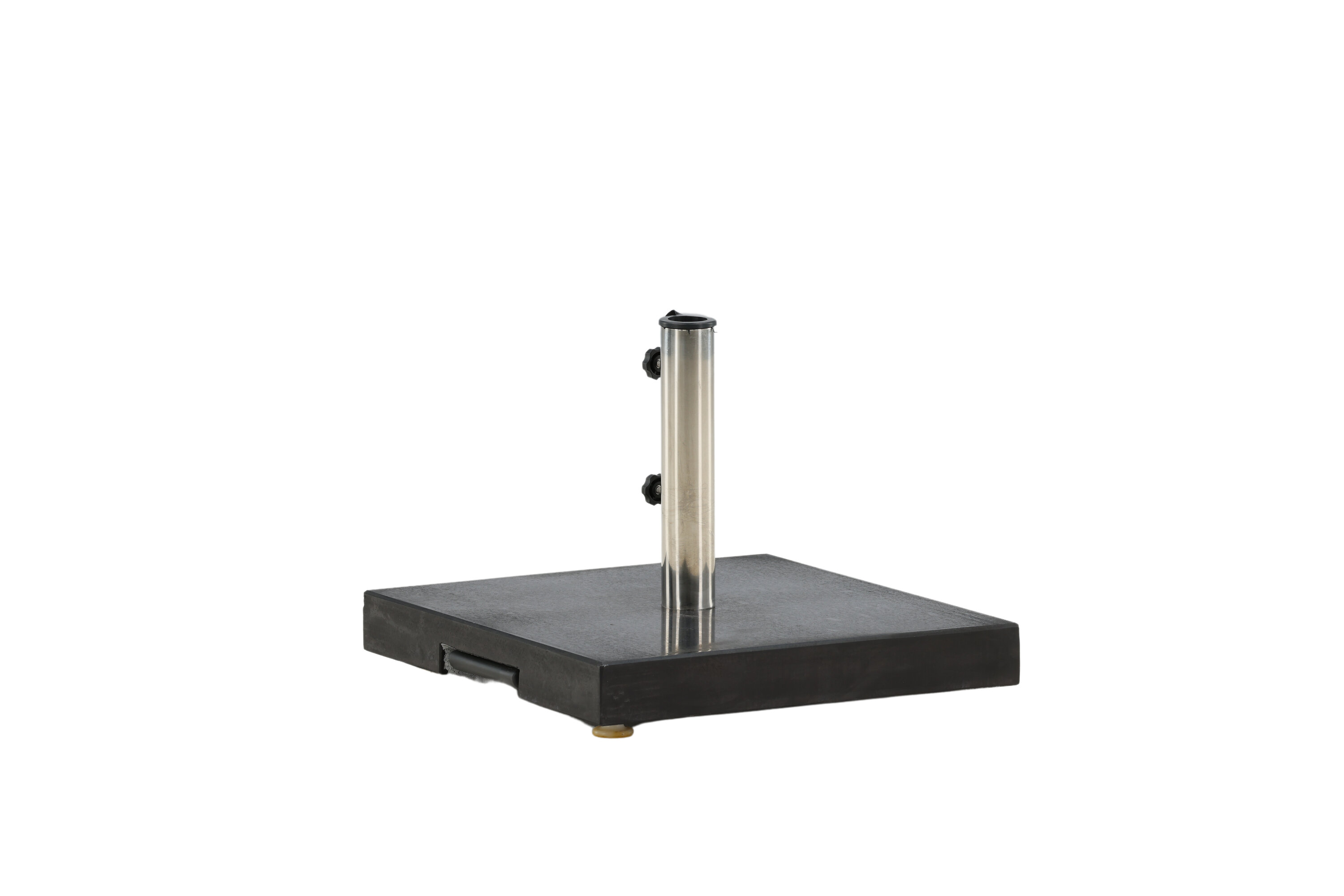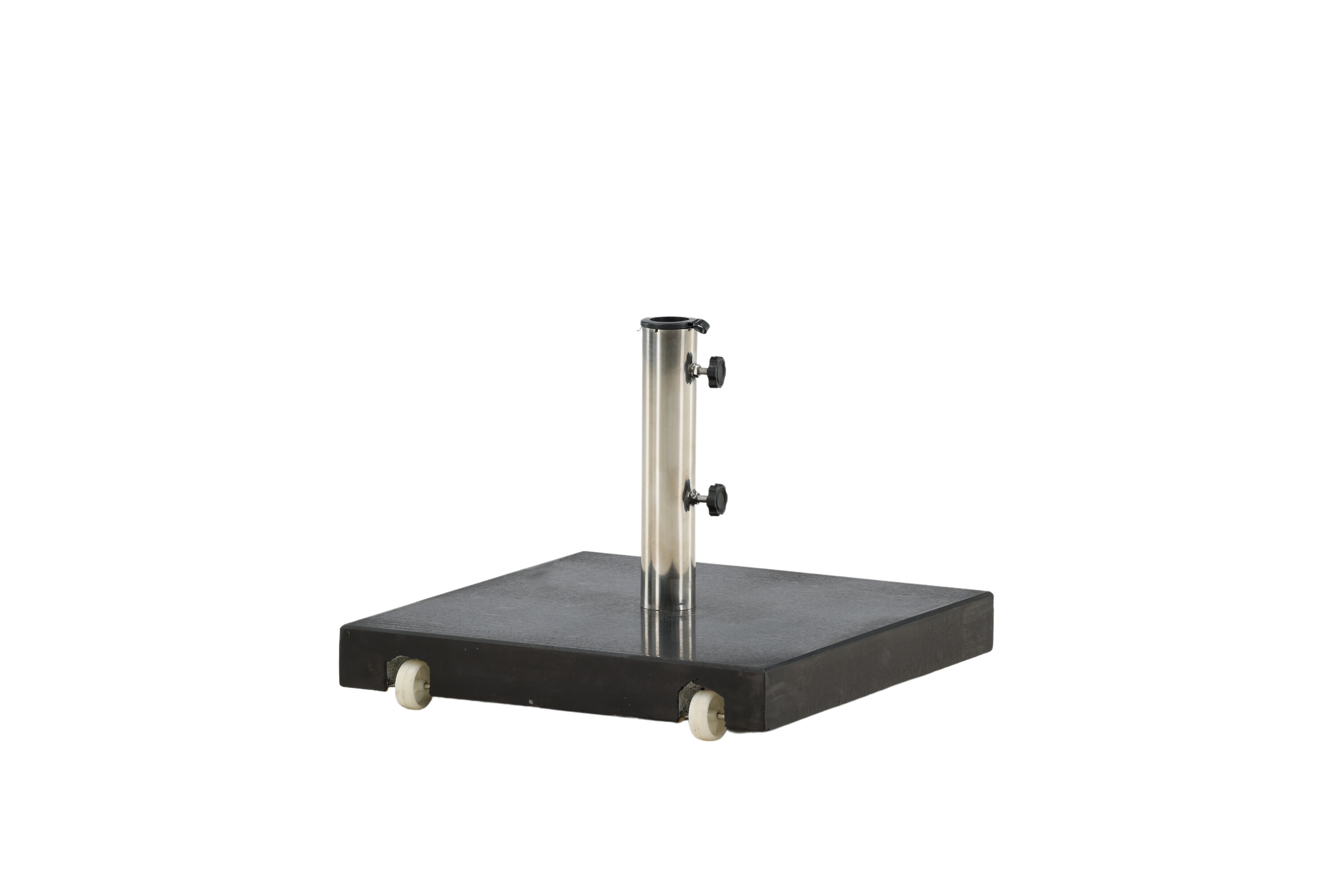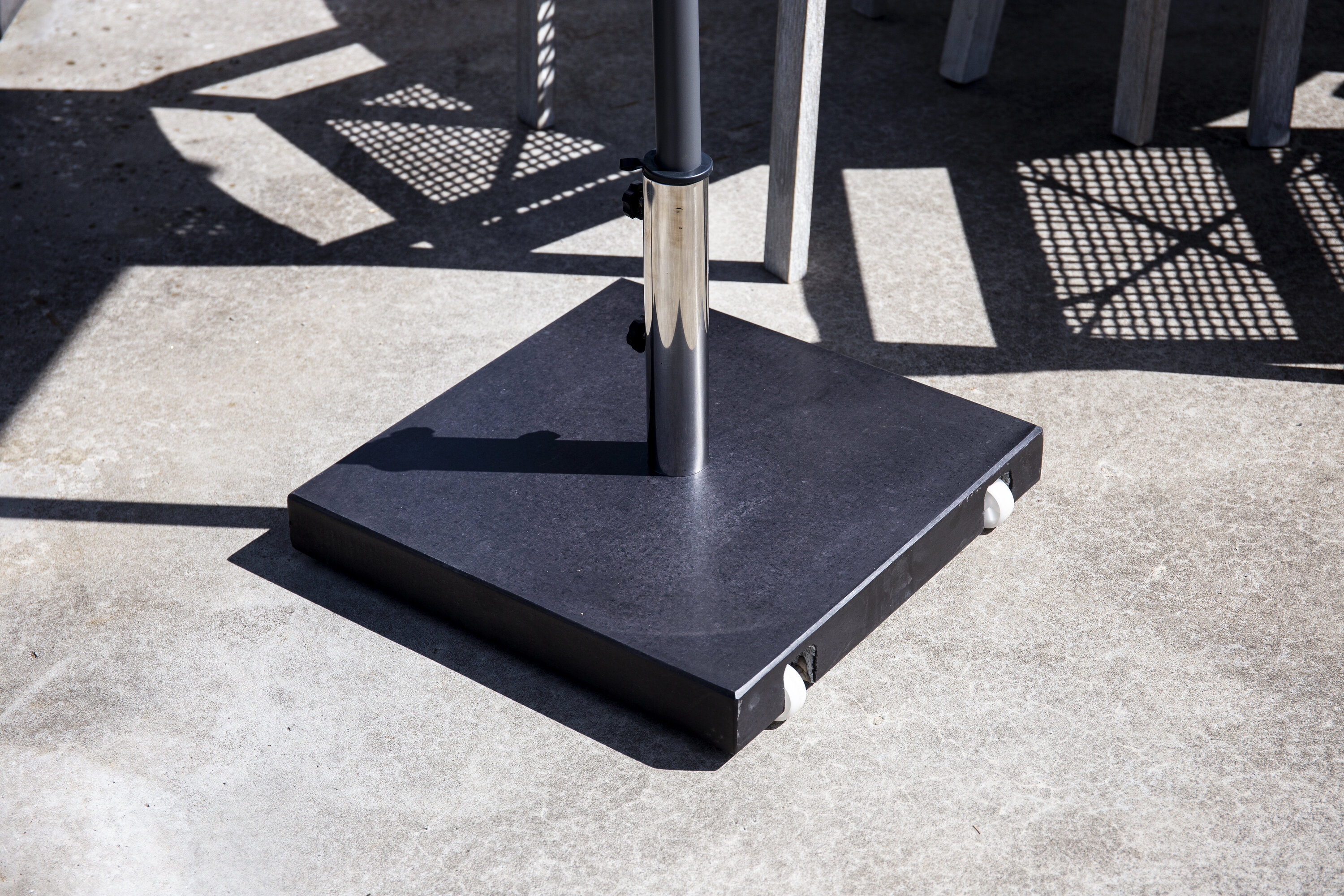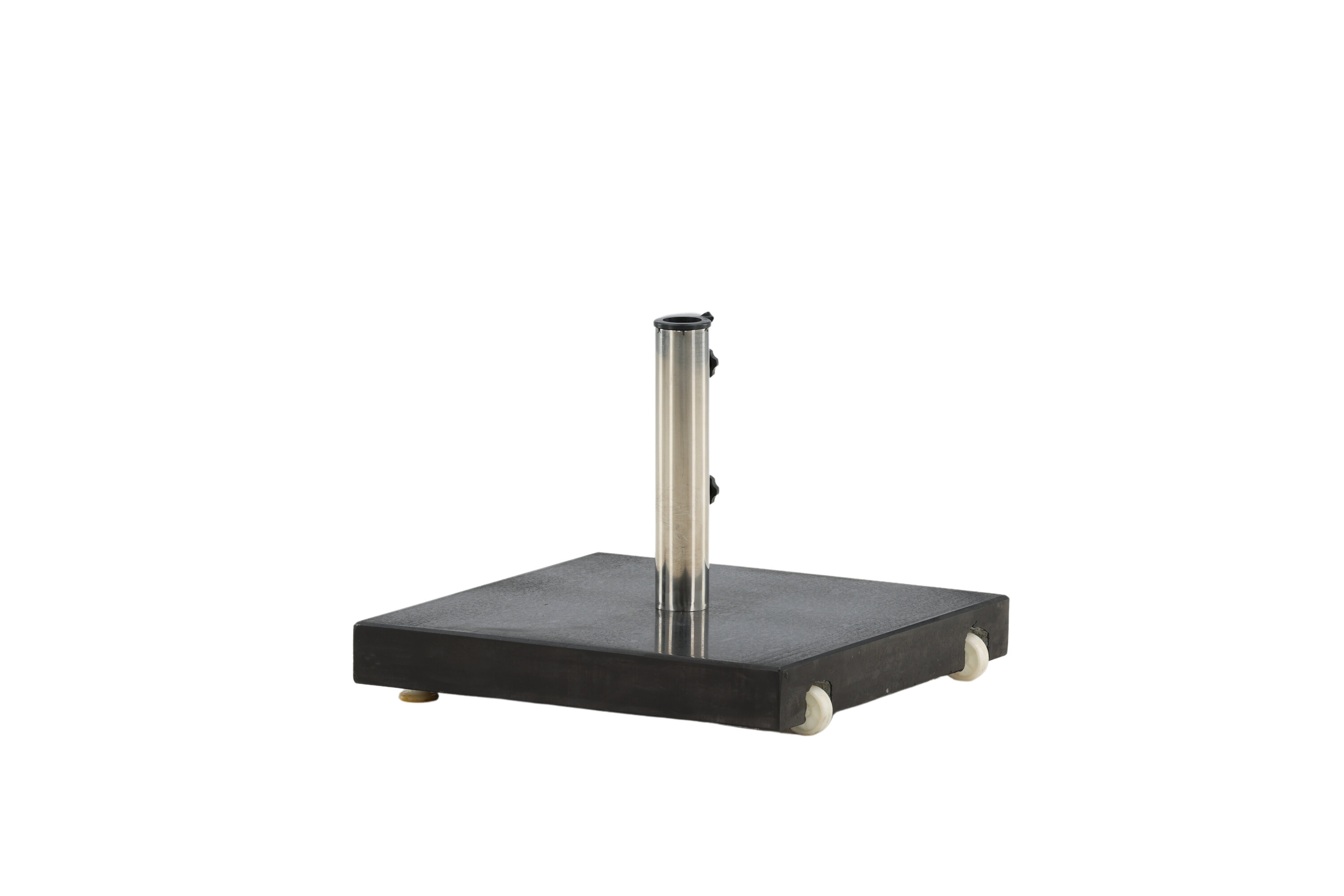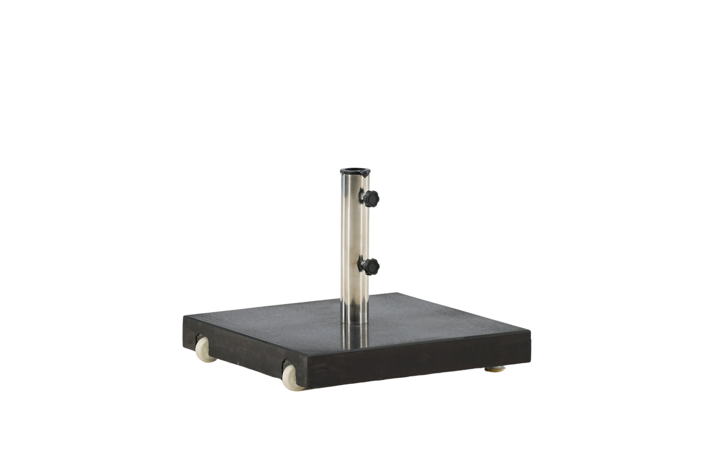 Schlichter und stilvoller Sonnenschirmstein in Schwarz. Robuste Konstruktion mit zwei Rädern und Griffen. Gewicht 40kg.