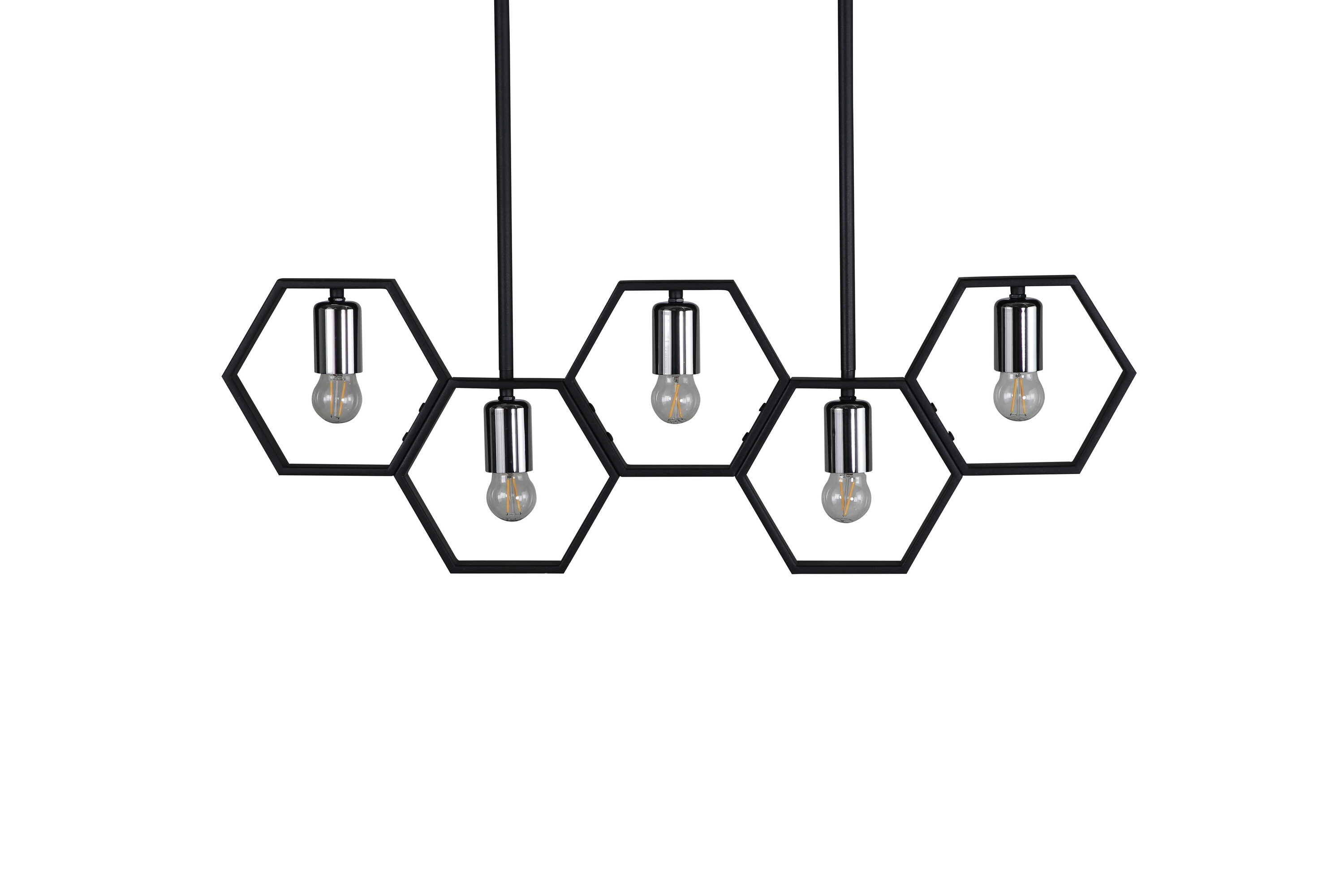 Mit Queen B erhalten Sie eine einzigartige und stilvolle Deckenleuchte, die sich von der Masse abhebt! Die Lampe hat einen dekorativen Rahmen aus schwarzem Stahl und vier kleinere Lichtquellen. Mit dieser Lampe erhalten Sie sowohl ein angenehmes Leuchten als auch ein schönes Innendetail für Ihr Zuhause. Die stilvollen Farben machen die Lampe leicht mit anderen Dekoren kompatibel, aber sie eignet sich eindeutig am besten über dem Esstisch!