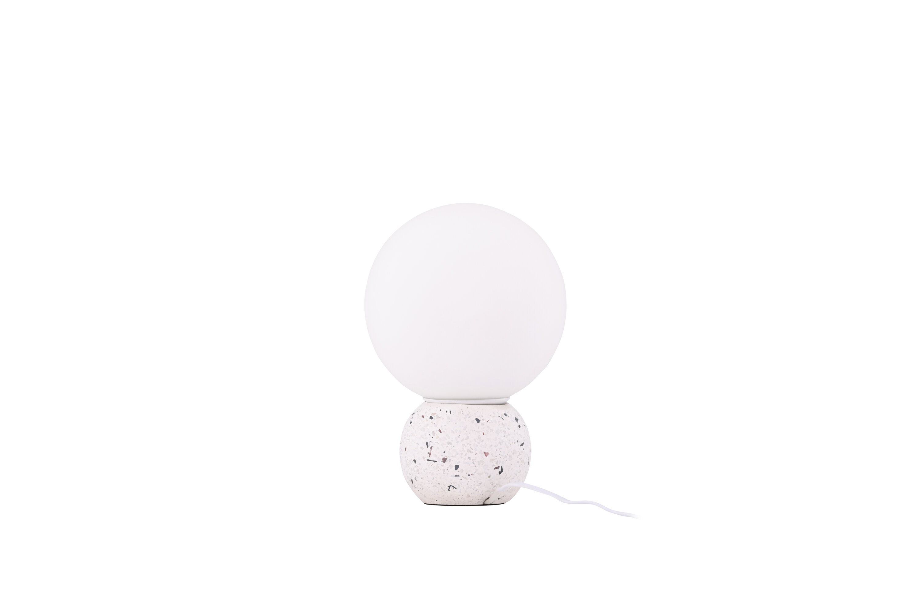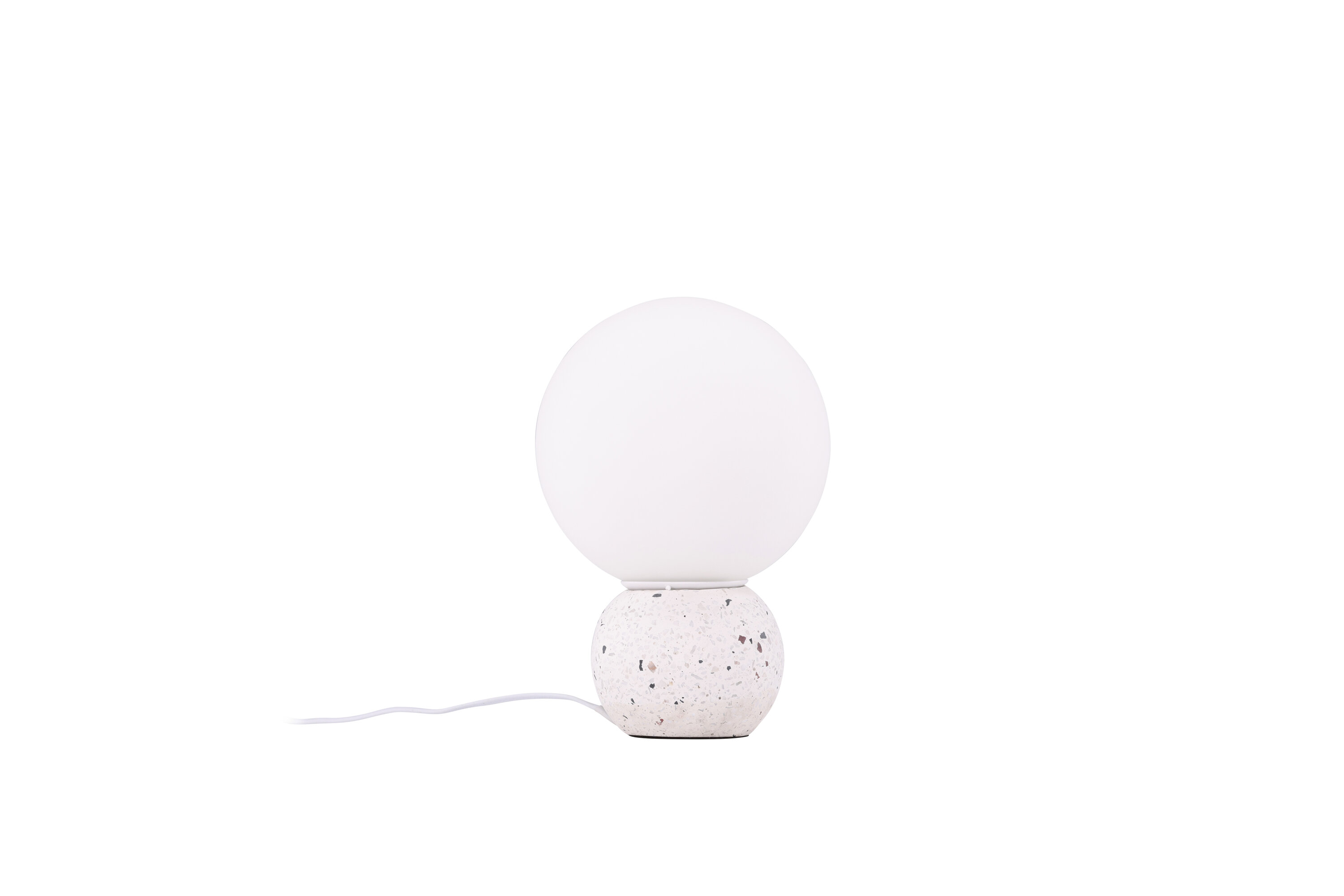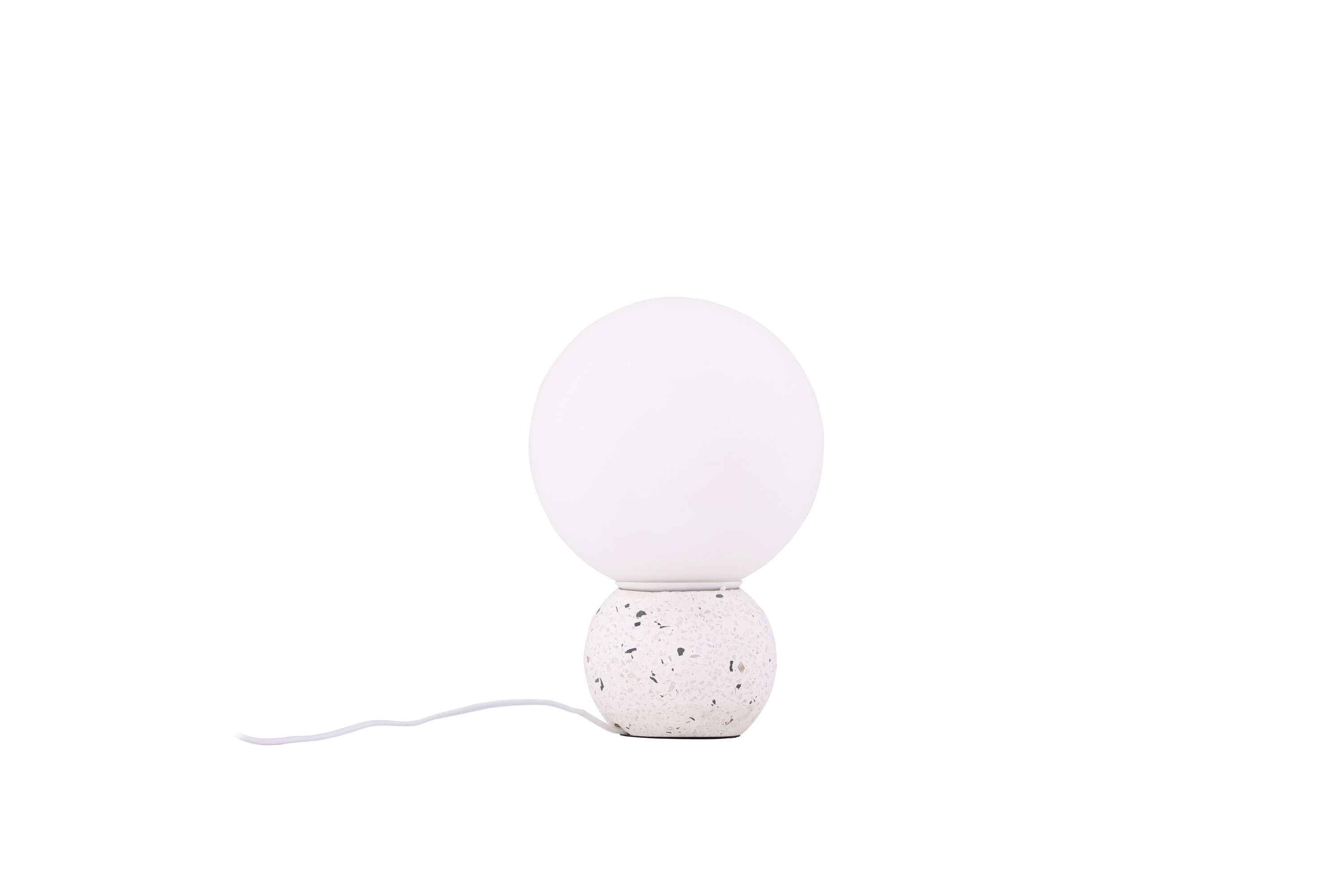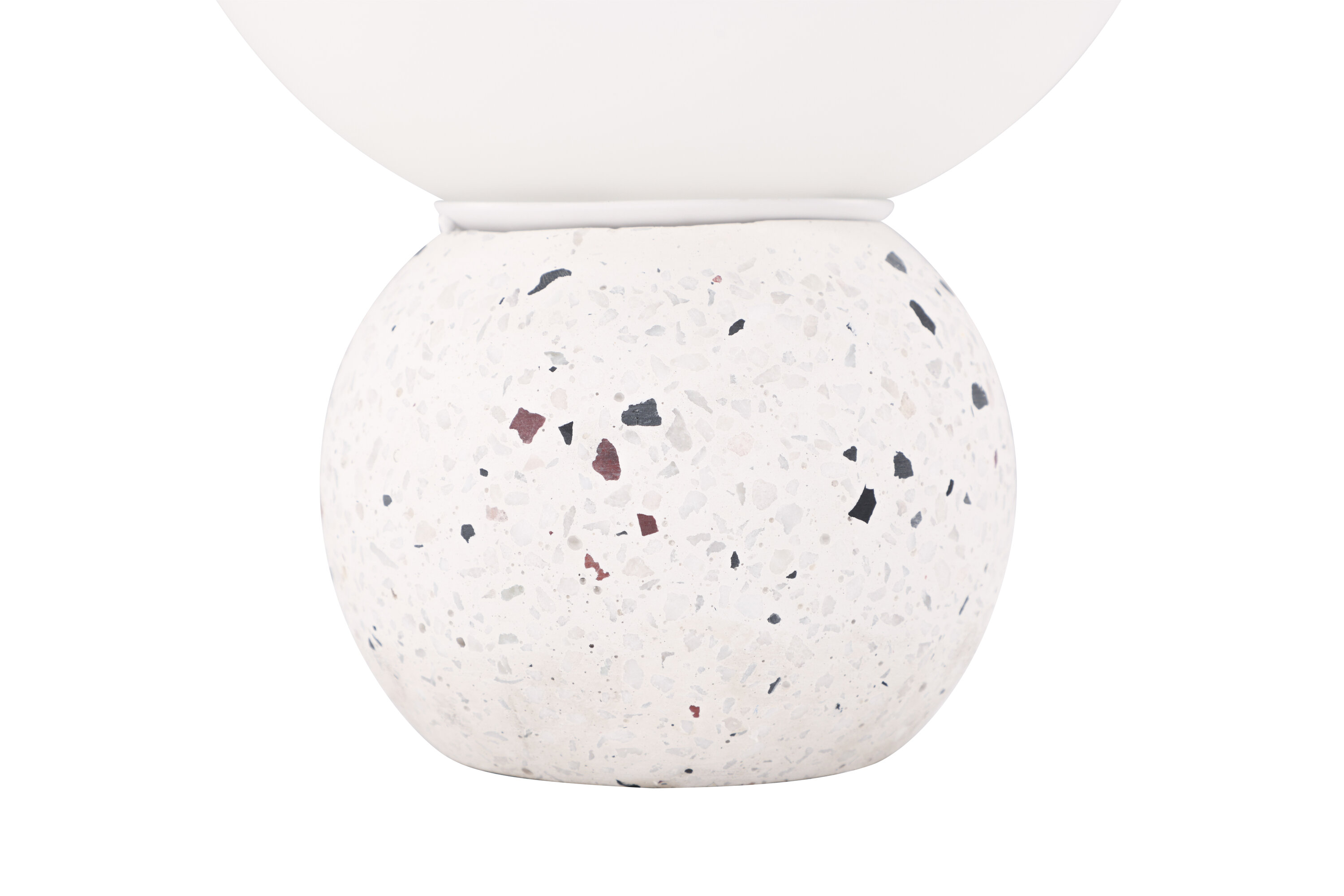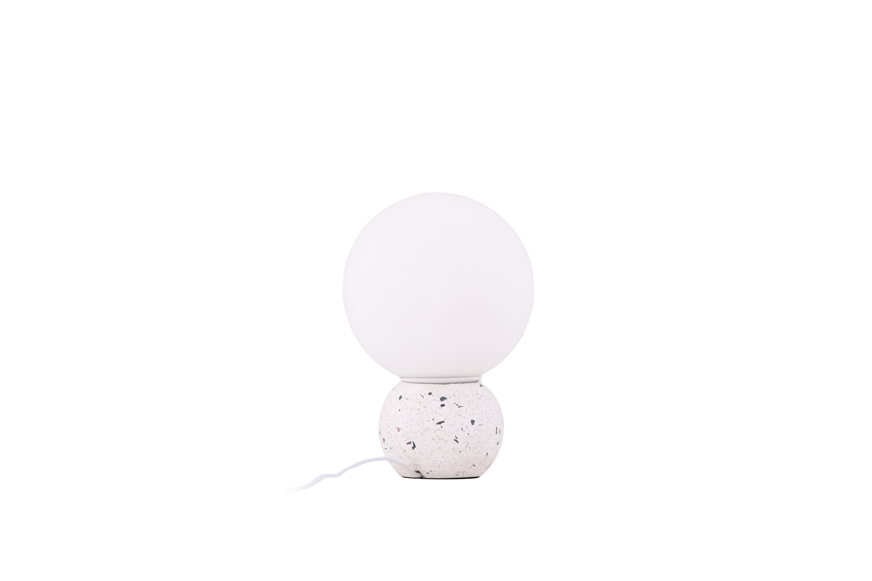 Metz ist eine trendige und stilvolle Tischleuchte mit einem Fuß in weißem Terrazzo mit schwarzen Elementen. Durch die stilvollen Farben passt die Lampe in die meisten Wohn- und Einrichtungsstile. Die Lampe hat eine weiße runde Glasschale, die angenehm mit Licht durchlässt und überall, wo sie aufgestellt wird, ein gemütliches Leuchten erzeugt. Das schöne Design ermöglicht es, die Lampe als Innendetail zu verwenden, um das Innere des Hauses zu heben.