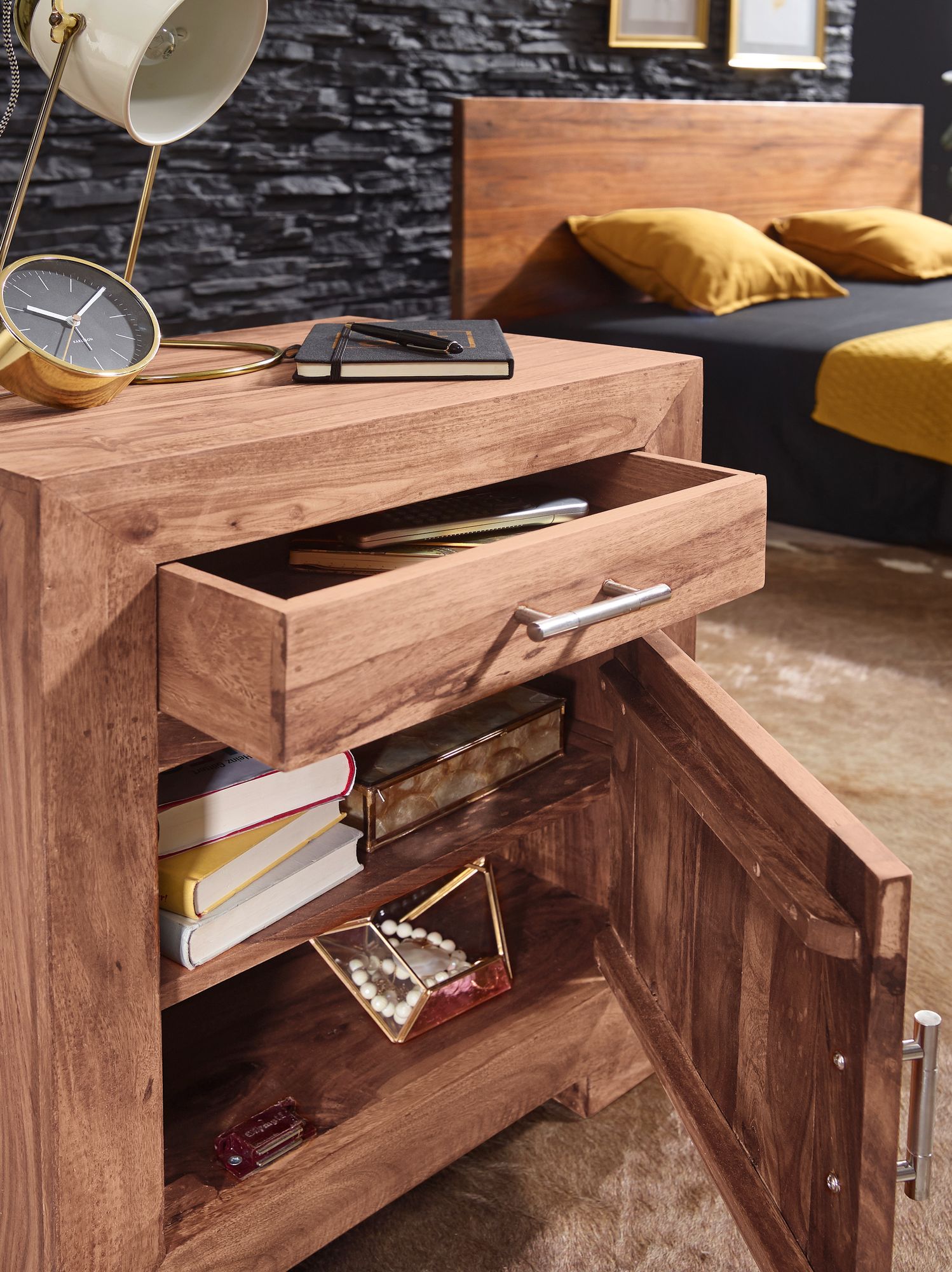 Nachttisch MUMBAI Massivholz Akazie Holzfarben 60 cm | Schublade | Tür