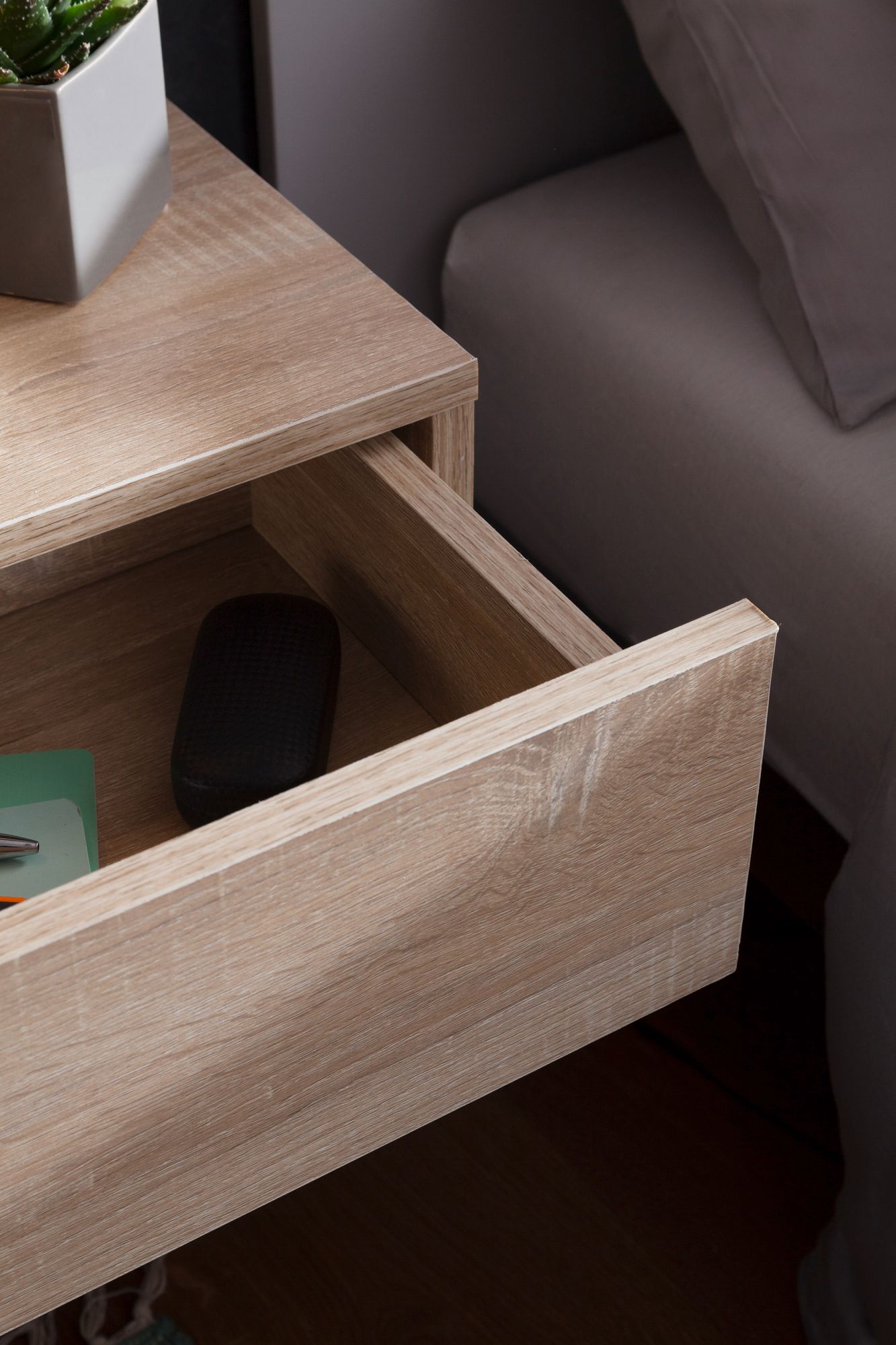 Wandmontierte Nachtkonsole im zeitlosen Design, ideal zur Platzoptimierung im Schlafzimmer. Die schlichte rechteckige Ablagefläche bietet Platz für Lampe, Wecker und Co. Die herausnehmbare Schublade eignet sich zur Aufbewahrung von Büchern, Brille und Medikamenten.
