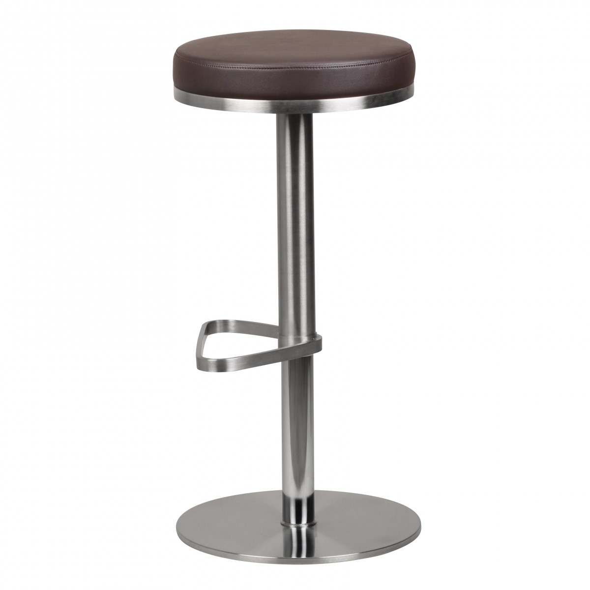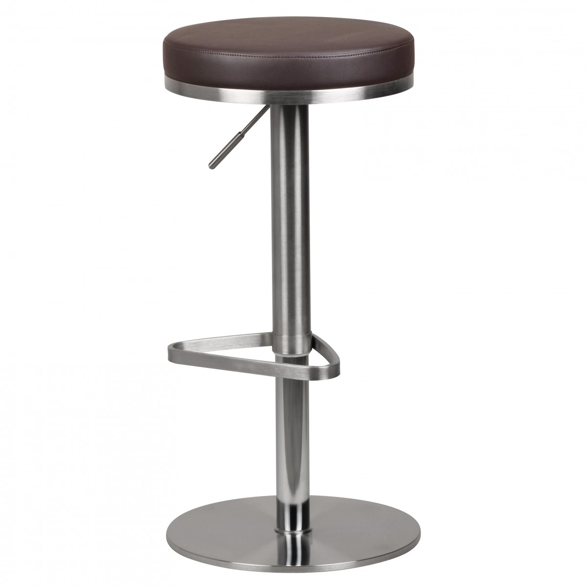 Moderner Barhocker mit verchromtem Edelstahlgestell und runder, großzügig gepolsterter brauner Sitzfläche für besten Sitzkomfort. Die Sitzhöhe ist von 57 bis 82 cm höhenverstellbar und ermöglicht eine perfekte Anpassung an Körpergröße und Raum.