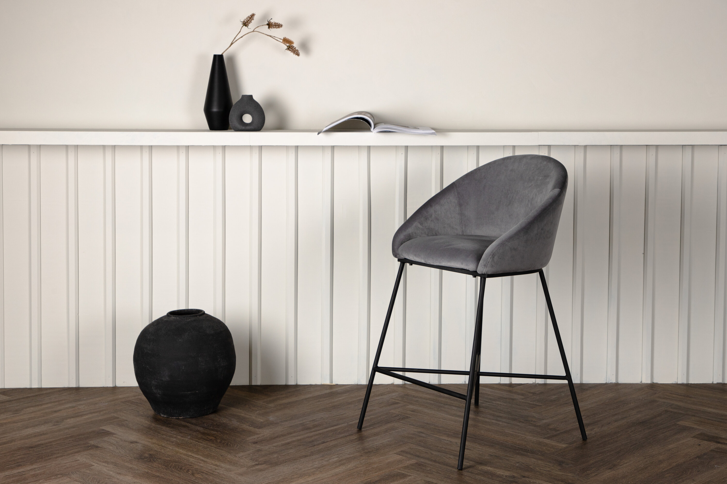 Ein moderner Barhocker aus der Velvet-Serie in stilvollem Grau! Dieser Barhocker gehört zur Venture Home Kollektion und verfügt über ein komplett gepolstertes Design mit leicht abgerundeter Rückenlehne und Sitzfläche aus weichem Samt und minimalistischen Beinen aus schwarz pulverbeschichtetem Metall - garantiert so bequem wie auffällig. Möblieren Sie rund um den hohen Esstisch oder an der Küchenbar und verlängern Sie gemeinsam angenehme Momente!
