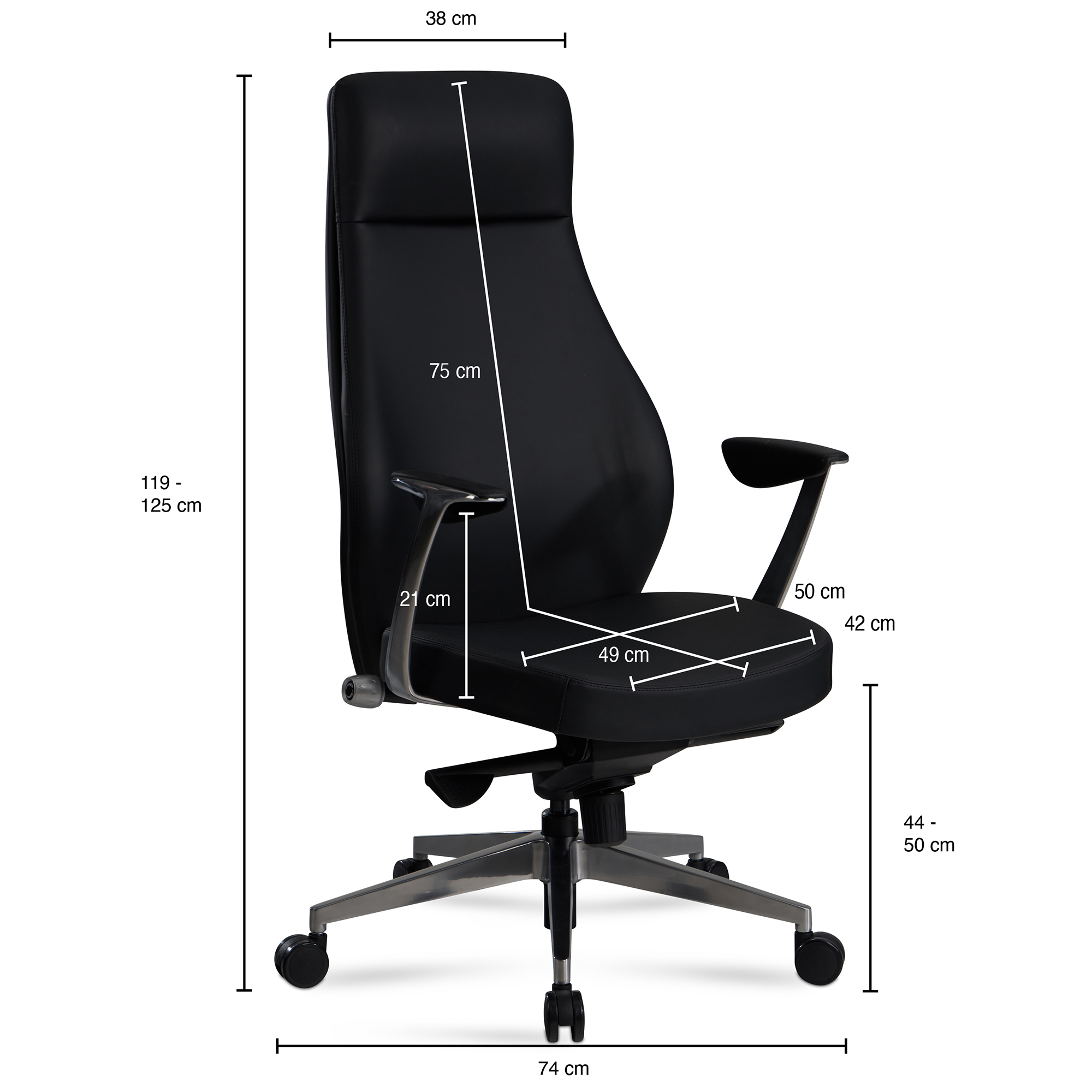 Produktinformationen "Bürostuhl Schwarz Kunstleder | Ergonomischer Chefsessel | H 119-125 cm B 74 cm T 74 cm"