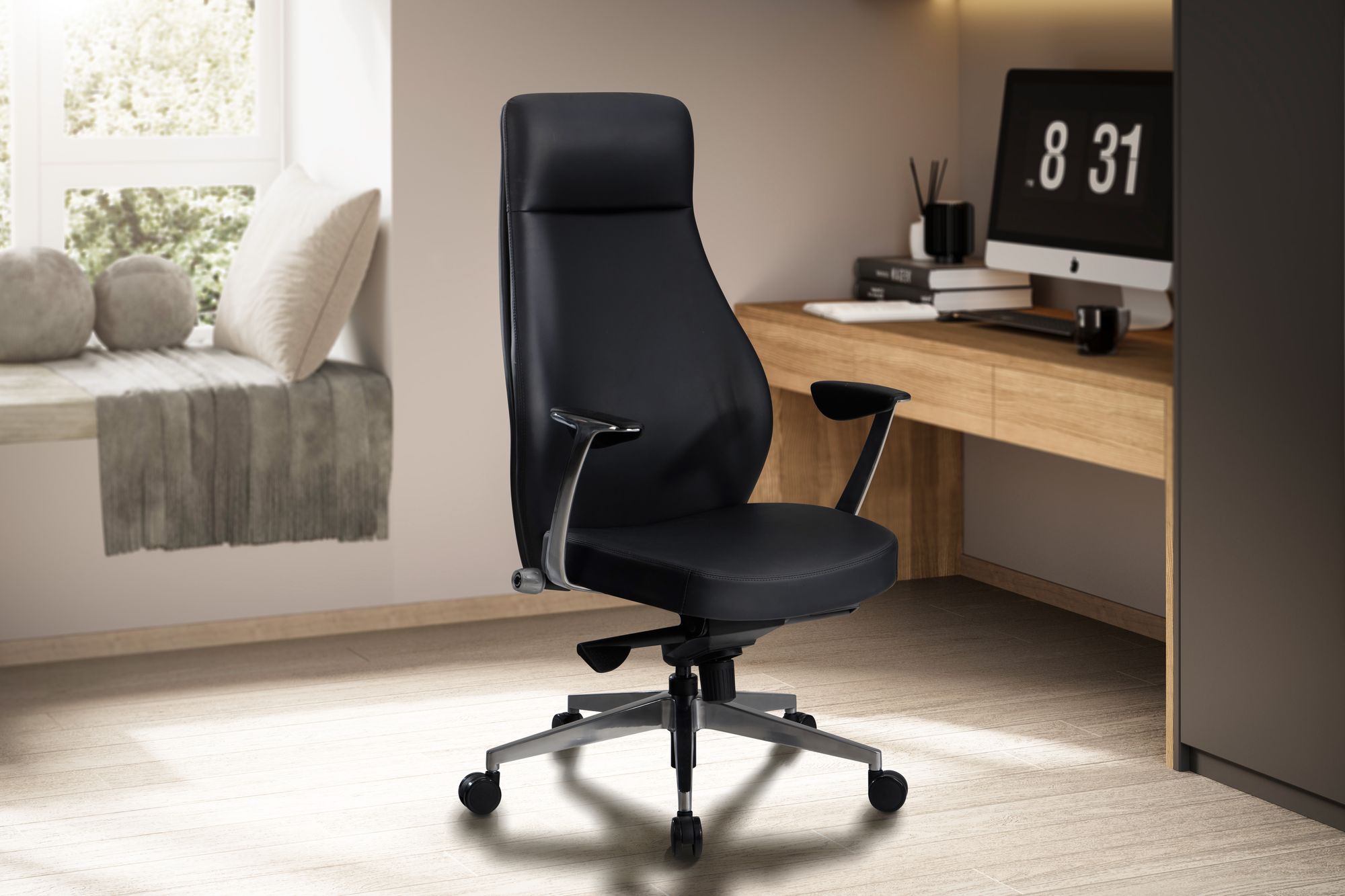 Dieser Bürostuhl aus schwarzem Kunstleder verbindet ergonomischen Komfort mit einem eleganten Chefsessel-Design und trägt bis zu 120 kg. Ideal für anspruchsvolle Büroanwendungen.