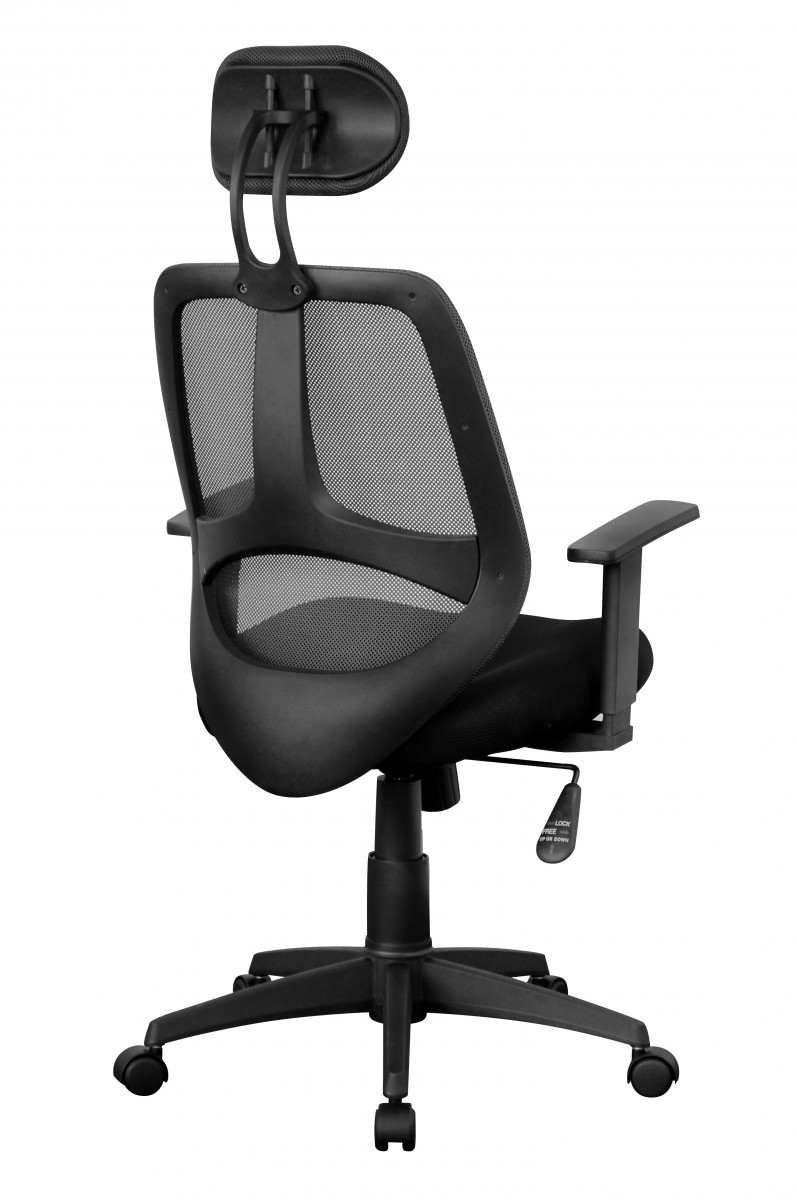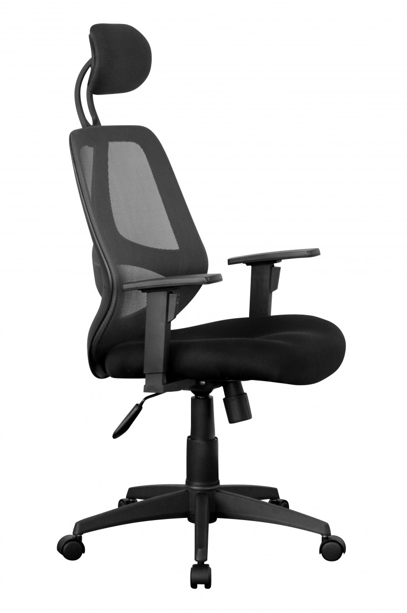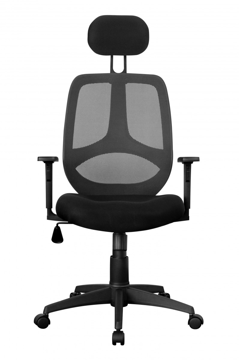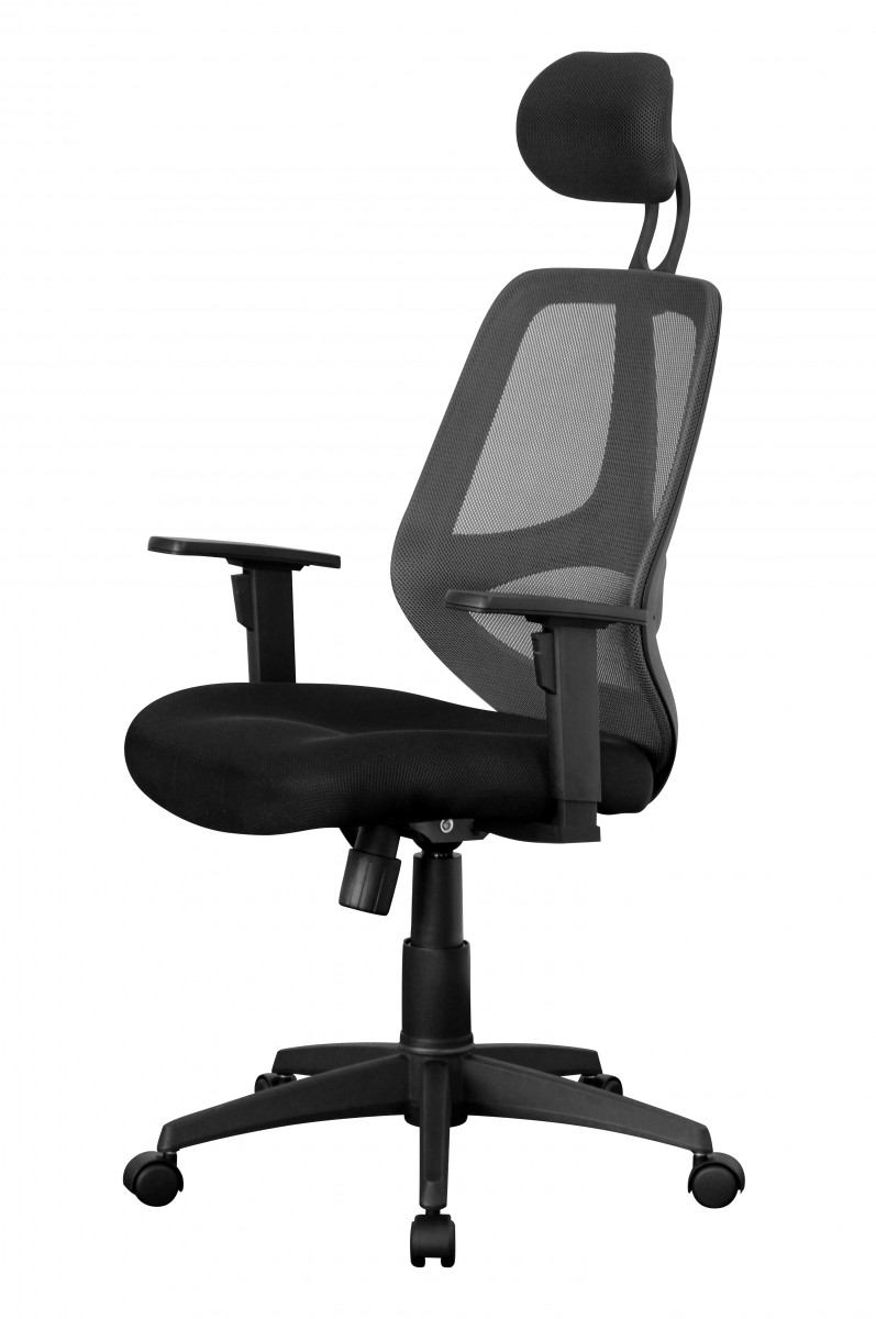 Ergonomischer Bürostuhl mit schwarzem Stoffbezug, geeignet für bis zu 8 Stunden komfortable Nutzung täglich. Verfügt über gut gepolsterte Sitzfläche, höhenverstellbare Kopfstütze und Armlehnen sowie lendenwirbelfördernde Rückenlehne mit atmungsaktivem Netzbezug.