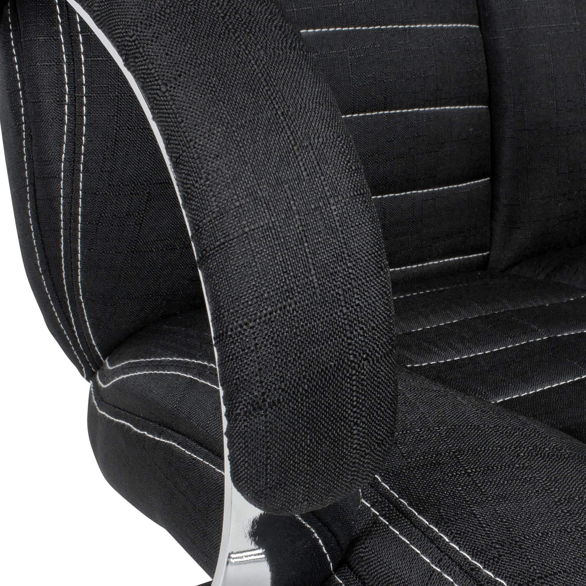 - Farbe: Schwarz mit weißen Nähten, silbernes Fußkreuz und Armlehnen
