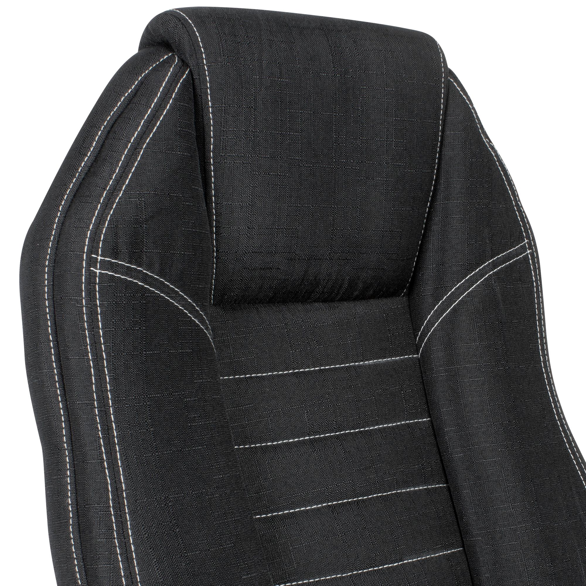Dieser drehbare Bürostuhl in schwarzem Stoff mit Jeansoptik besticht durch seine weiche Polsterung und weißen Kontrastnähte. Die höhenverstellbare Sitzfläche und hohe Rückenlehne sorgen für ergonomischen Sitzkomfort.