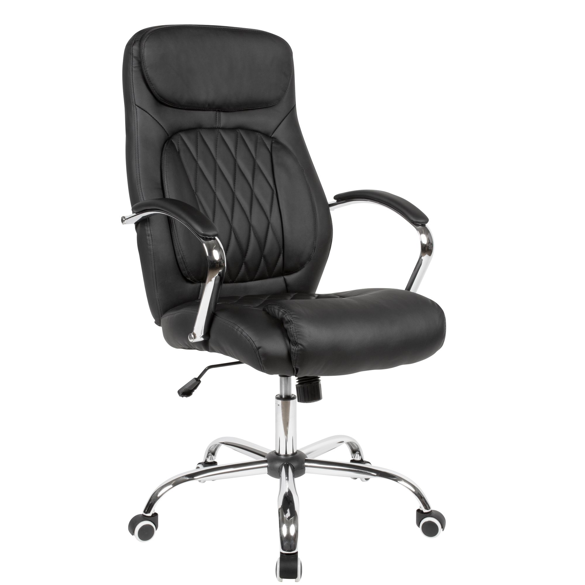 Dieser schwarze Bürodrehstuhl aus Kunstleder verbindet Eleganz und Komfort für intensive Nutzung. Modernes Design mit weicher Polsterung und Rautenmuster auf Sitzfläche und Rückenlehne sorgt für angenehmes Sitzen. Armlehnen und das stabile Fußkreuz aus Stahl bieten hohe Standfestigkeit bis 120 kg Belastung.