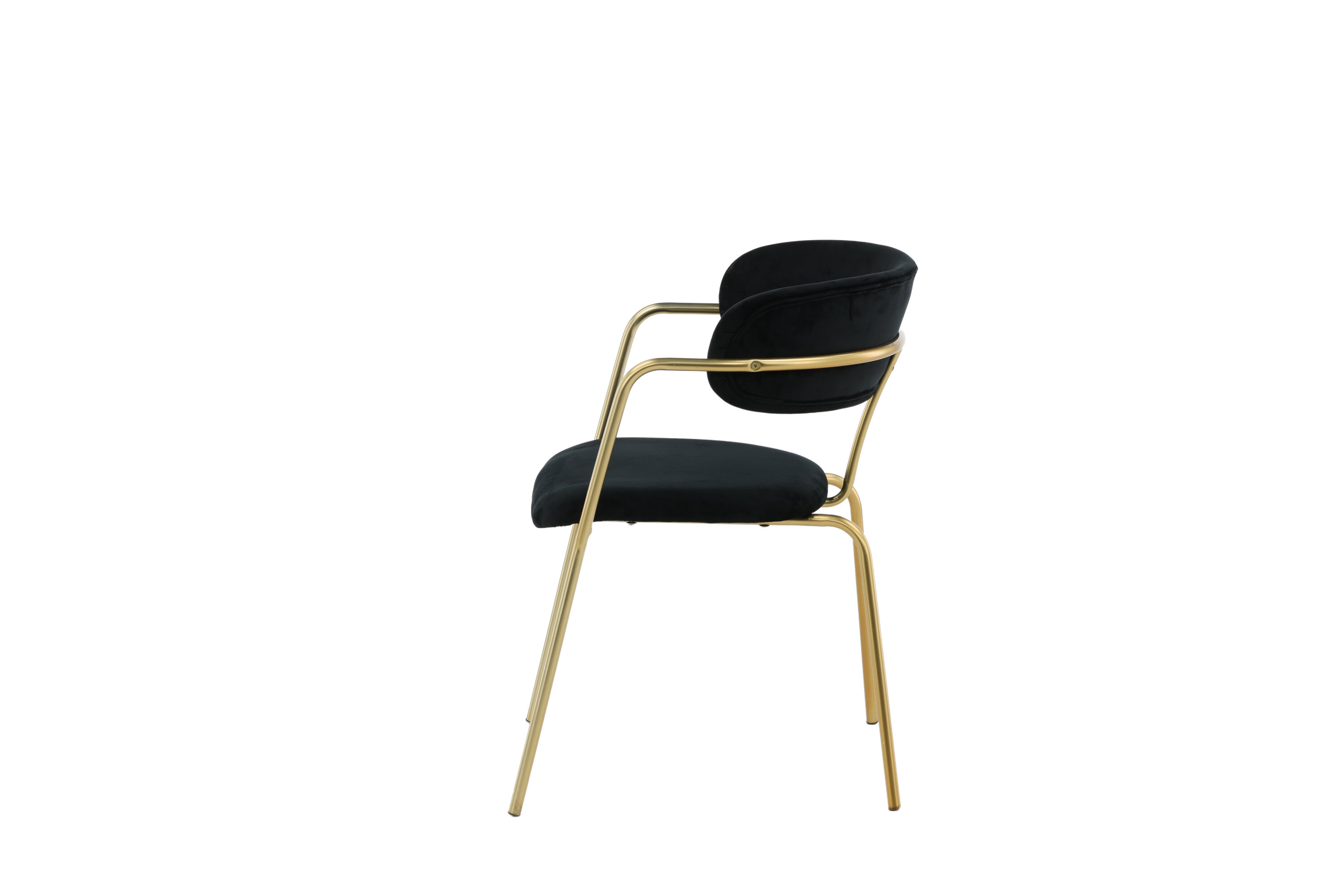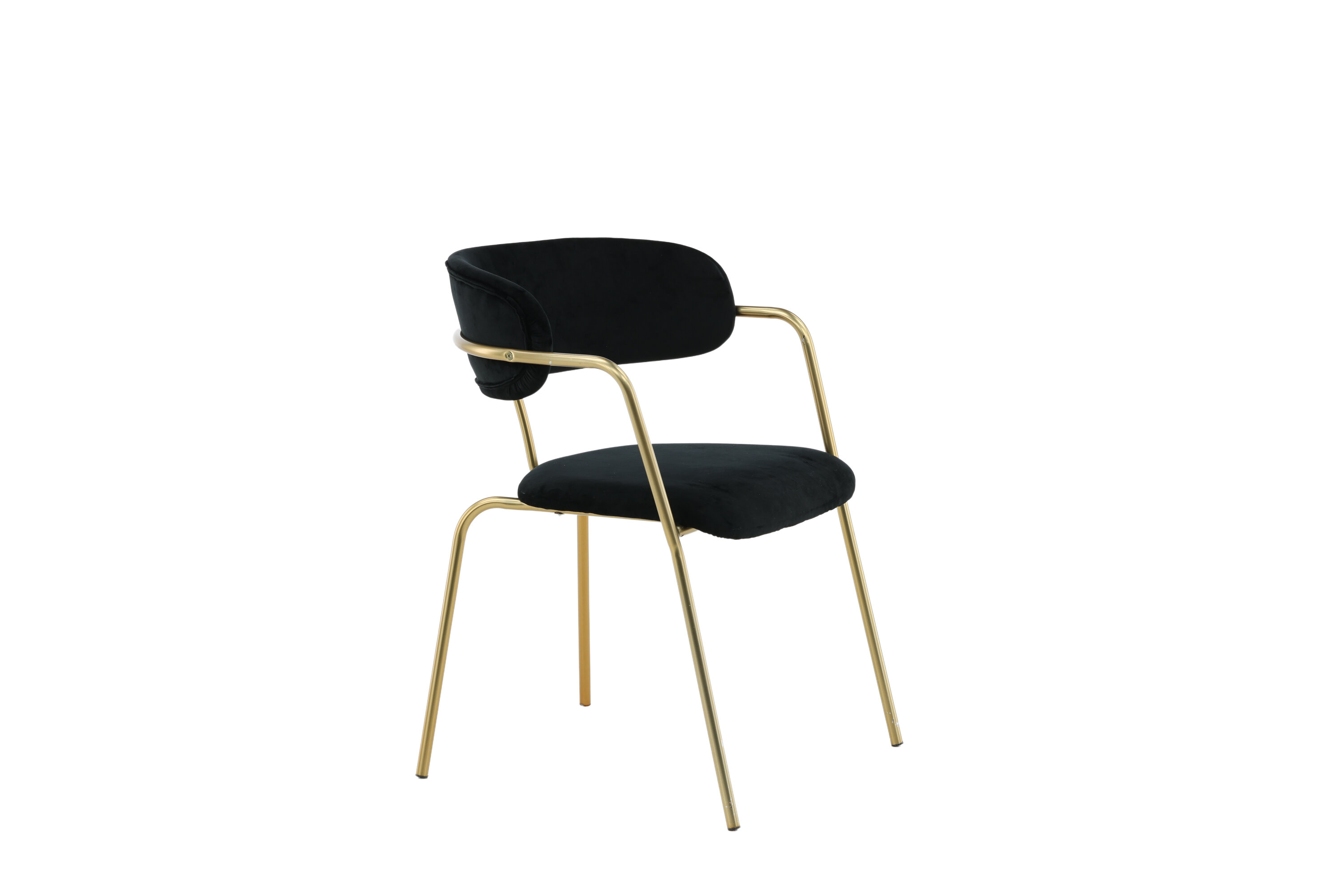 Kreieren Sie einen trendigen Hingucker im Herzen des Hauses! Dieser stilvolle Esszimmerstuhl aus der Arrow-Serie verfügt über einen modernen Rahmen mit Beinen und integrierten Armlehnen aus Messingfolienmetall. Die Rückenlehne ist im gleichen Material wie der Sitz leicht abgerundet, schwarzer Samtstoff gestoppt. Heben Sie die Einrichtung in Ihrem Zuhause auf das nächste Level! Leichtere Montage ist erforderlich.