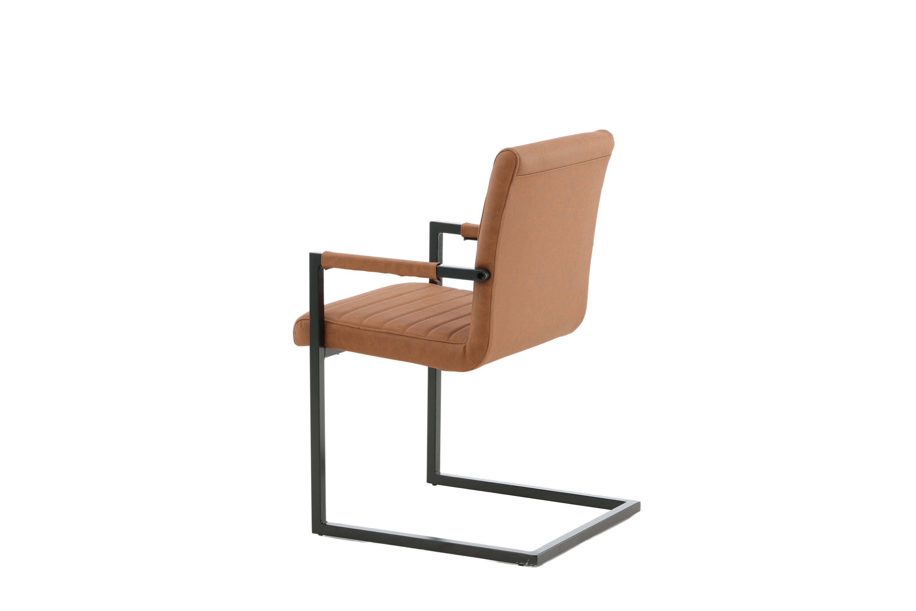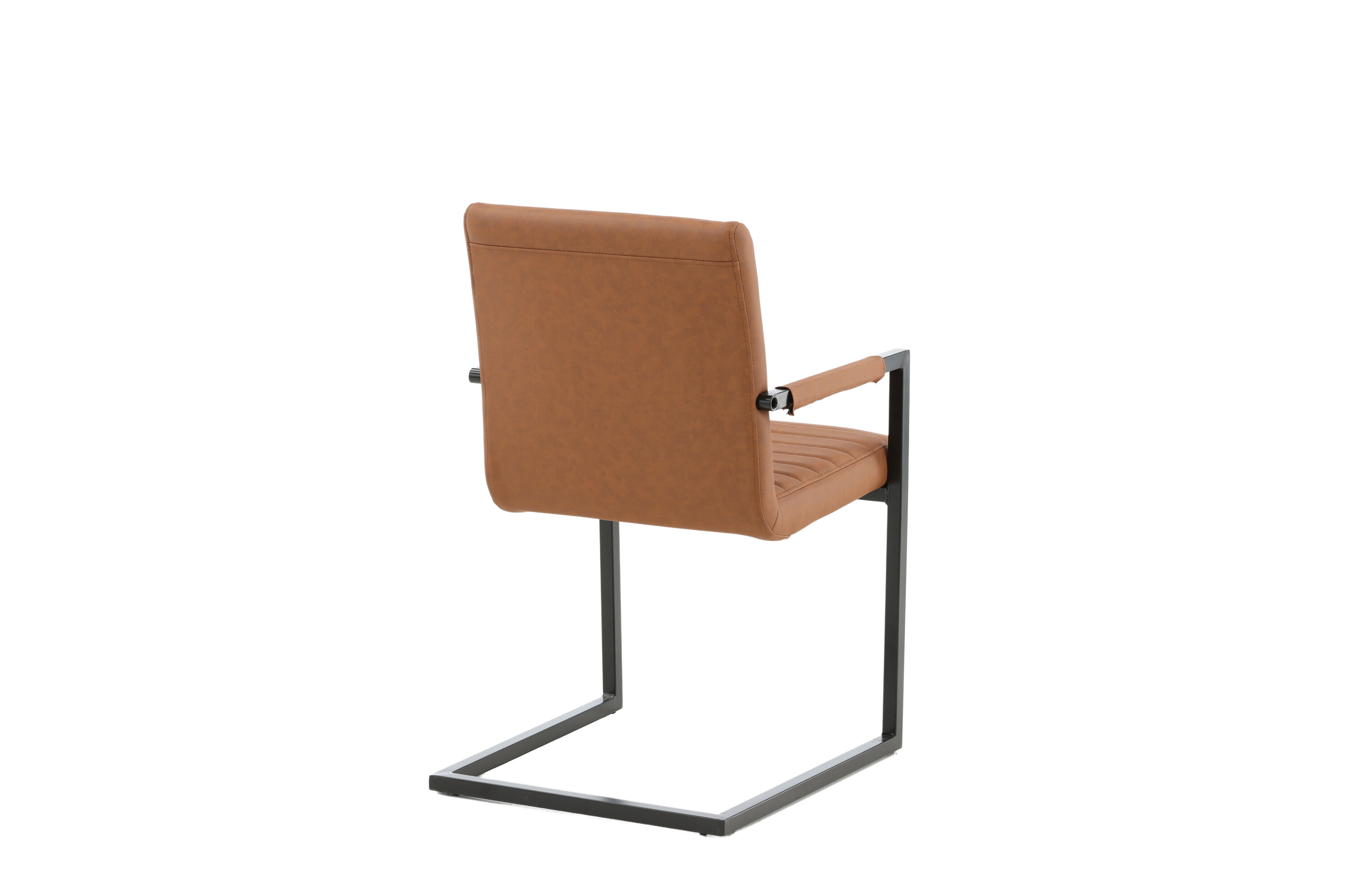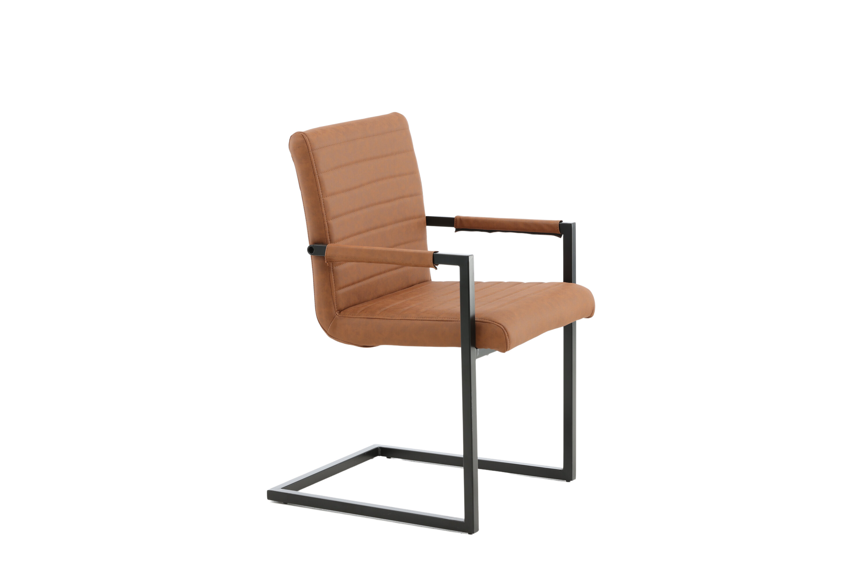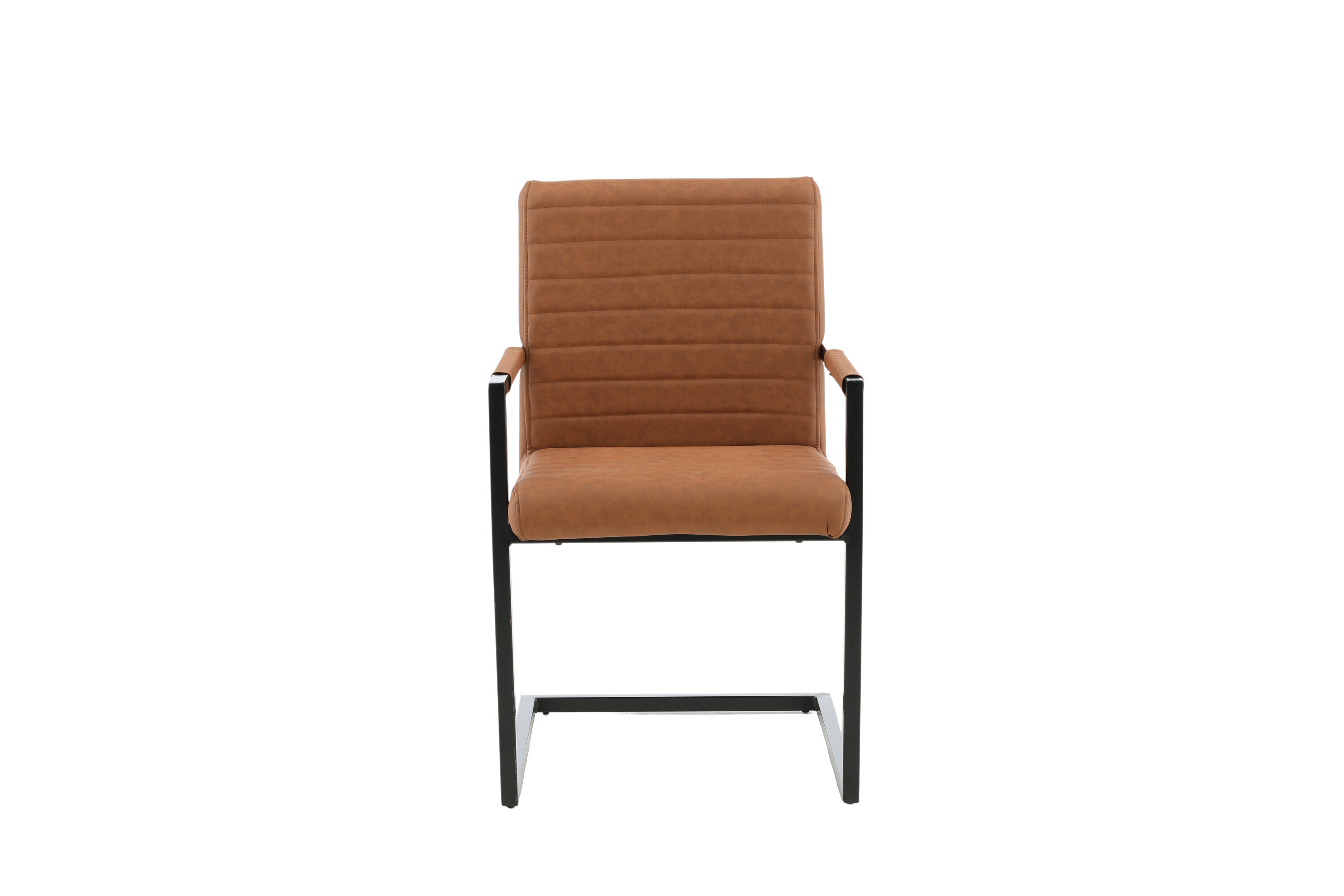 Esszimmerstuhl in der Serie Art bietet Ihnen einen Sessel/Sessel in einem industriellen, voll bekleideten Design, mit einem rustikalen Untergestell und integrierter Armlehne aus schwarz pulverbeschichtetem Metall. Breite Rückenlehne und Sitzfläche für zusätzlichen Komfort in braunem Kunstleder mit Ziernähten auf der Innenseite der Rückenlehne und Sitzfläche in einem schönen Muster. Leichtere Montage ist erforderlich.