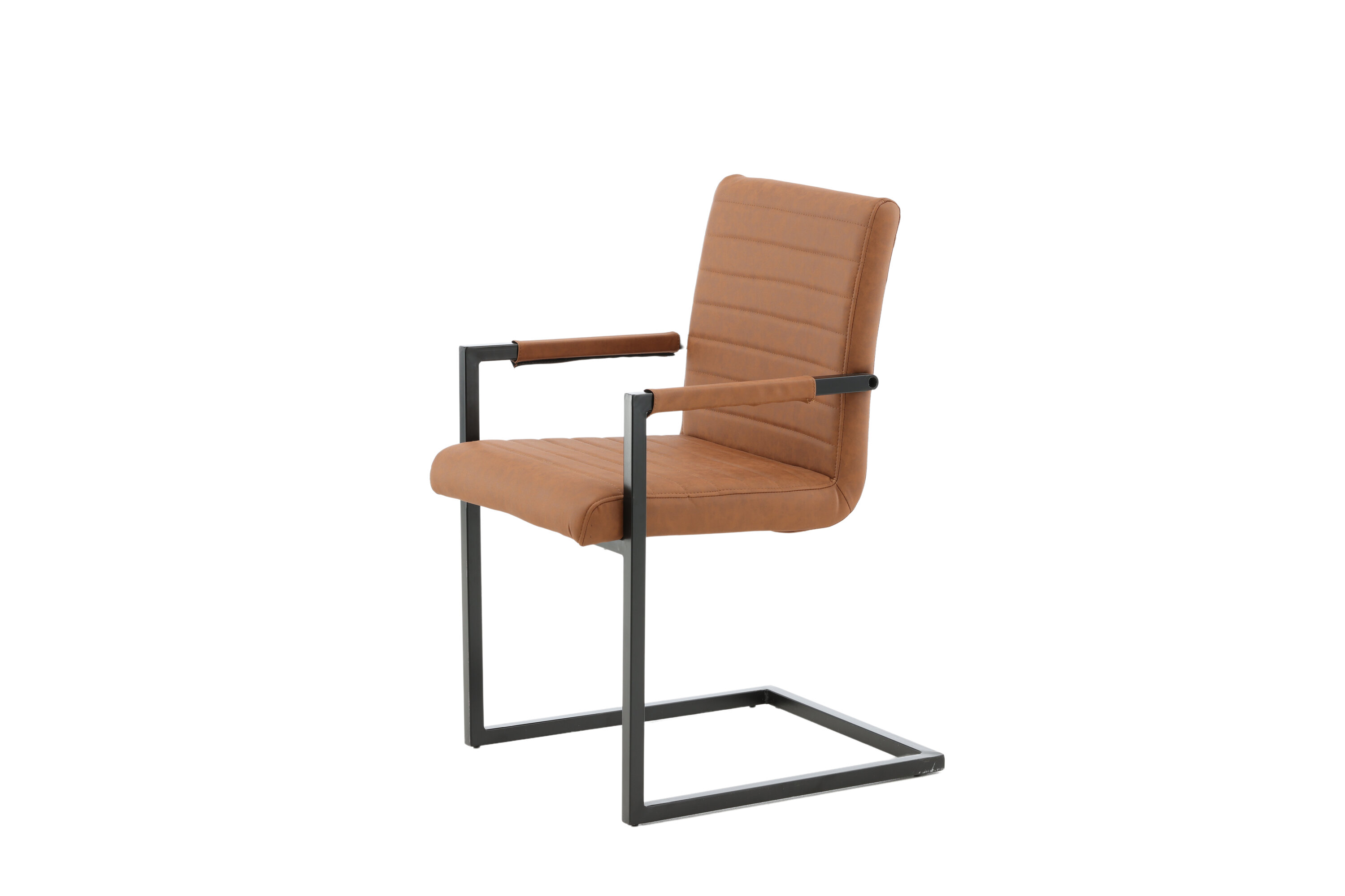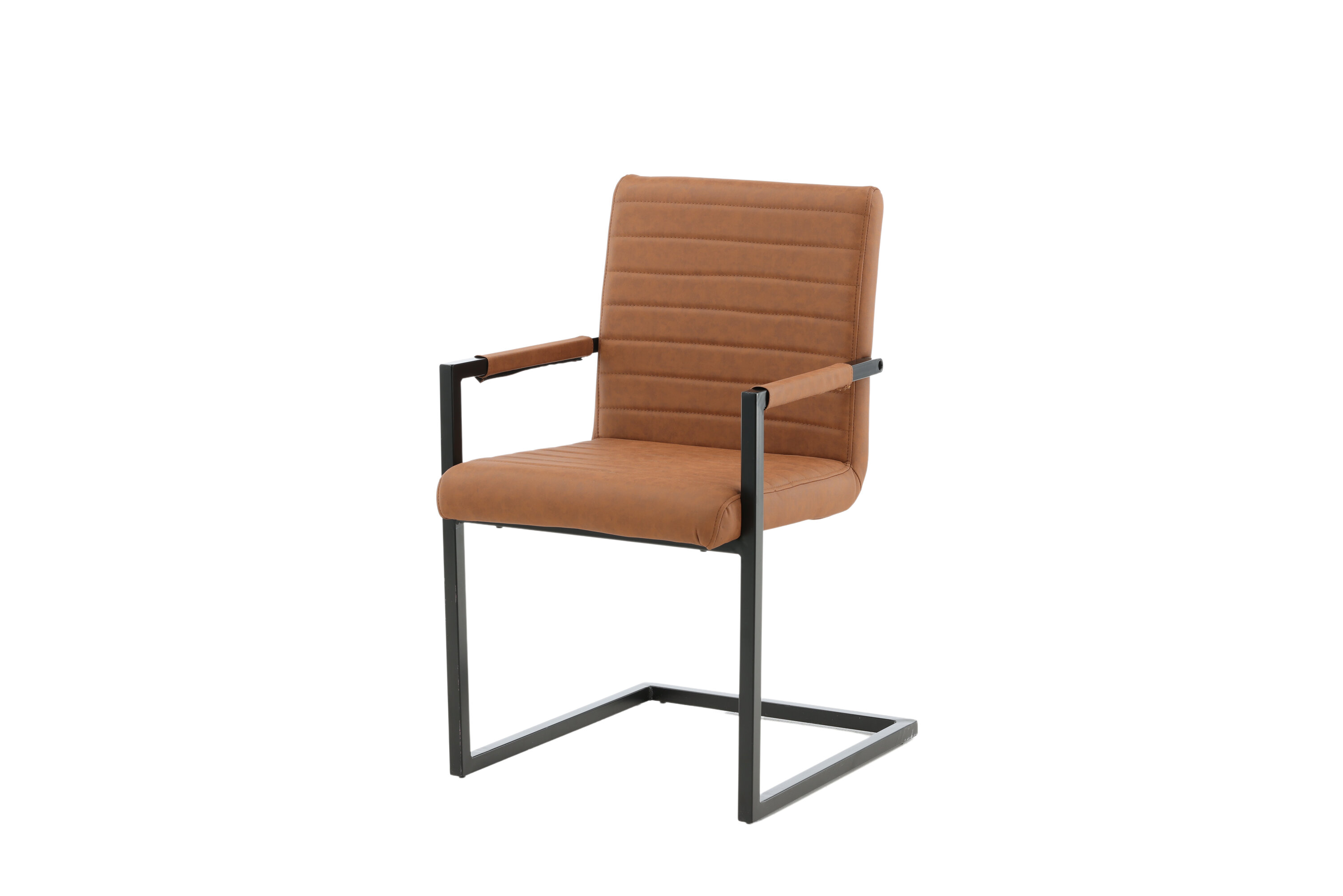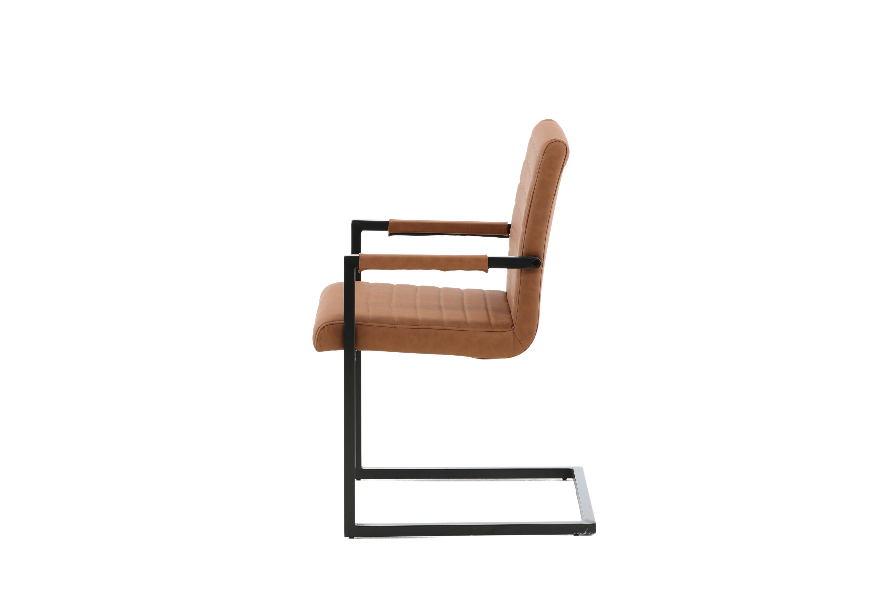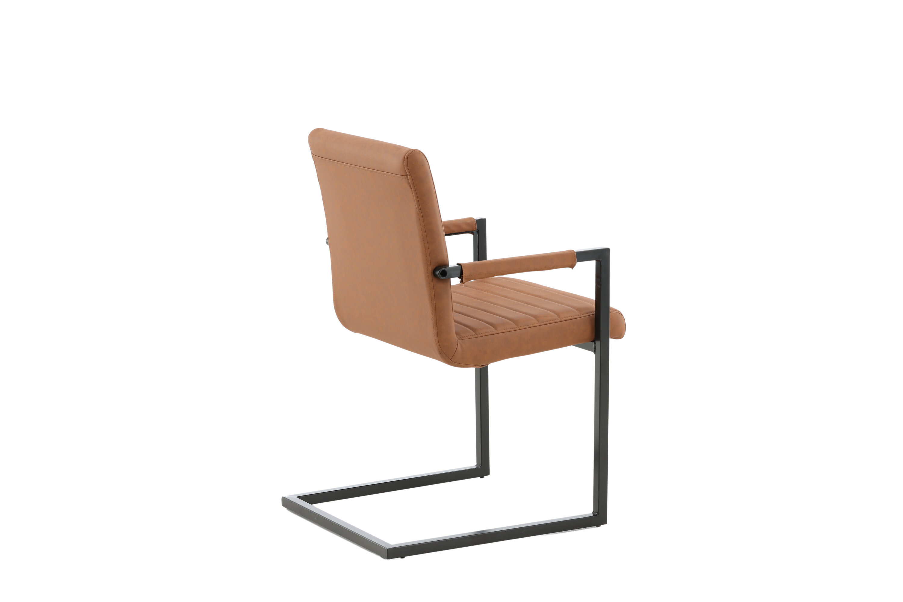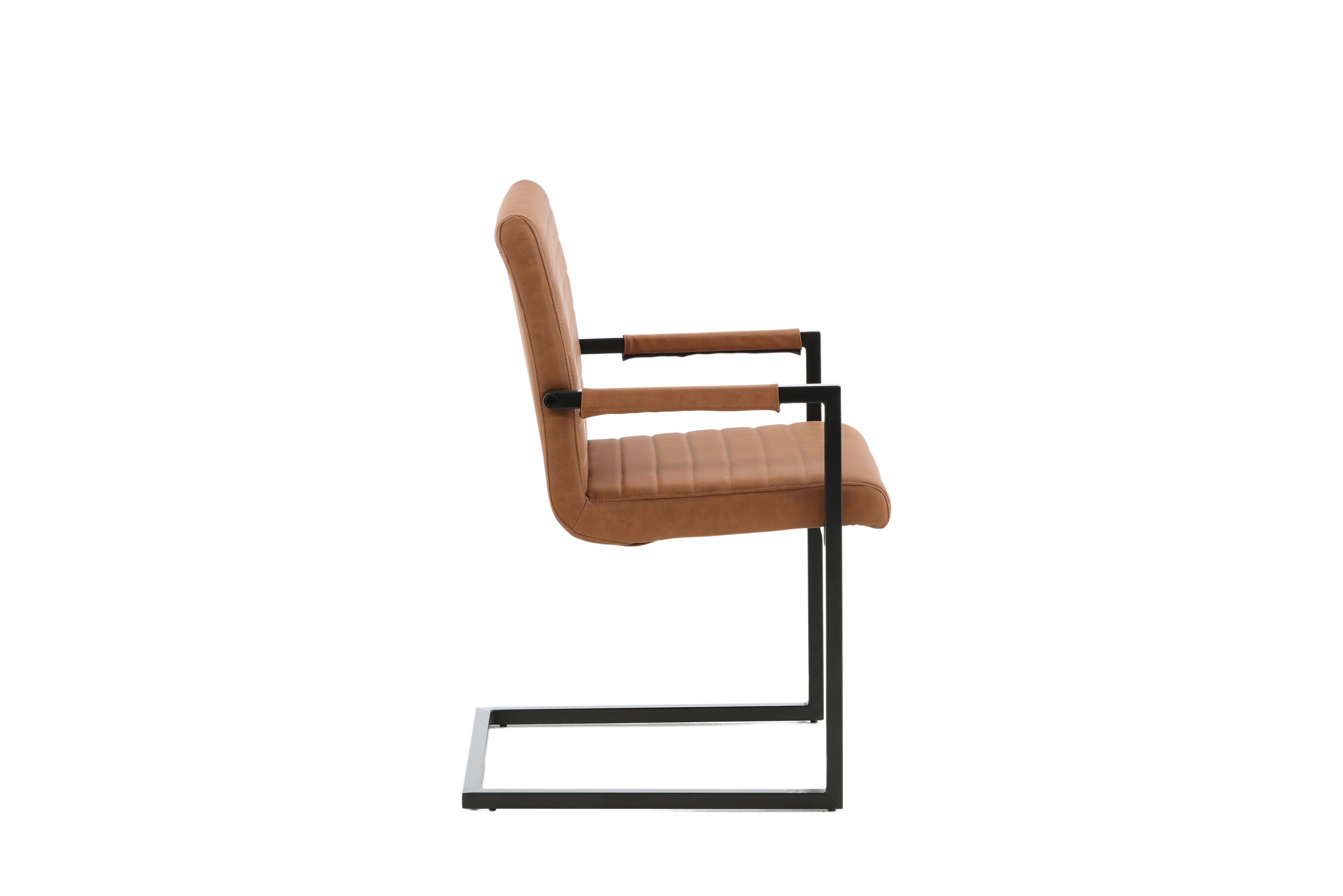 Esszimmerstuhl in der Serie Art bietet Ihnen einen Sessel/Sessel in einem industriellen, voll bekleideten Design, mit einem rustikalen Untergestell und integrierter Armlehne aus schwarz pulverbeschichtetem Metall. Breite Rückenlehne und Sitzfläche für zusätzlichen Komfort in braunem Kunstleder mit Ziernähten auf der Innenseite der Rückenlehne und Sitzfläche in einem schönen Muster. Leichtere Montage ist erforderlich.