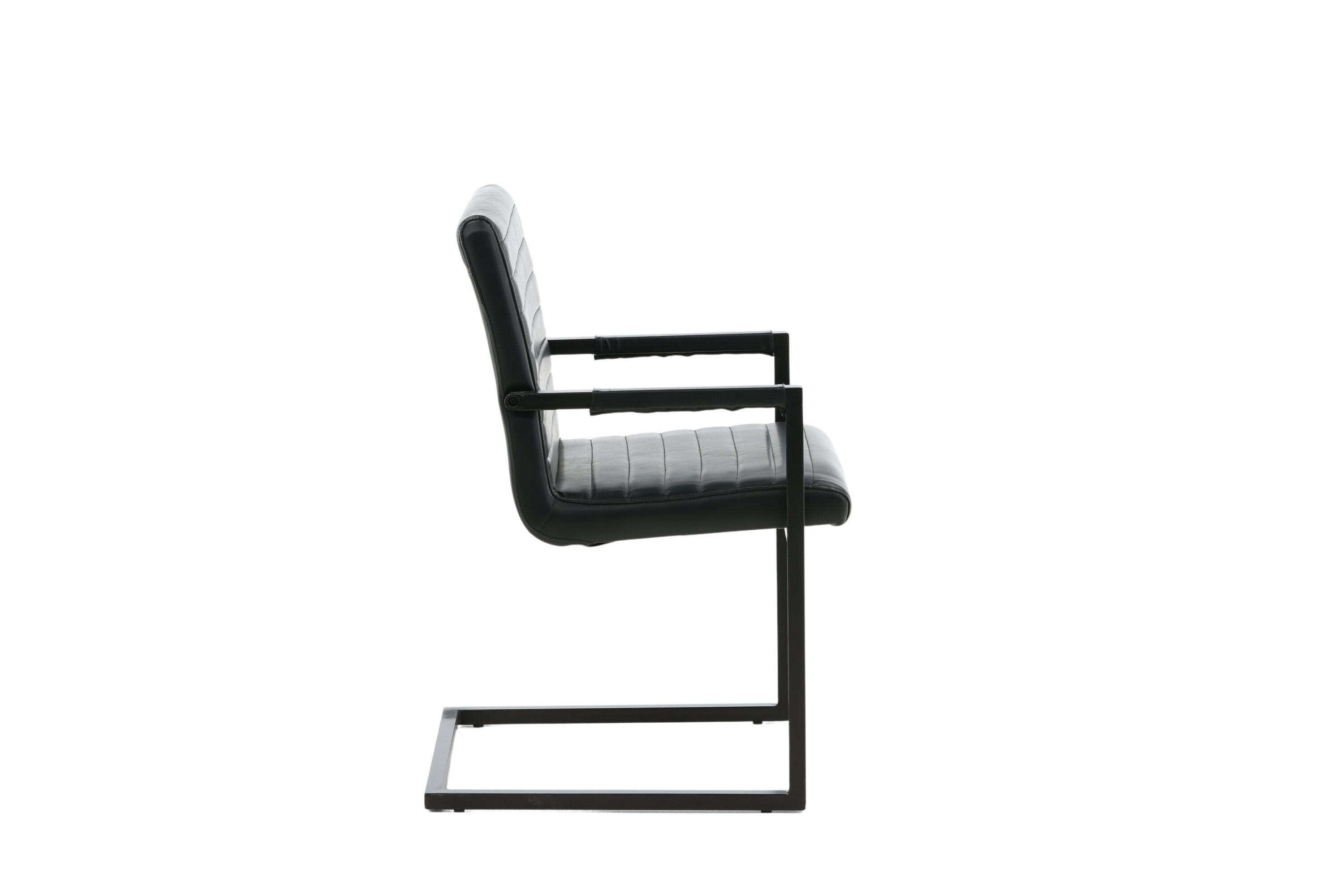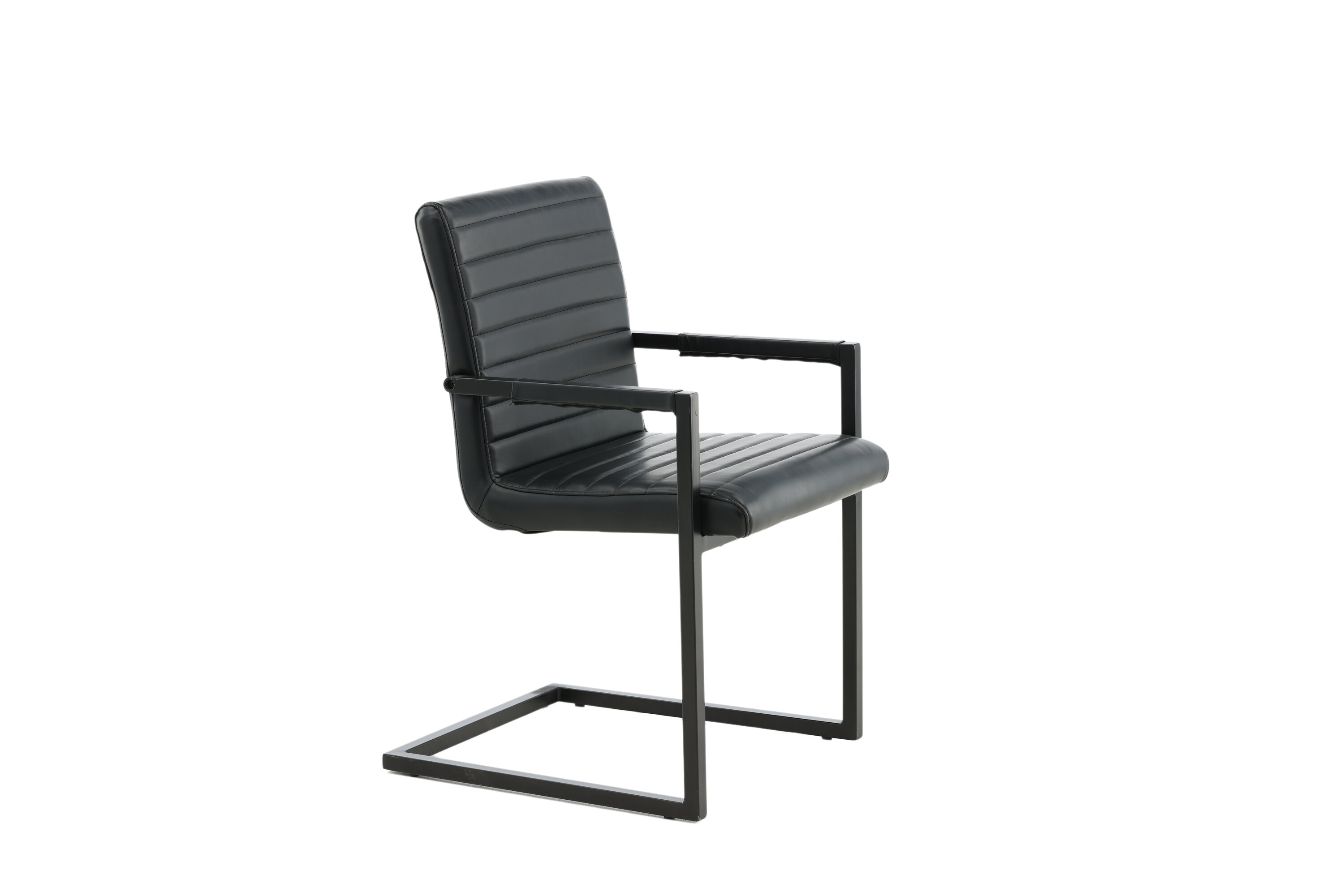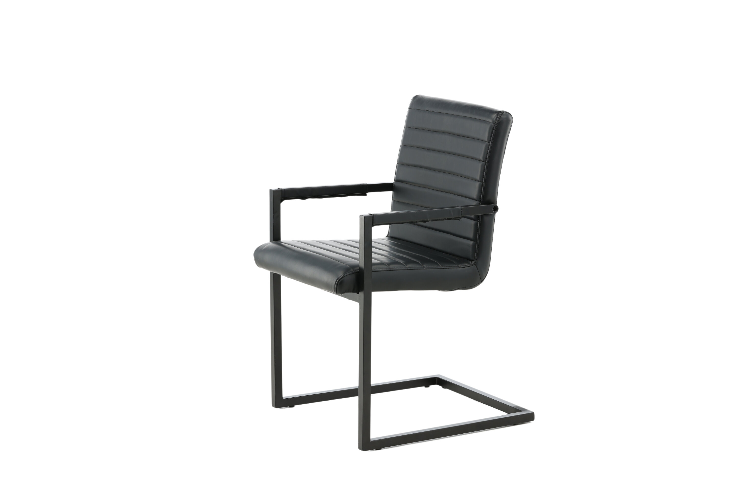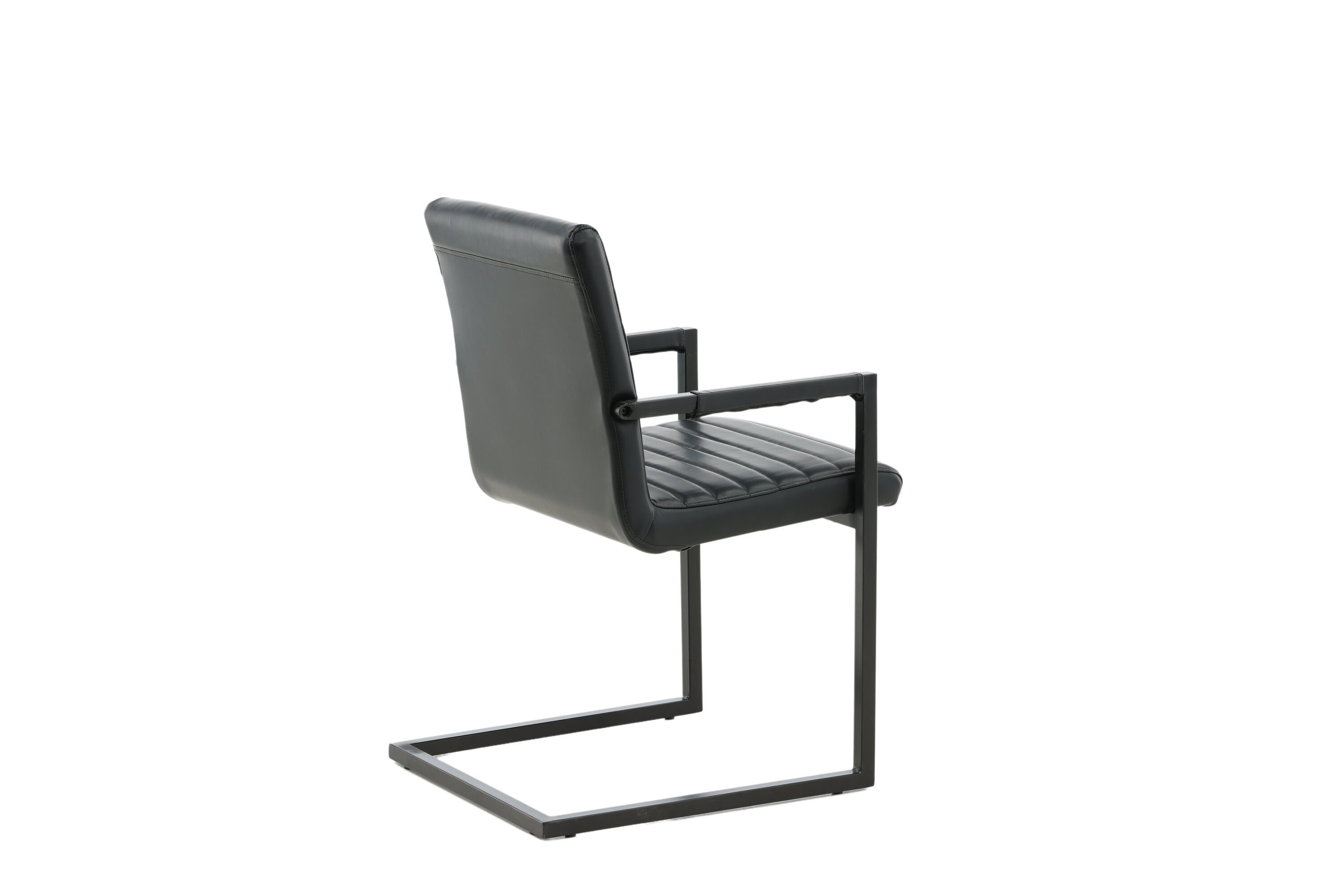 Esszimmerstuhl in der Serie Art bietet Ihnen einen Sessel/Sessel in einem industriellen, voll bekleideten Design, mit einem rustikalen Untergestell und integrierter Armlehne aus schwarz pulverbeschichtetem Metall. Breite Rückenlehne und Sitzfläche für zusätzlichen Komfort aus schwarzem Kunstleder mit Ziernähten auf der Innenseite der Rückenlehne und Sitzfläche in einem schönen Muster. Leichtere Montage ist erforderlich.