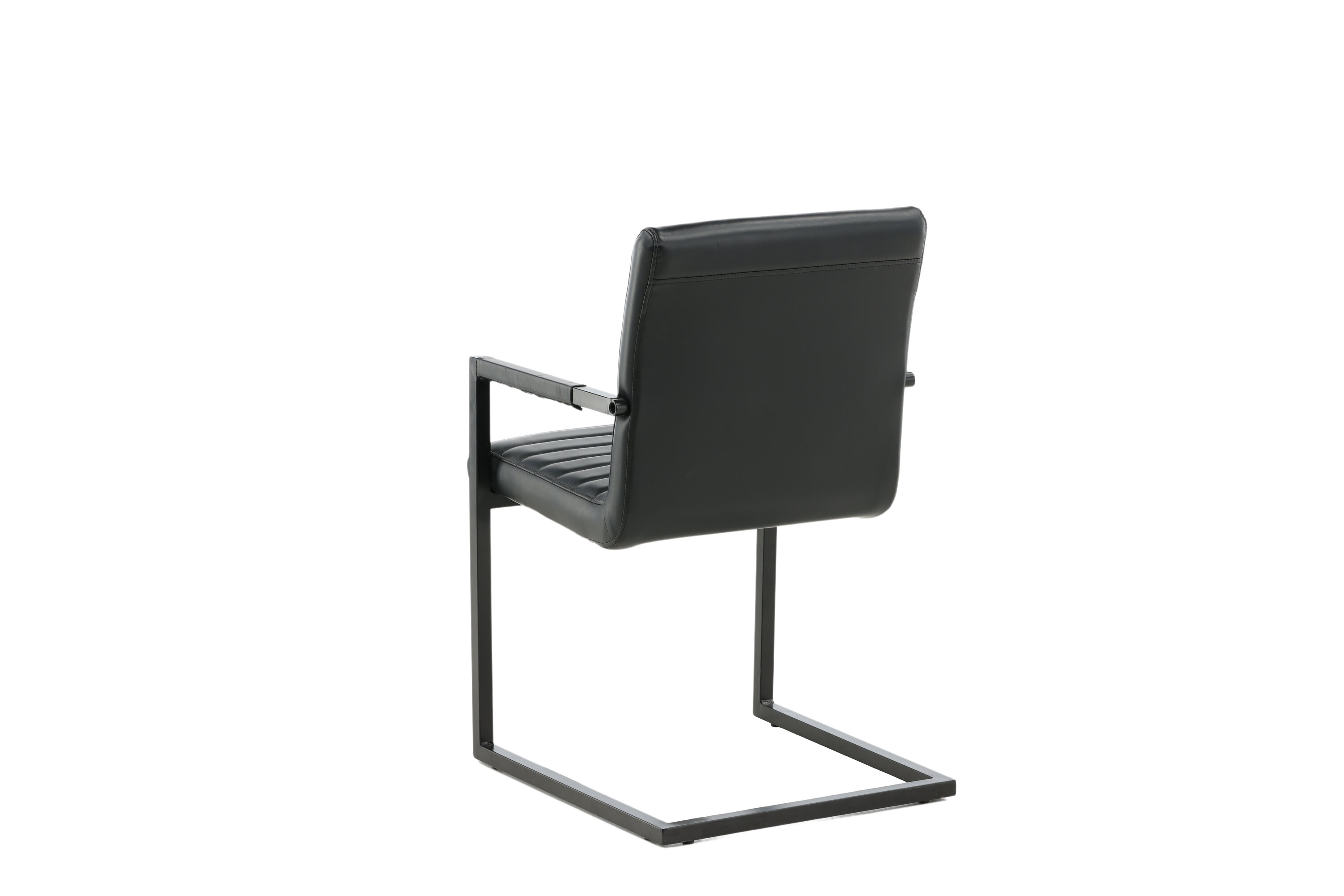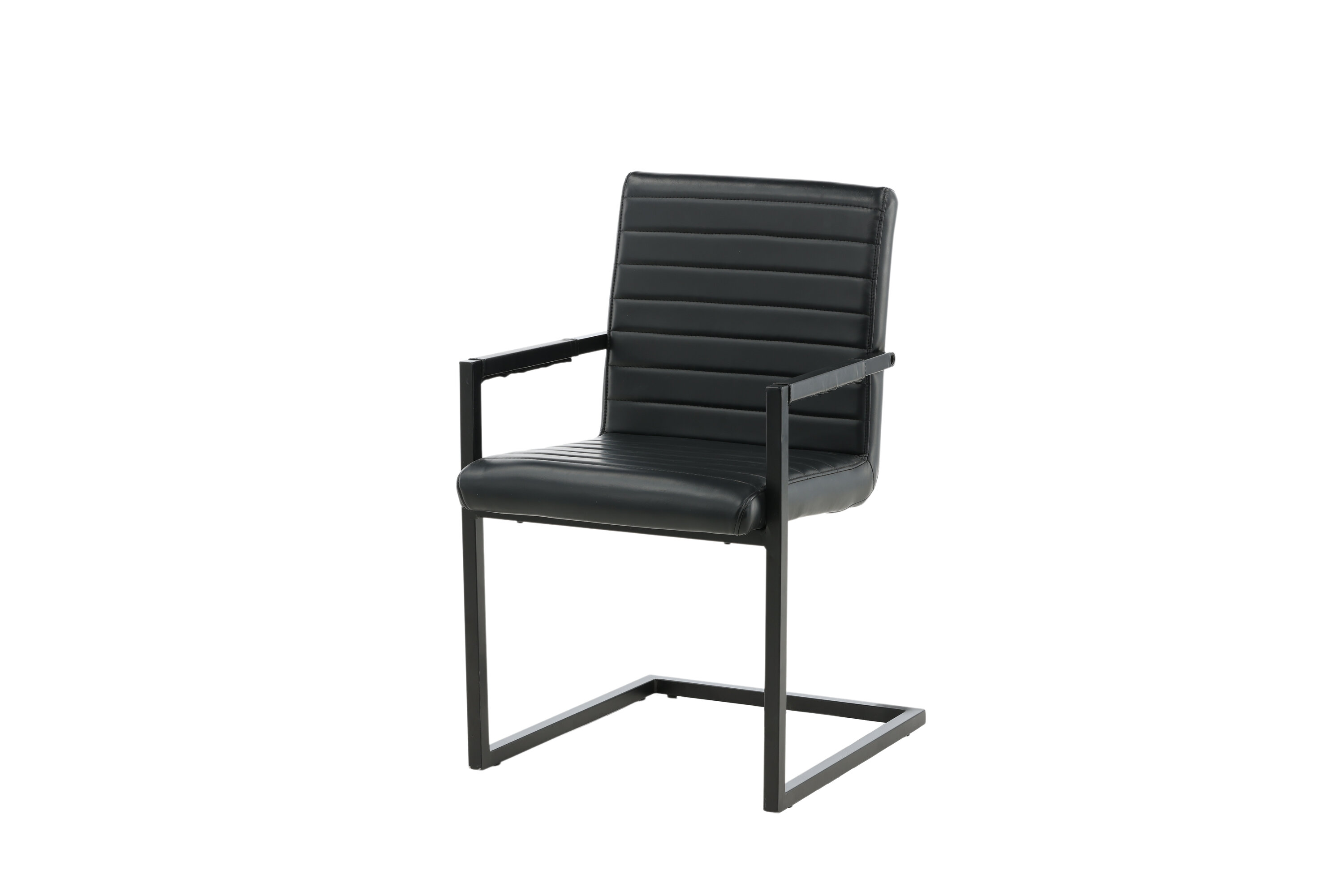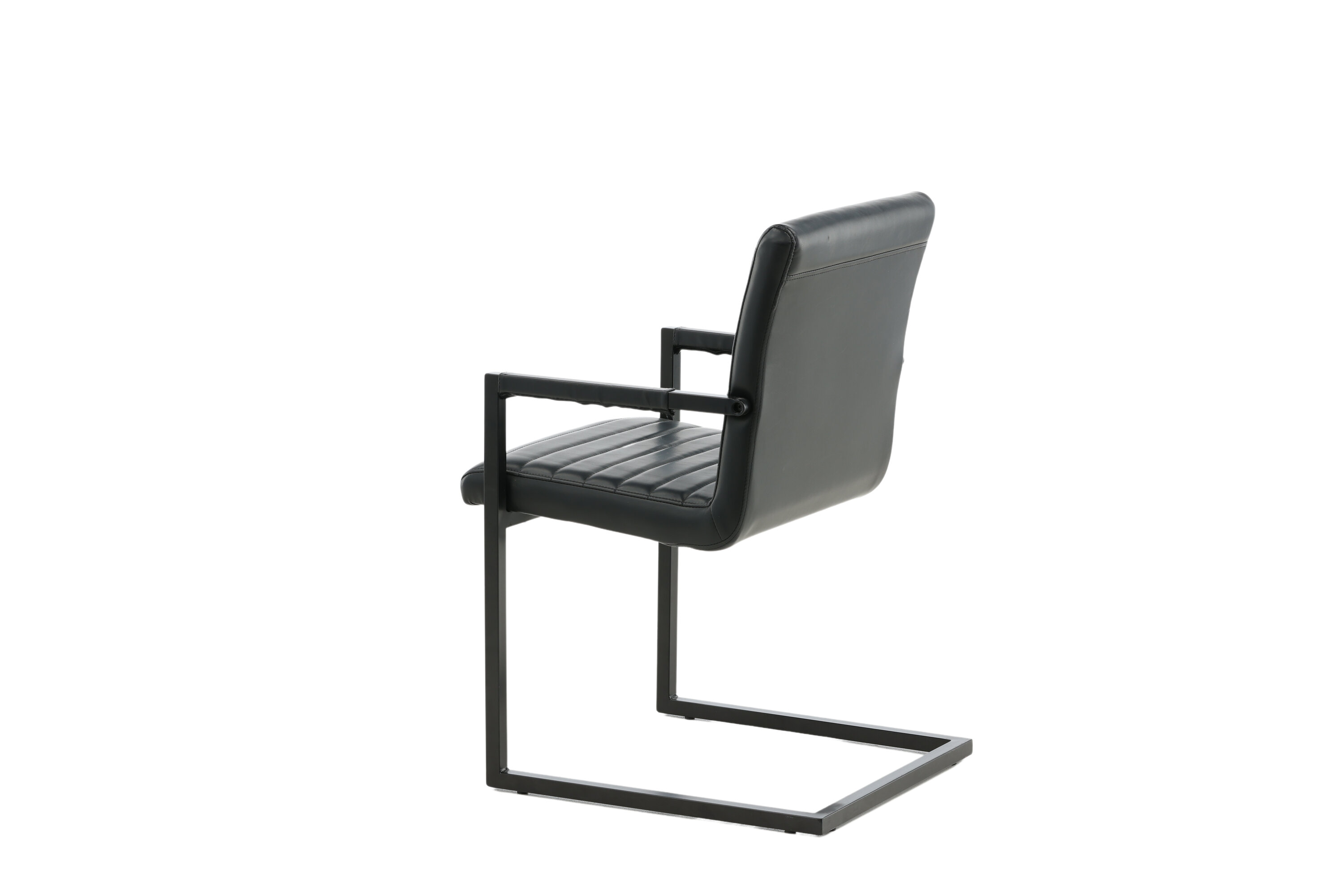 Esszimmerstuhl in der Serie Art bietet Ihnen einen Sessel/Sessel in einem industriellen, voll bekleideten Design, mit einem rustikalen Untergestell und integrierter Armlehne aus schwarz pulverbeschichtetem Metall. Breite Rückenlehne und Sitzfläche für zusätzlichen Komfort aus schwarzem Kunstleder mit Ziernähten auf der Innenseite der Rückenlehne und Sitzfläche in einem schönen Muster. Leichtere Montage ist erforderlich.