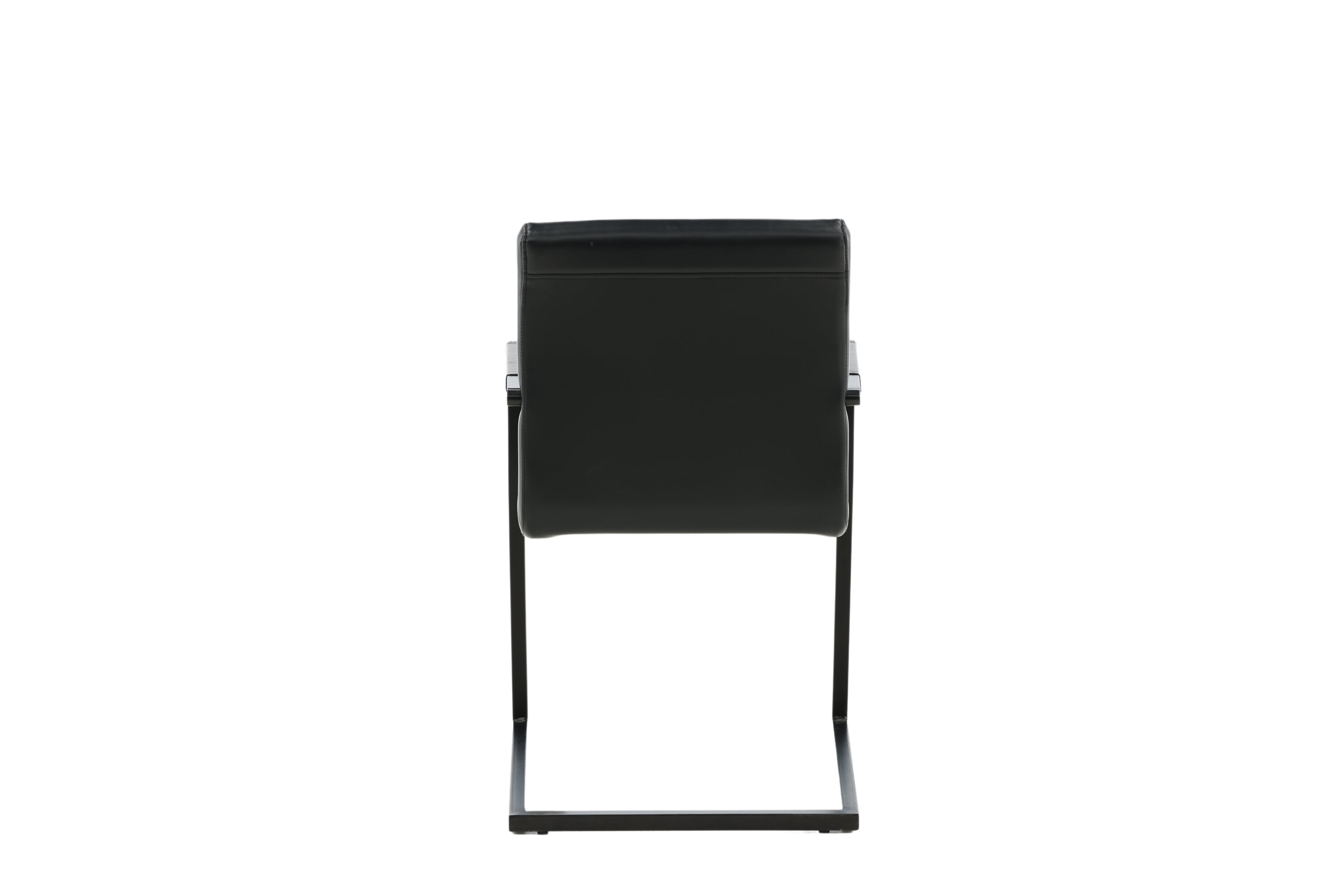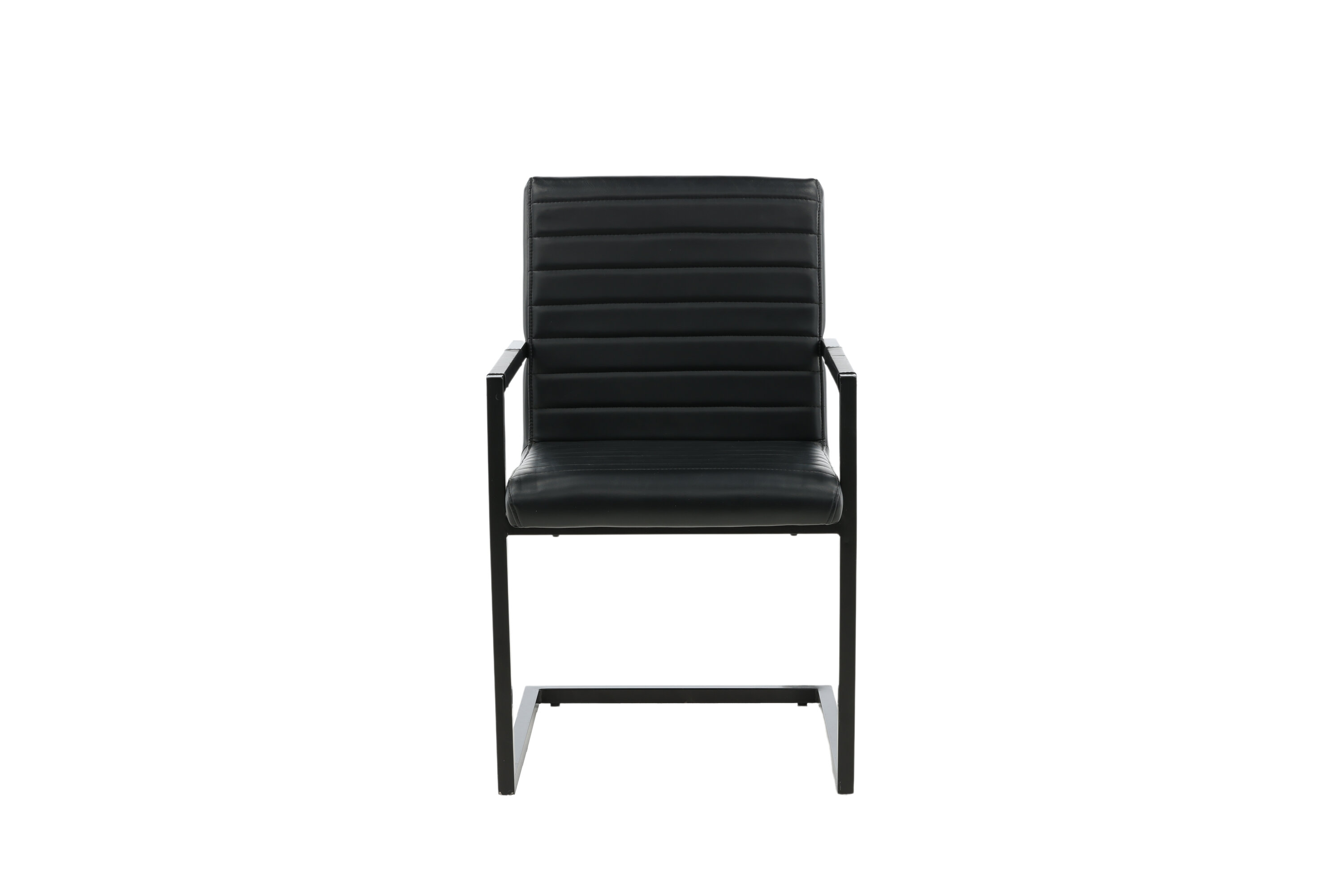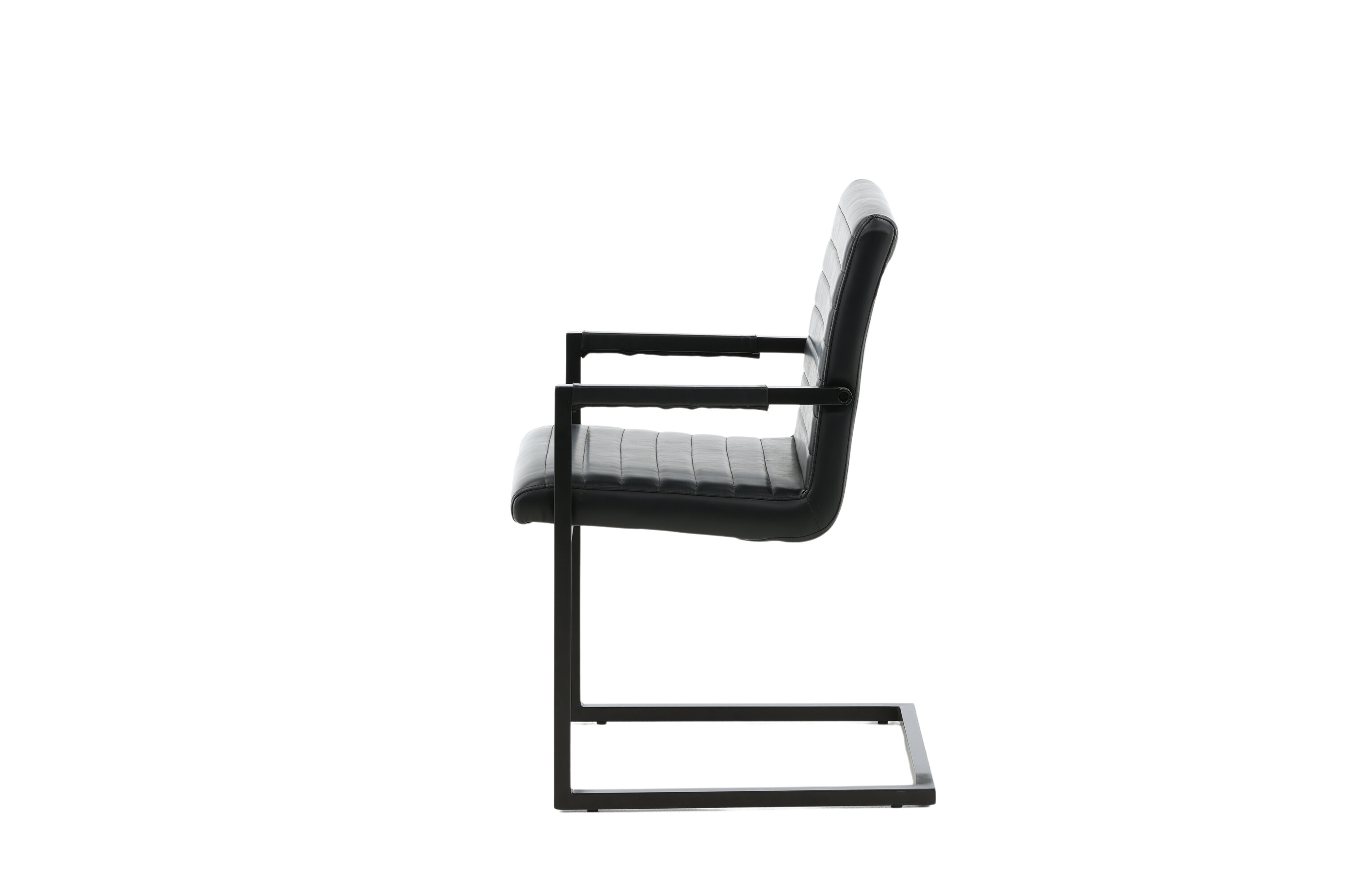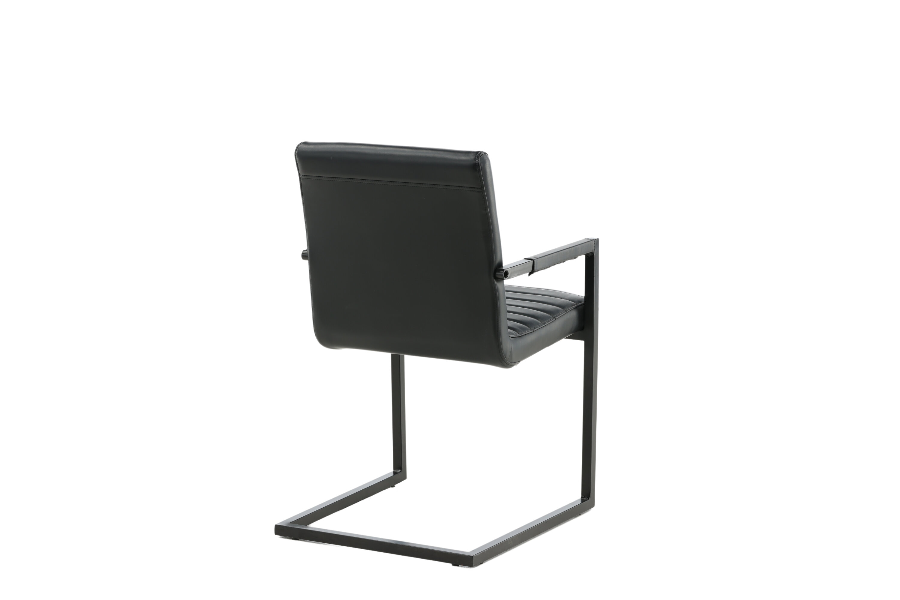 Esszimmerstuhl in der Serie Art bietet Ihnen einen Sessel/Sessel in einem industriellen, voll bekleideten Design, mit einem rustikalen Untergestell und integrierter Armlehne aus schwarz pulverbeschichtetem Metall. Breite Rückenlehne und Sitzfläche für zusätzlichen Komfort aus schwarzem Kunstleder mit Ziernähten auf der Innenseite der Rückenlehne und Sitzfläche in einem schönen Muster. Leichtere Montage ist erforderlich.