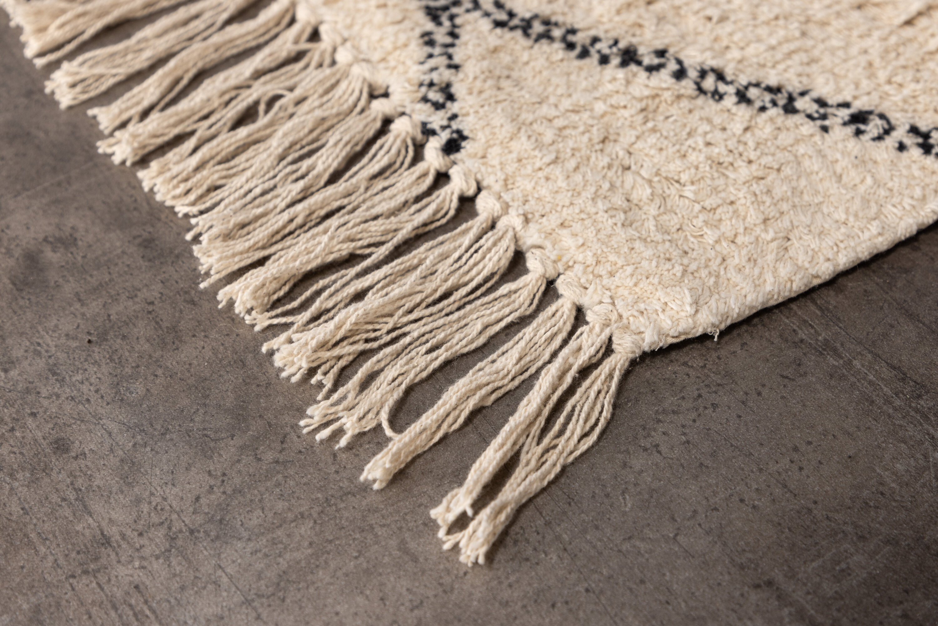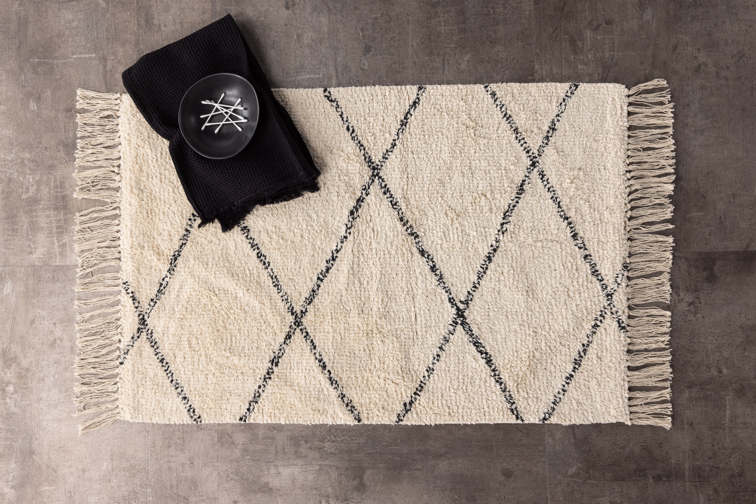 Es sind die kleinen Details, die wirklich einen Unterschied machen. Thelma ist nicht nur ein gewöhnlicher Teppich - er verfügt auch über elegante Fransen an den kurzen Seiten. Diese subtilen und raffinierten Details verleihen dem Teppich einen zusätzlichen Hauch von Schönheit und werten das Erscheinungsbild auf. Die Fransen sorgen auch für ein verspieltes Gefühl und schaffen einen schönen Kontrast zur gemusterten schwarz-weißen Oberfläche. Mit Thelma erhalten Sie einen Teppich, der wirklich auffällt und Ihrem Zuhause eine stilvolle Note verleiht.