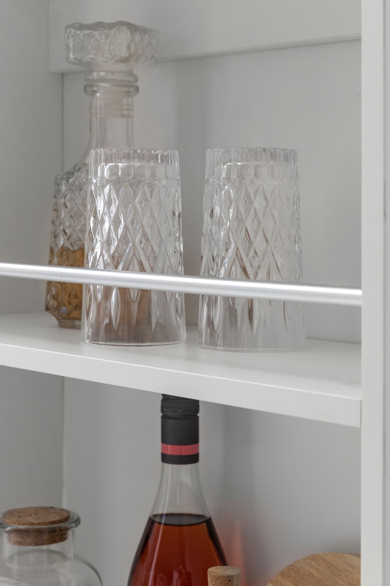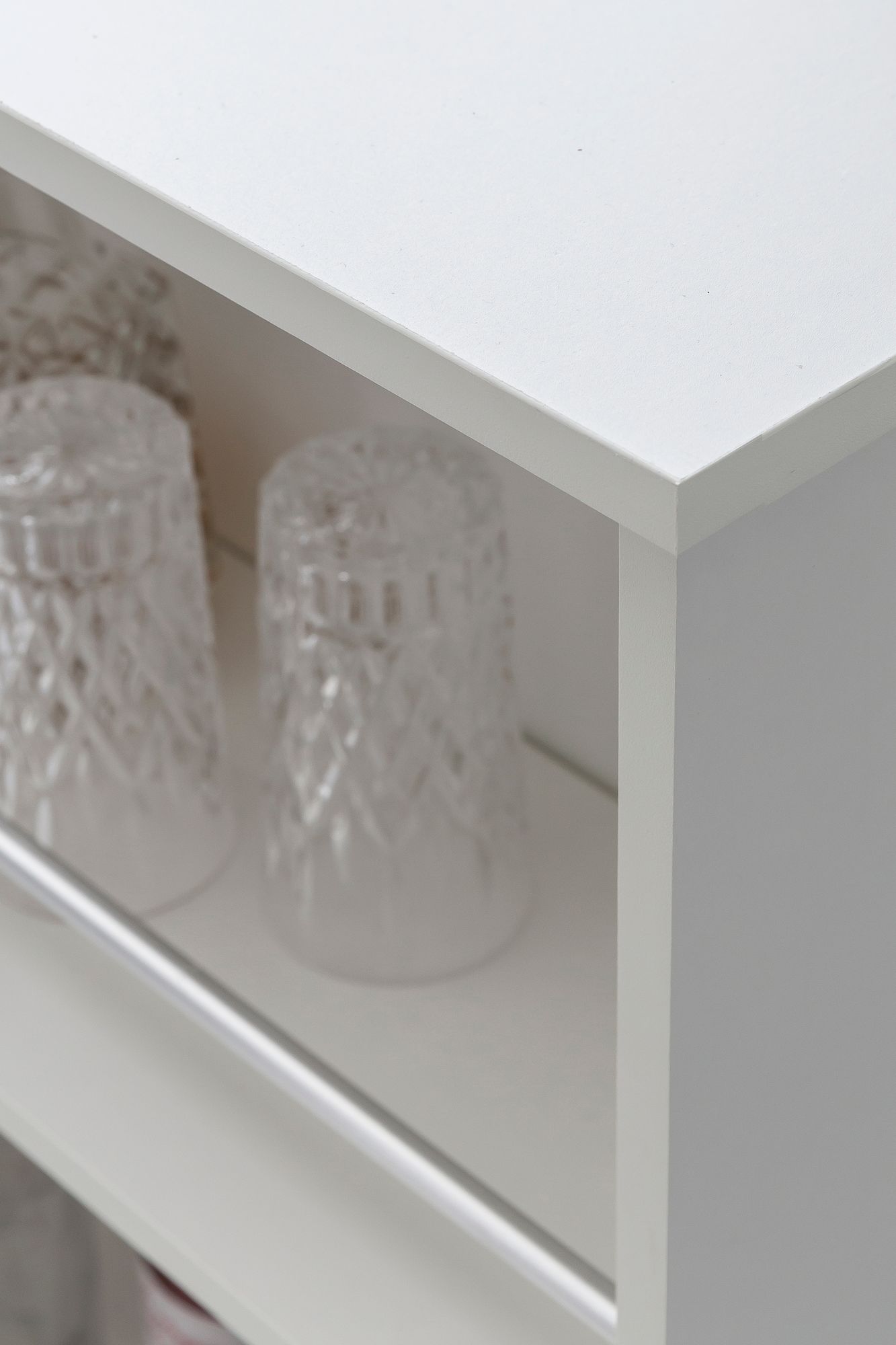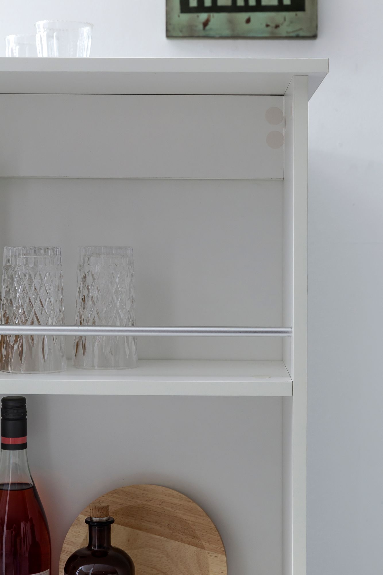 Dieser weiße Bartisch besticht durch modernes, geradliniges Design und große Ablagefläche mit drei integrierten Regalfächern für Weinflaschen, Gläser und Küchenutensilien. Silberne Aluminiumstreben verhindern das Herausfallen der Gegenstände.