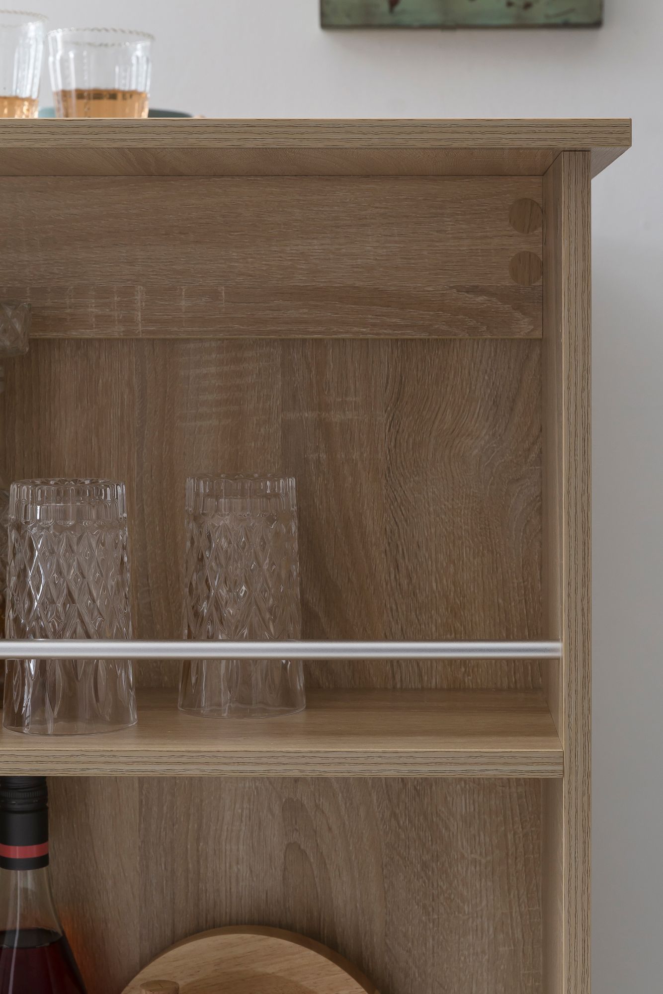 Der Bartisch Sonoma aus Holz überzeugt durch sein modernes, geradliniges Design und vielfältige Stauraummöglichkeiten. Die große Ablagefläche bietet ausreichend Platz für Getränke, Geschirr und Snacks. Drei integrierte Fächer eignen sich ideal zur Aufbewahrung von Weinflaschen, Gläsern und Küchenutensilien.