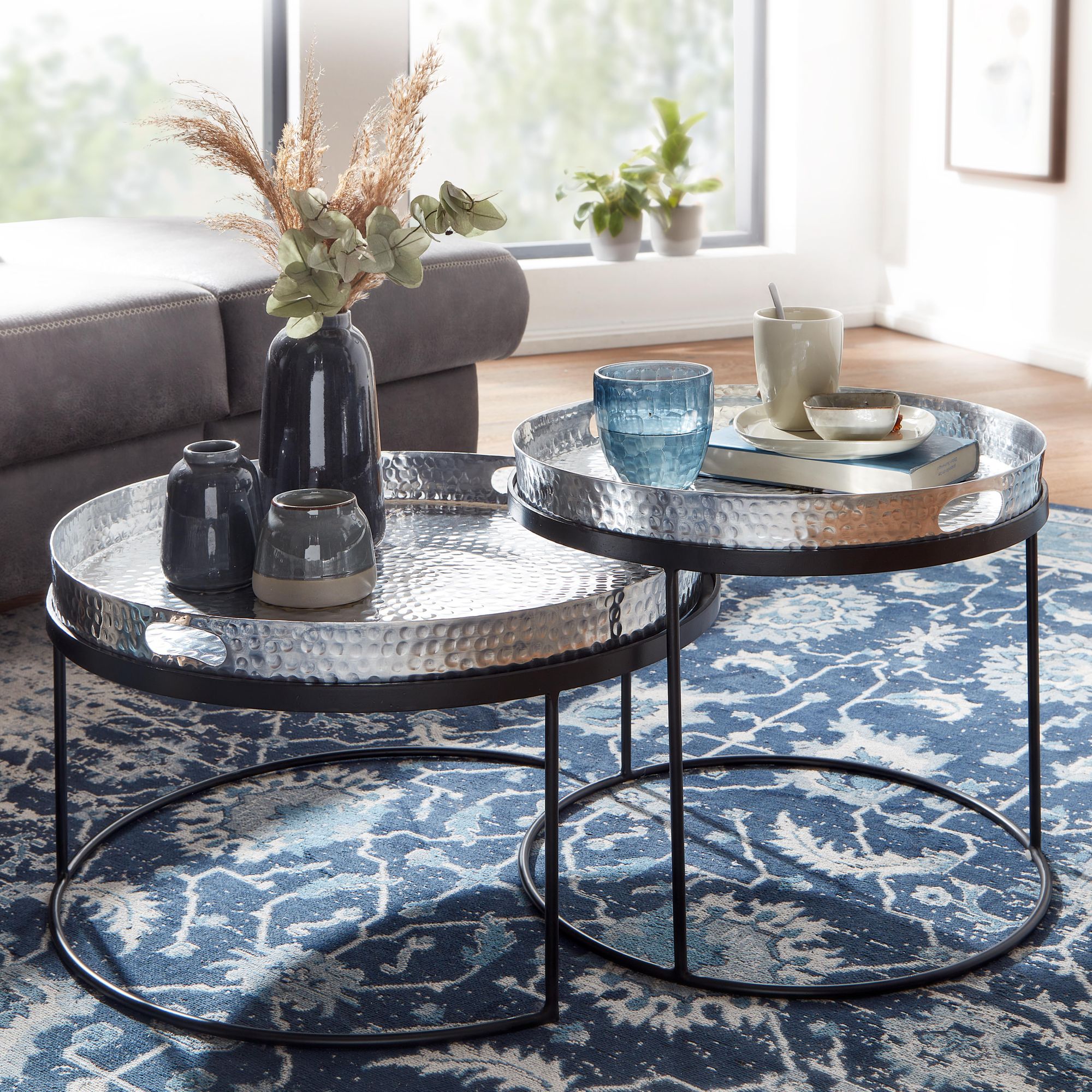 Elegantes 2-teiliges Couchtisch-Set mit silberfarben lackierten Aluminiumtischplatten mit Hammerschlag-Struktur und robustem schwarz lackiertem Stahlgestell. Abnehmbare Tabletts mit praktischen Griffmulden ermöglichen einfachen Transport. Modernes Design für zeitgemäße Wohnräume.