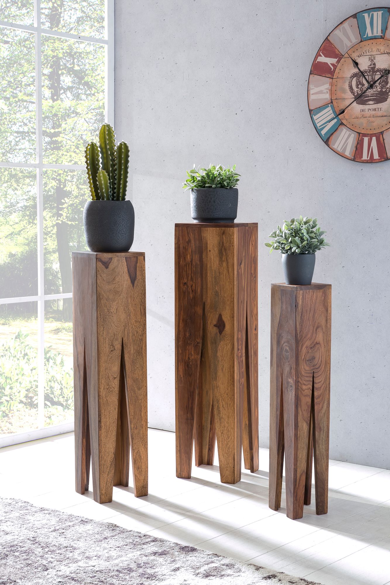 Dieses 3-teilige Beistelltisch-Set aus massivem Sheesham-Holz in Braun verbindet Funktionalität mit modernem, quadratischem Design und säulenartigen Beinen. Ideal zur Präsentation von Dekorationsartikeln, jeder Tisch ist ein handgefertigtes Einzelstück.