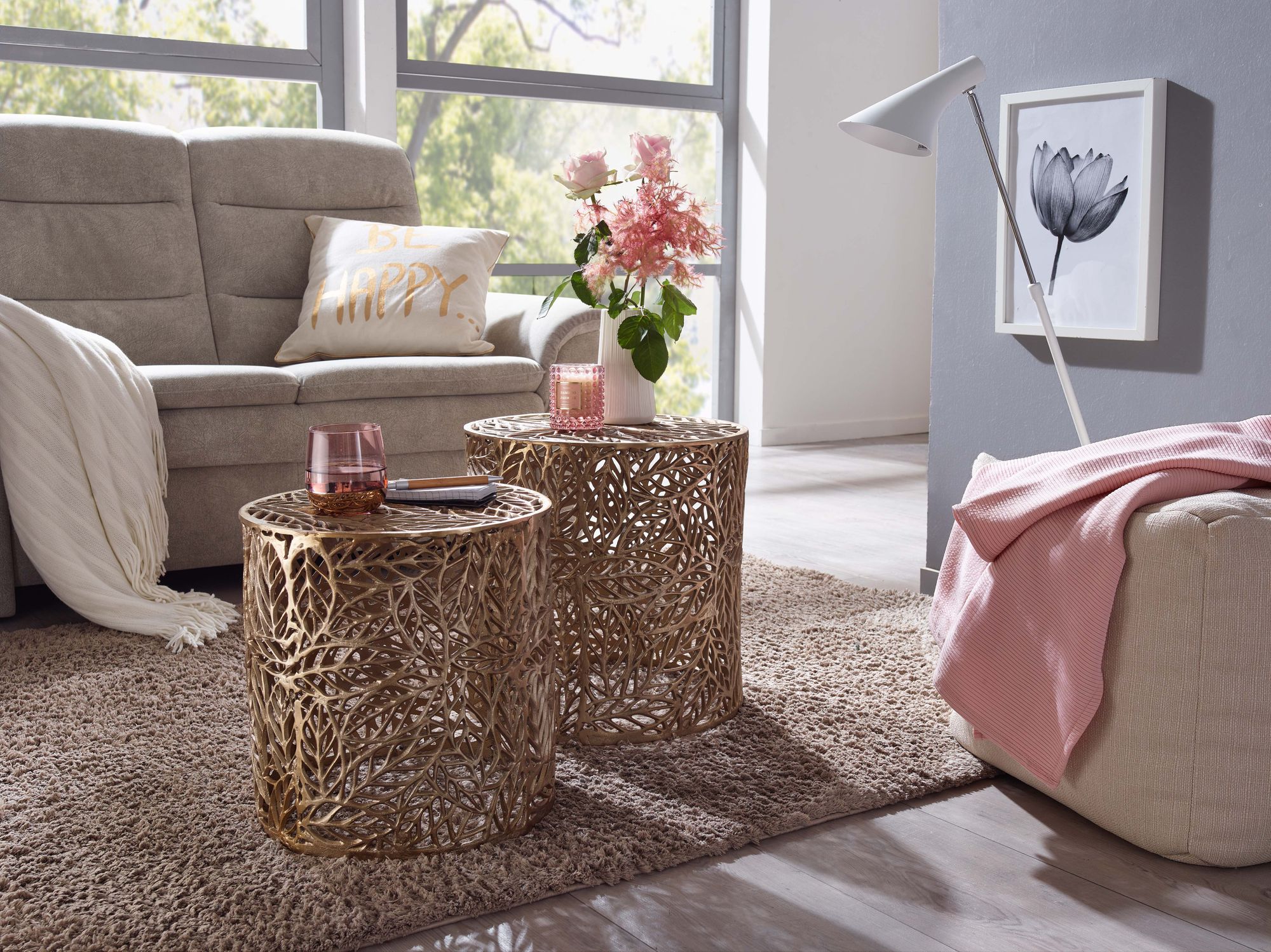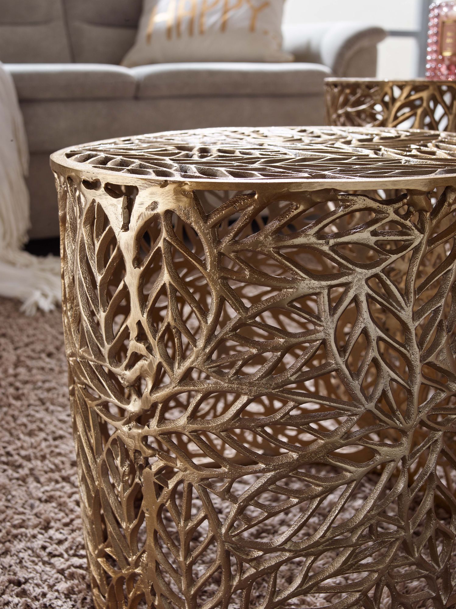 Dieses 2-teilige Beistelltisch-Set aus goldfarbenem lackiertem Aluminium vereint modernes Design mit hoher Funktionalität. Die ausgefallenen Tischgestelle mit Blumenmuster setzen stilvolle Akzente in Ihrem Wohnraum.