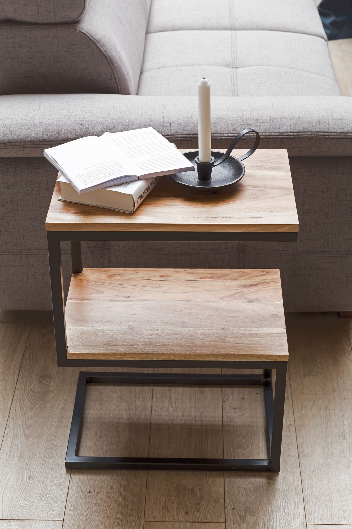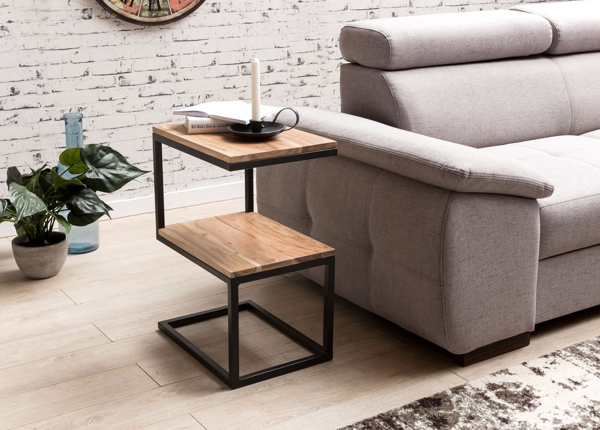 Der Beistelltisch AKOLA überzeugt mit seinem S-förmigen Design aus massivem Akazienholz und pulverbeschichtetem Metall in mattem Schwarz, passend für rustikale und moderne Wohnstile.