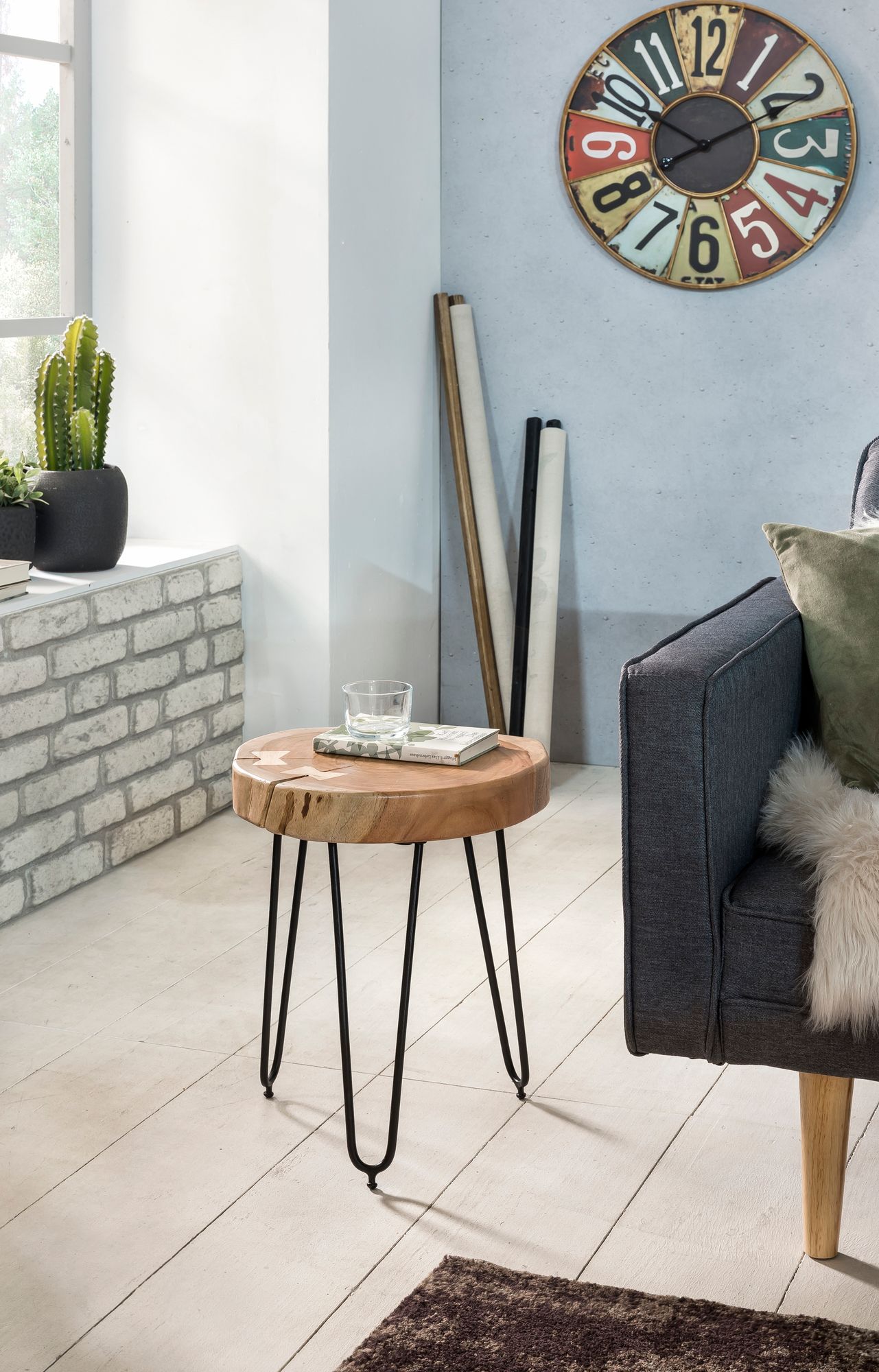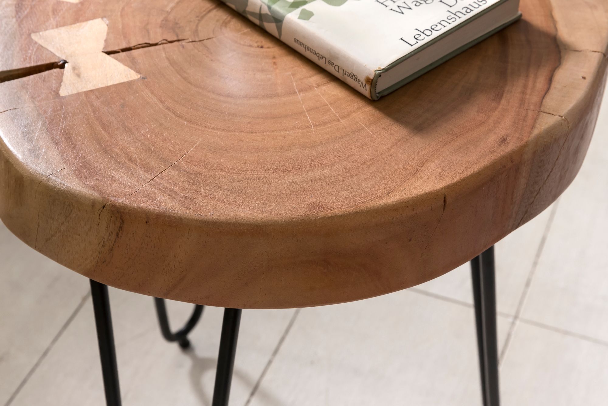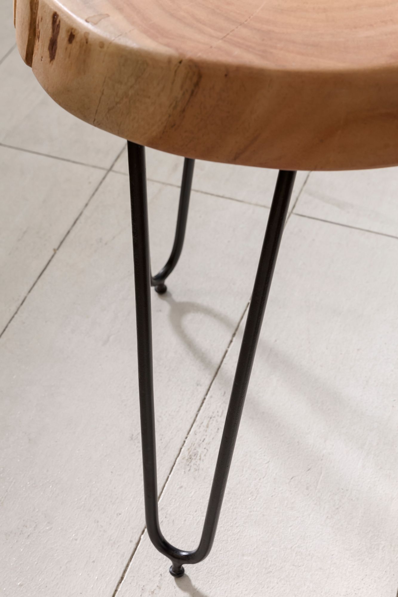 Der Beistelltisch BAGLI verfügt über eine Tischplatte aus massivem Akazienholz mit Baumkante und stabile schwarze Metallbeine – eine Verbindung von natürlicher Schönheit und modernem Design.