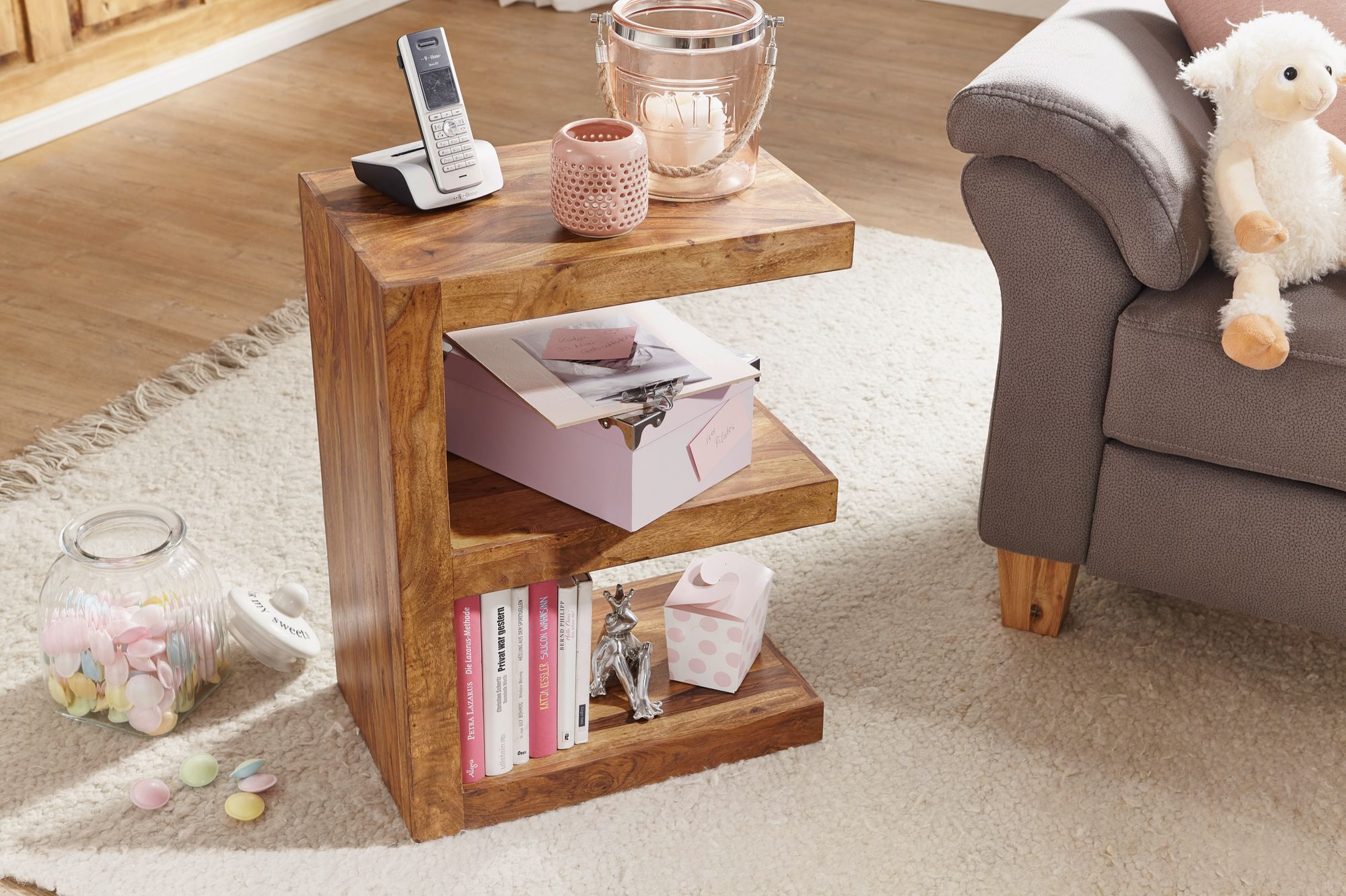 Der Beistelltisch MUMBAI aus massivem Sheeshamholz in brauner Naturfarbe bringt rustikalen Landhauscharme ins Wohnzimmer. Mit 60 cm Höhe und extravaganten E-Form entstehen praktische Ablageflächen für Zeitungen oder andere Gegenstände.