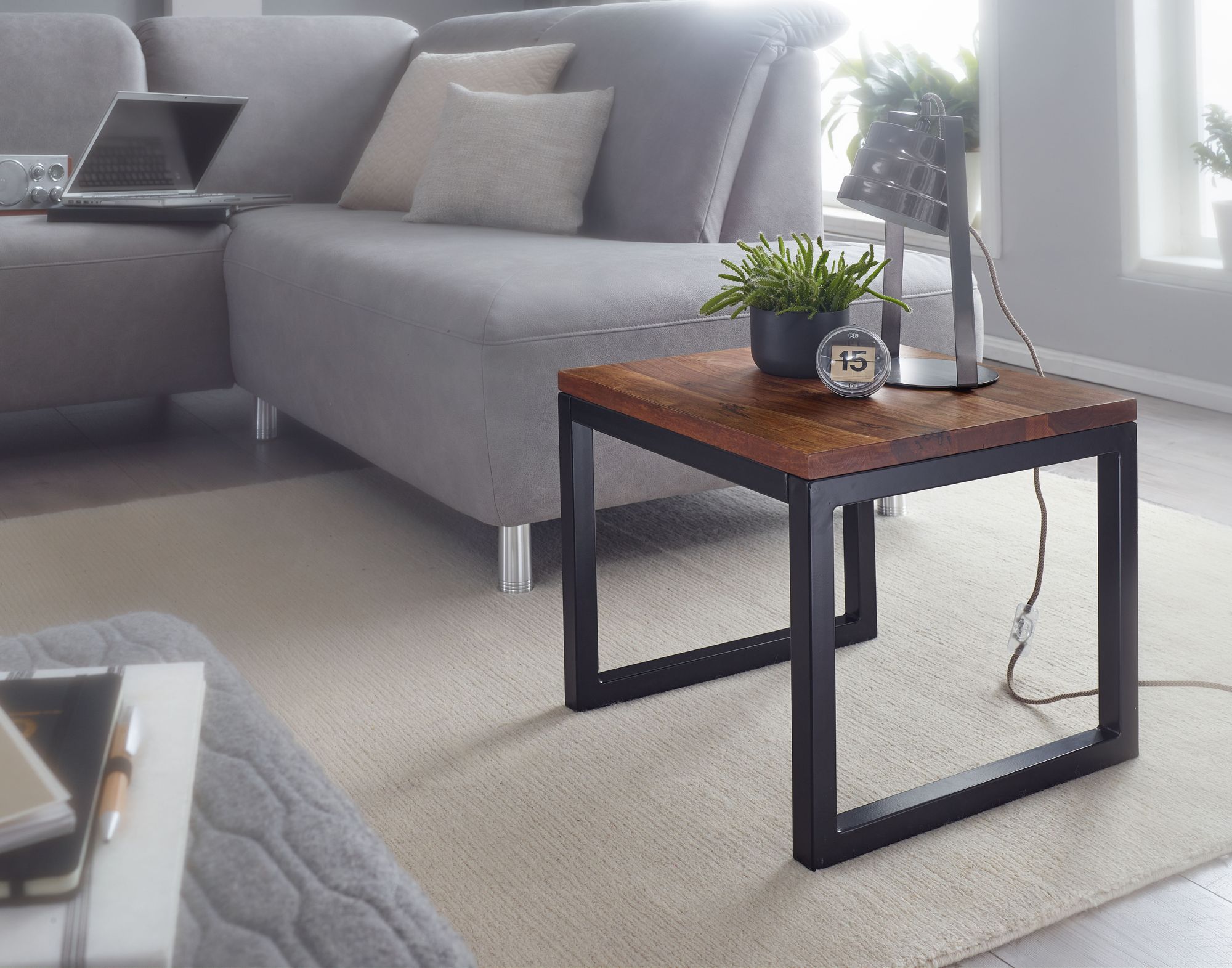 Bringen Sie mit diesem Beistelltisch aus massivem Sheeshamholz und schwarzem Metall einen warmen Industrial-Touch in Ihr Zuhause. Mit großzügiger Tischplatte und stabilen Beinen verbindet er Eleganz mit Funktionalität.