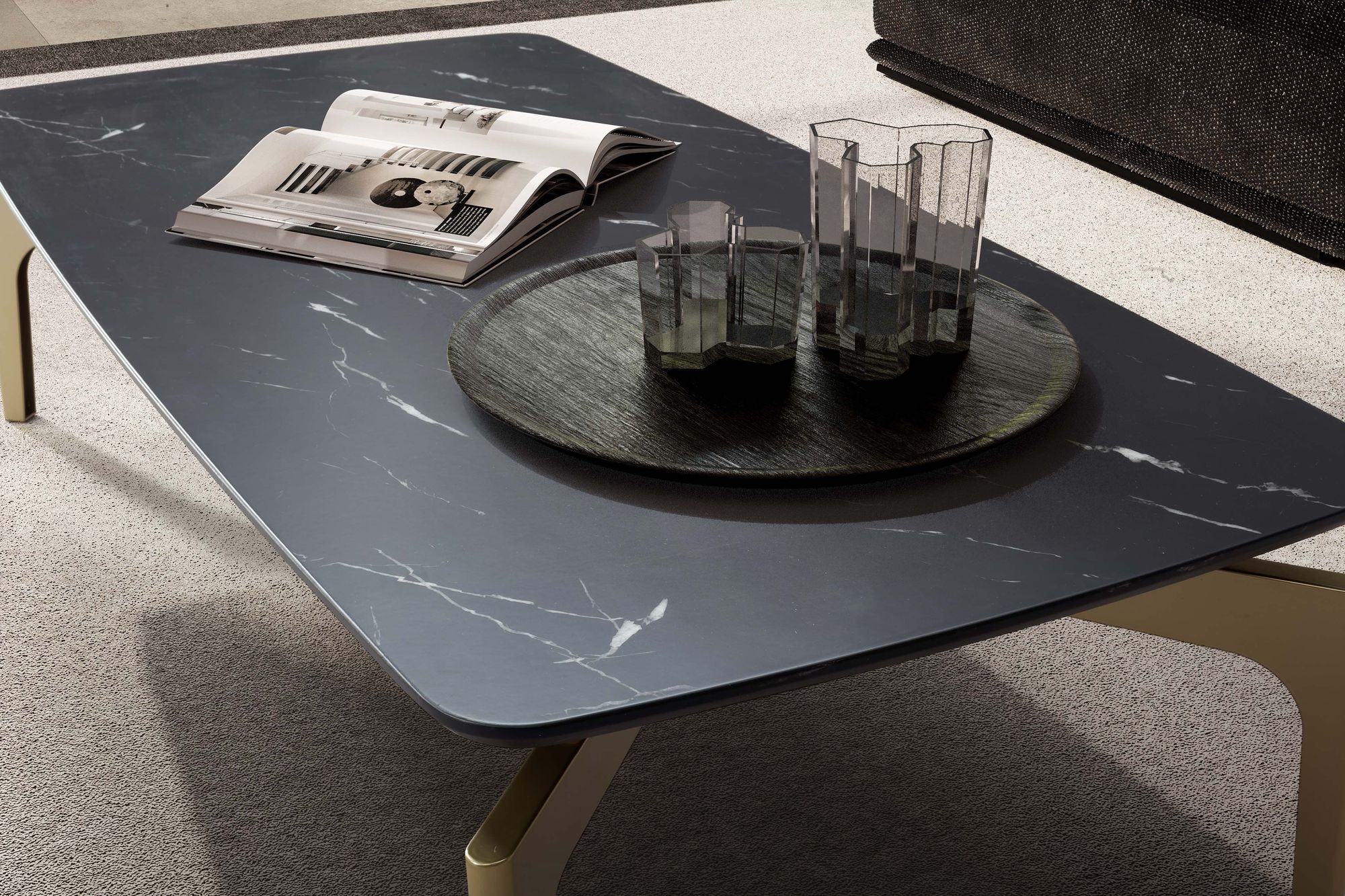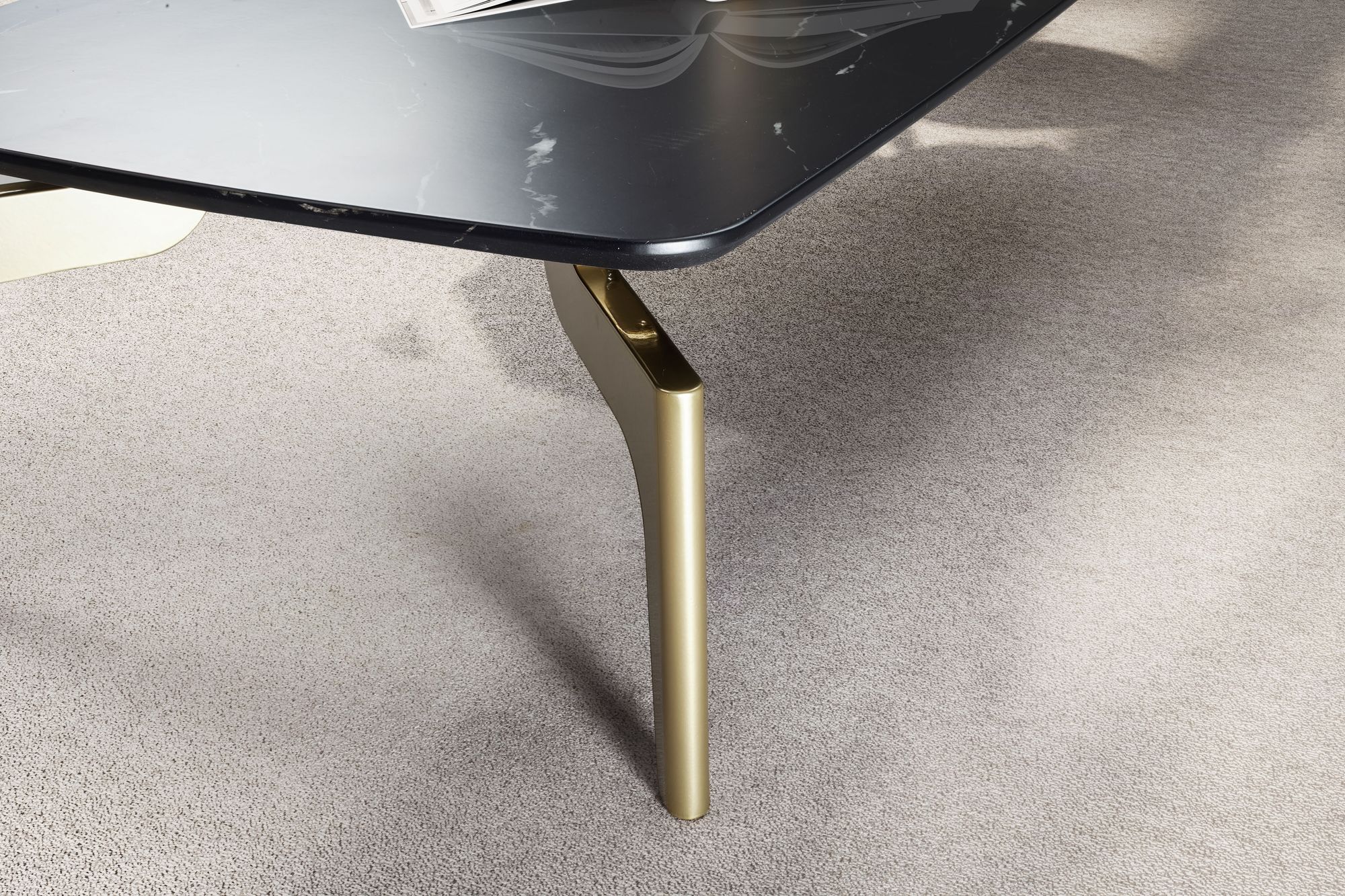 Moderner rechteckiger Couchtisch mit schwarzer, hochglänzender Marmoroptik auf foliertem MDF und stabilem goldfarbenem Metallgestell. Ideal für das Wohnzimmer, mit großer Ablagefläche für Fernbedienungen, Zeitschriften und Dekorationen.