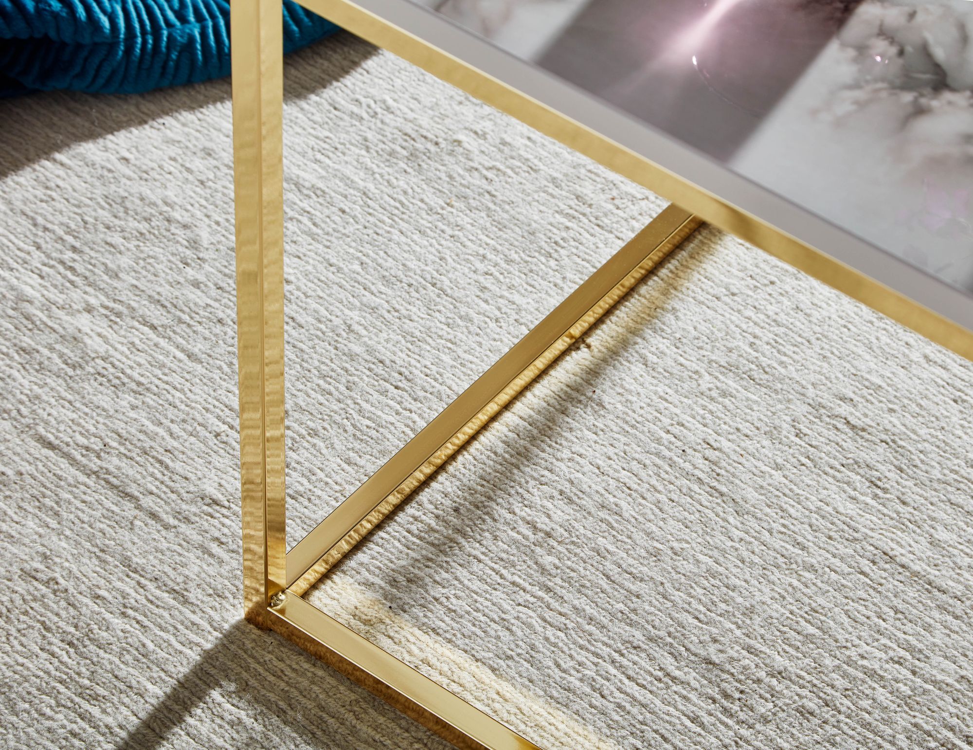 Verleihen Sie Ihrem Wohnzimmer mit diesem quadratischen Couchtisch in den Maßen 60x60x45 cm eine moderne Eleganz. Die Tischplatte aus foliertem MDF mit polyresinbeschichtung in Hochglanz Marmoroptik Weiß sorgt für eine hochwertige und langlebige Oberfläche. Das goldfarbene, lackierte Stahlgestell garantiert Stabilität und veredelt das Design.