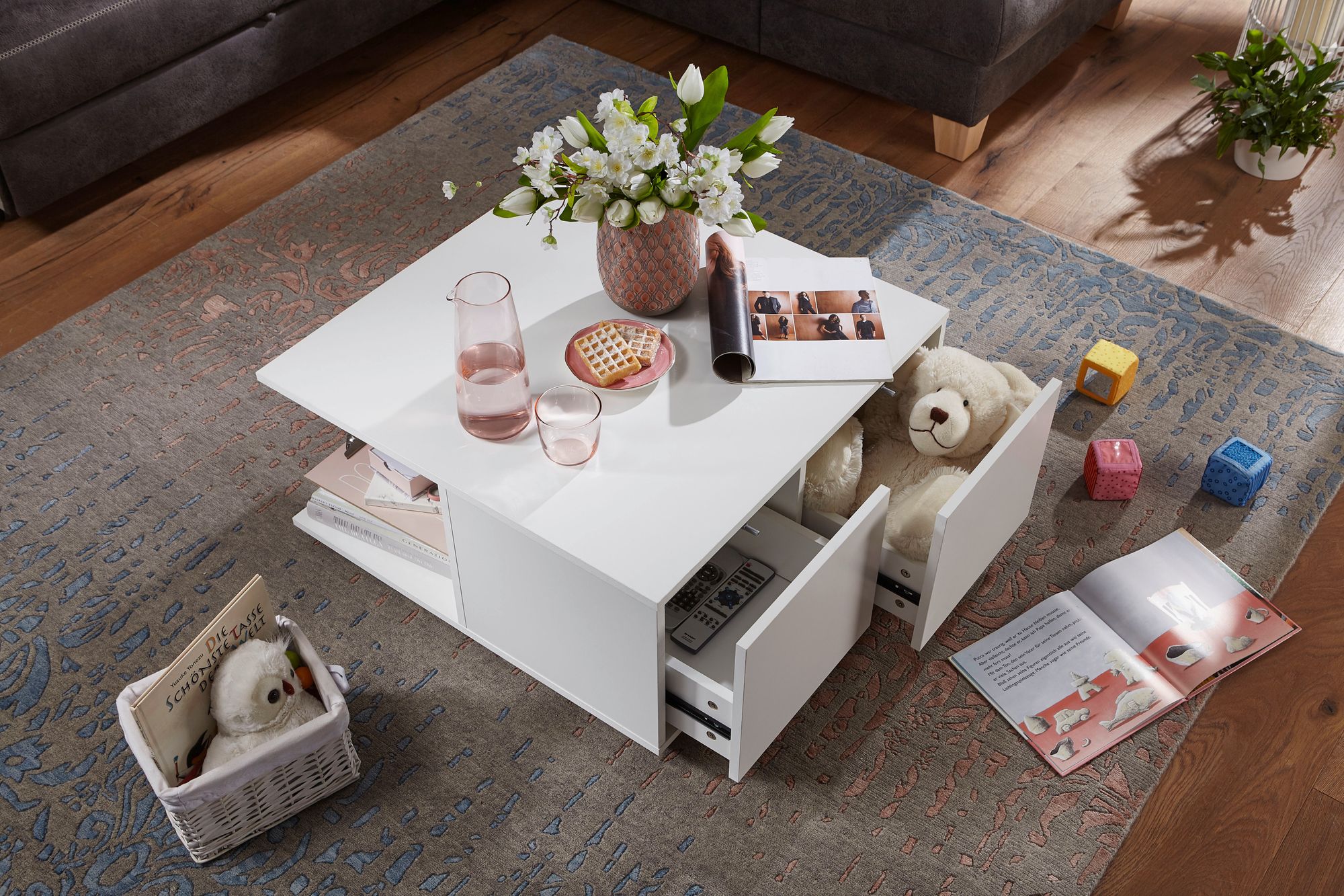 Couchtisch 70x70 cm Weiß | 2 Schubladen & Rollen | Moderner Wohnzimmertisch
