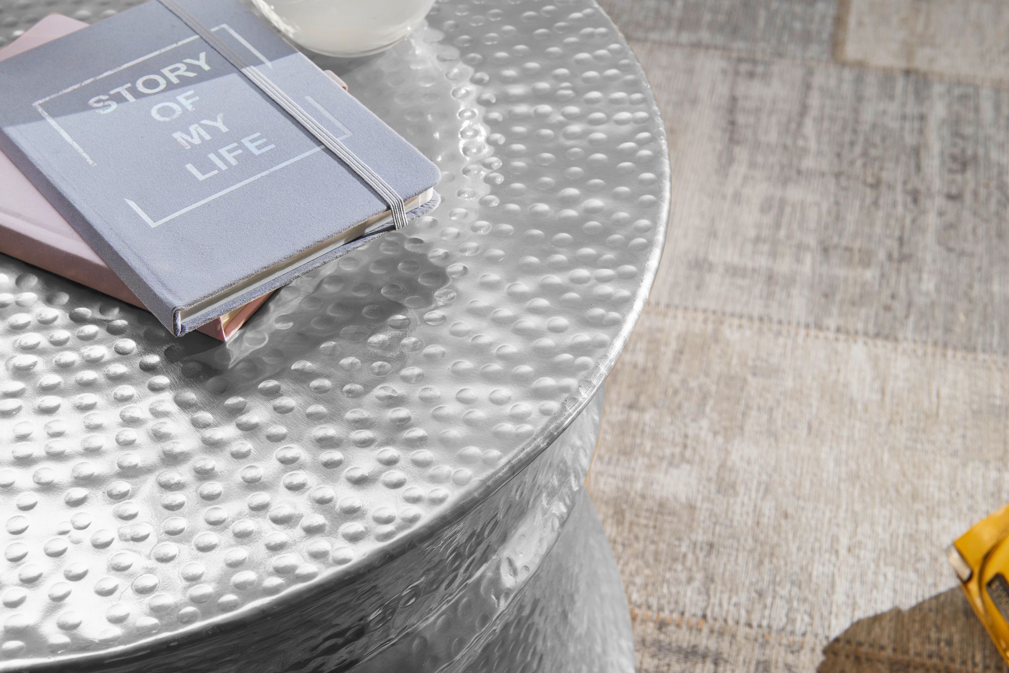 Verleihen Sie Ihrem Wohnzimmer mit diesem silberfarbenen Aluminium-Couchtisch (62x41x62 cm) eine einzigartige orientalische Atmosphäre. Die gehämmerte, handgefertigte Oberfläche sorgt für dekorativen Charme und Stabilität – ideal für den Alltag.