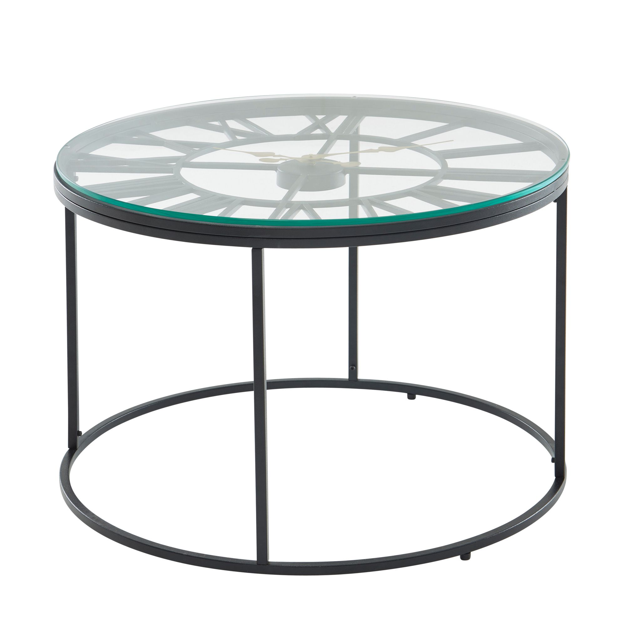 Couchtisch Glas Metall Schwarz 60x60x43 cm | Moderner Runder Wohnzimmertisch mit Dekouhr