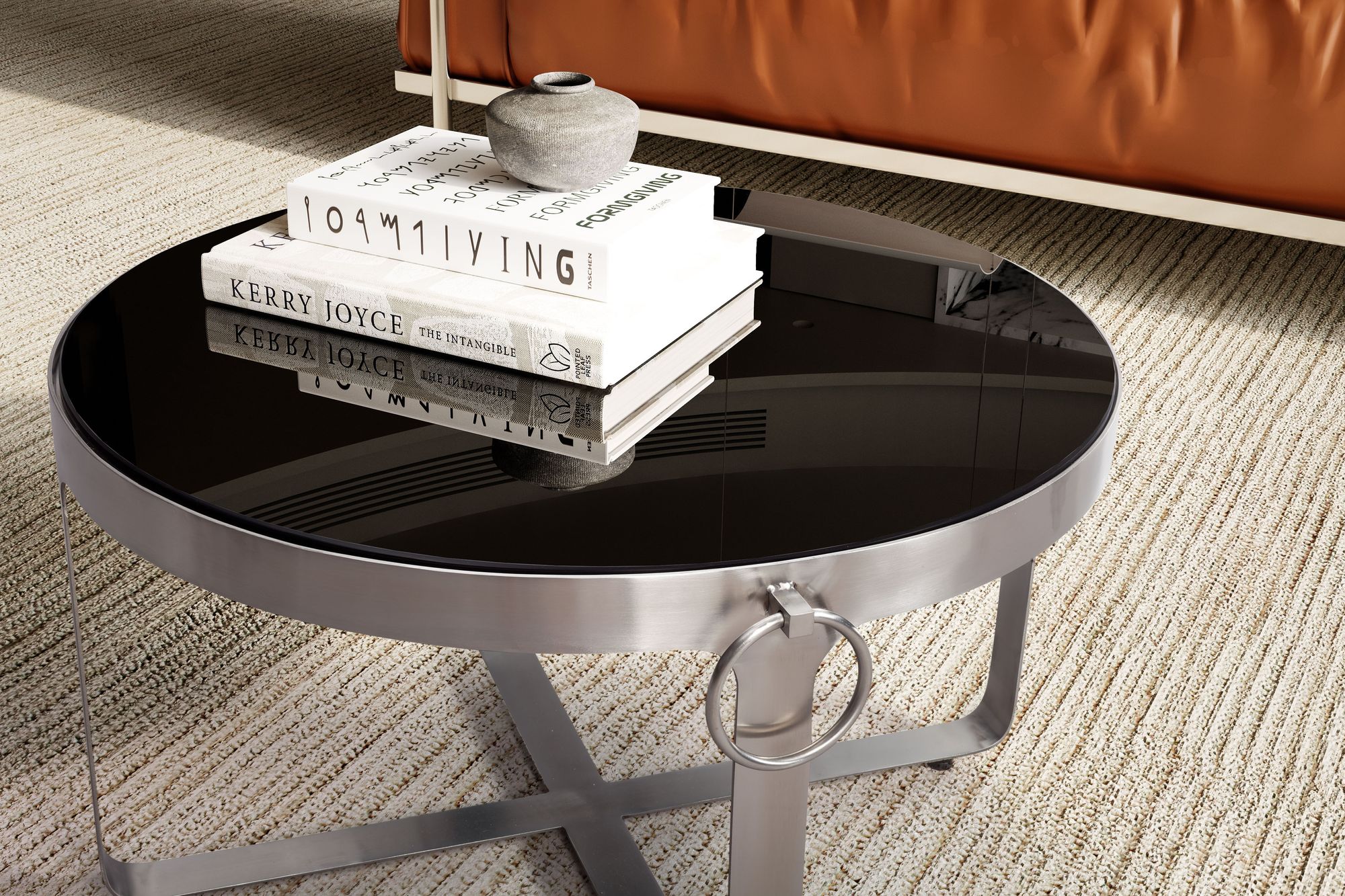Moderner runder Couchtisch mit schwarzer Sicherheitsglasplatte und glänzendem, silberfarbenem Metallgestell. Das robuste Gestell verfügt über zwei Griffe für leichtes Umstellen und passt perfekt ins Wohnzimmer.