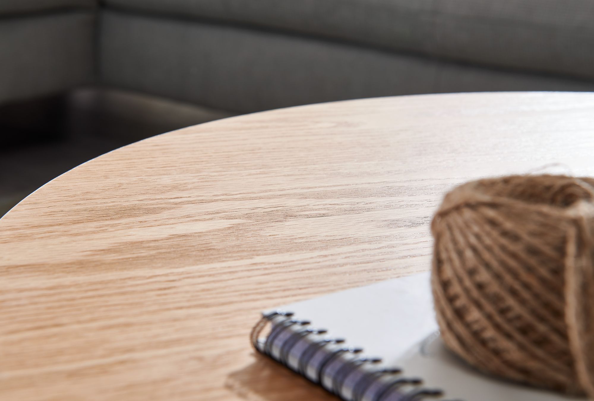 Entdecken Sie diesen Couchtisch mit schlichtem, modernem Design, das die Wärme von Holz mit der Stabilität von Metall verbindet. Die große, runde Tischplatte aus Eichenfurnier besticht durch eine ausdrucksstarke Maserung und wird von einem schwarz matt lackierten Stahlgestell getragen.